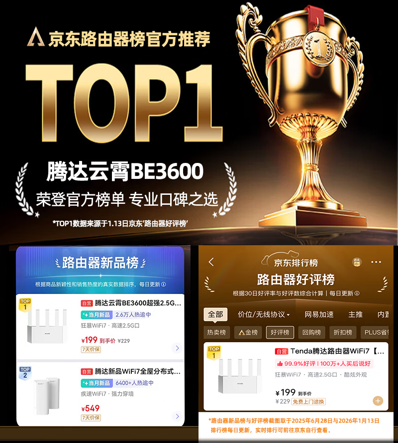 Tenda腾达路由器WiFi7【京东独家】无线千兆穿墙王信号增强家用全屋2.5g网口云霄BE3600放大器立式