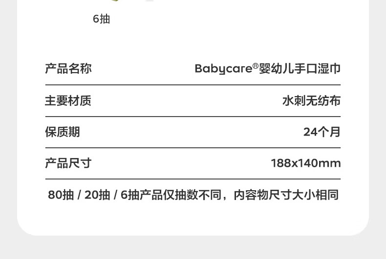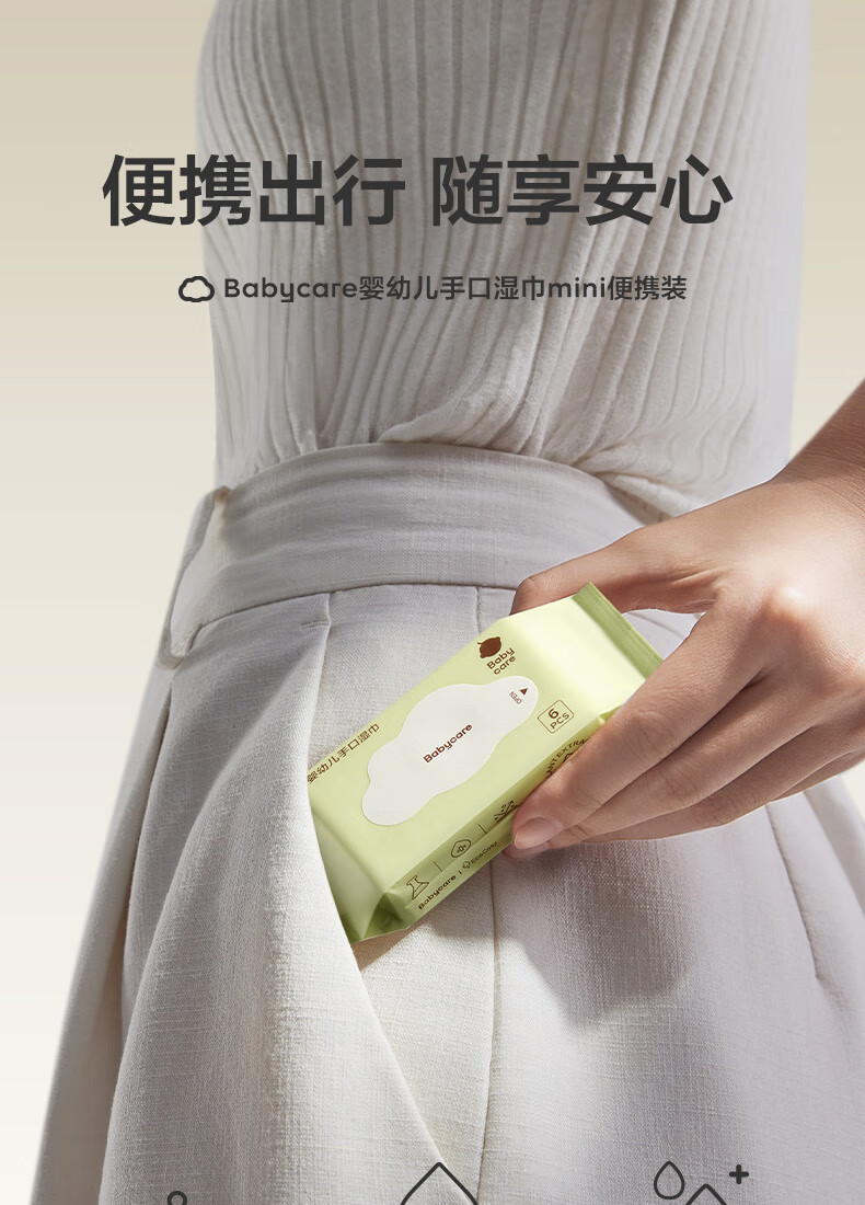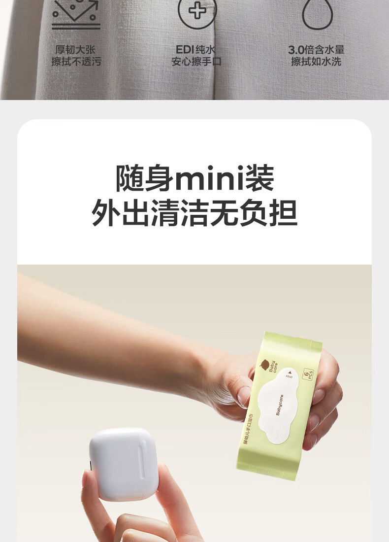 babycare婴儿手口湿巾加厚擦脸湿纸巾mini装便携出行3150绿盖湿巾6抽*6包