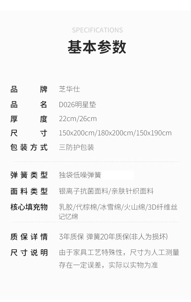 芝华仕床垫D026明星垫90%高纯度乳胶独袋弹簧席梦思家用1.8x2米软硬适中