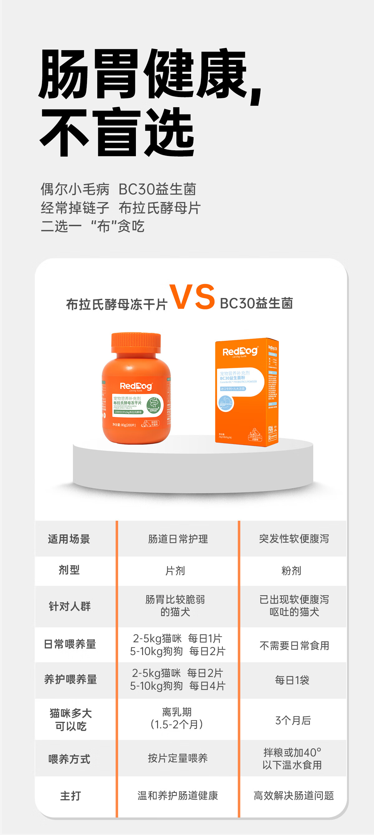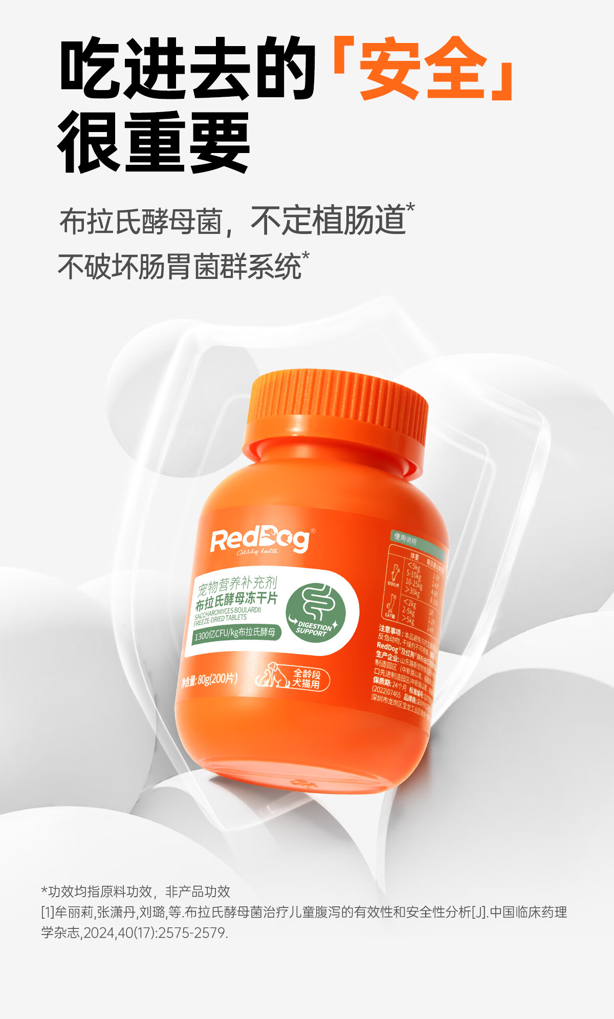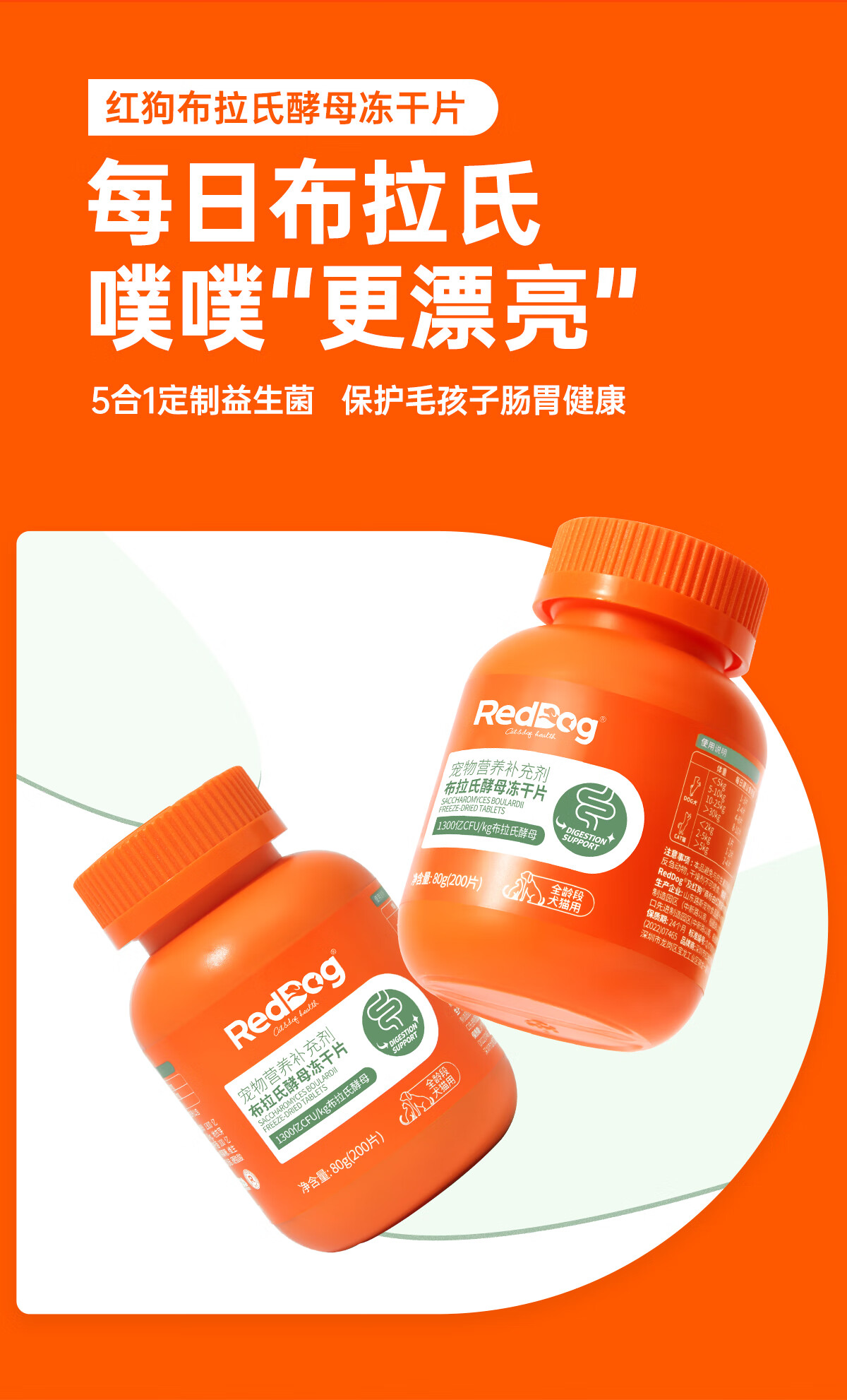 红狗(RedDog)【医院推荐】益生菌猫狗布拉氏冻干片肠胃宝化毛膏猫咪鱼油软骨素 布拉氏益生菌片 200片*2瓶