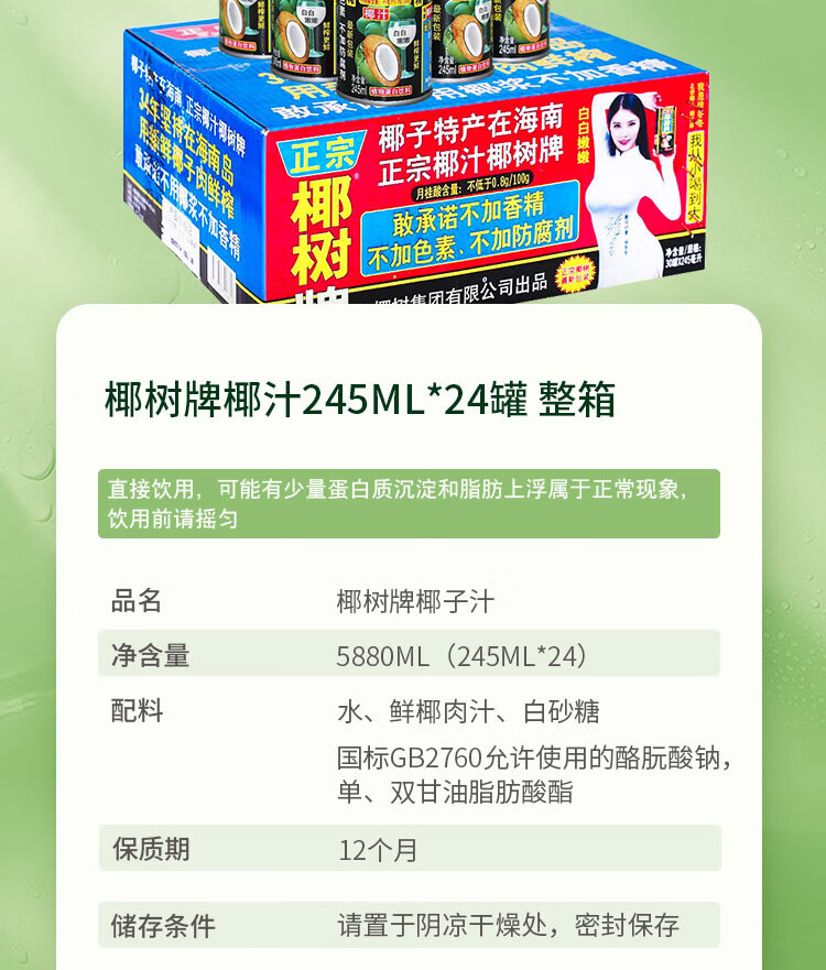 椰树牌正宗 椰子汁 245ml*24罐整箱装 植物蛋白饮料 年货节