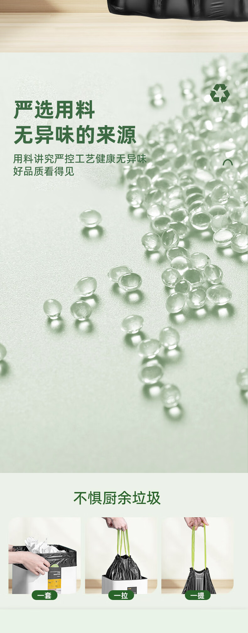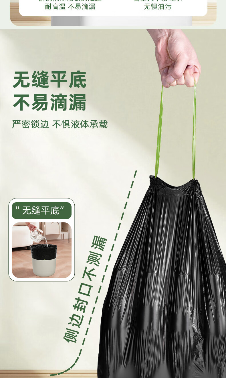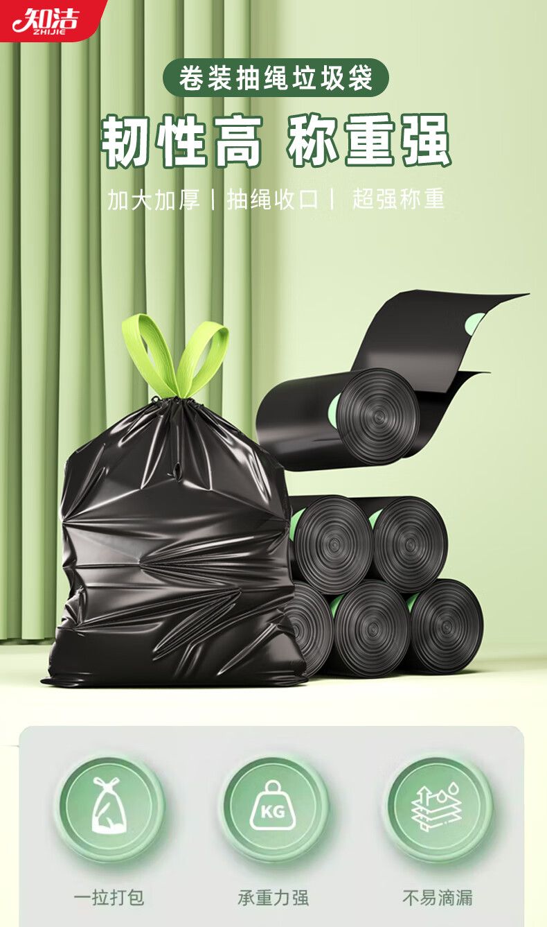 知洁抽绳垃圾袋黑绿45*50cm100只单面1.2丝家用手提穿绳免撕加厚塑料
