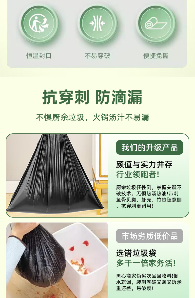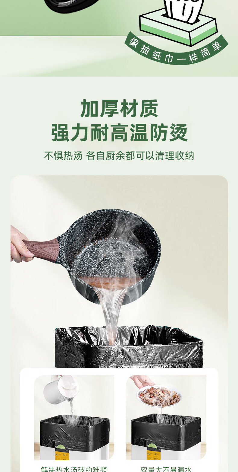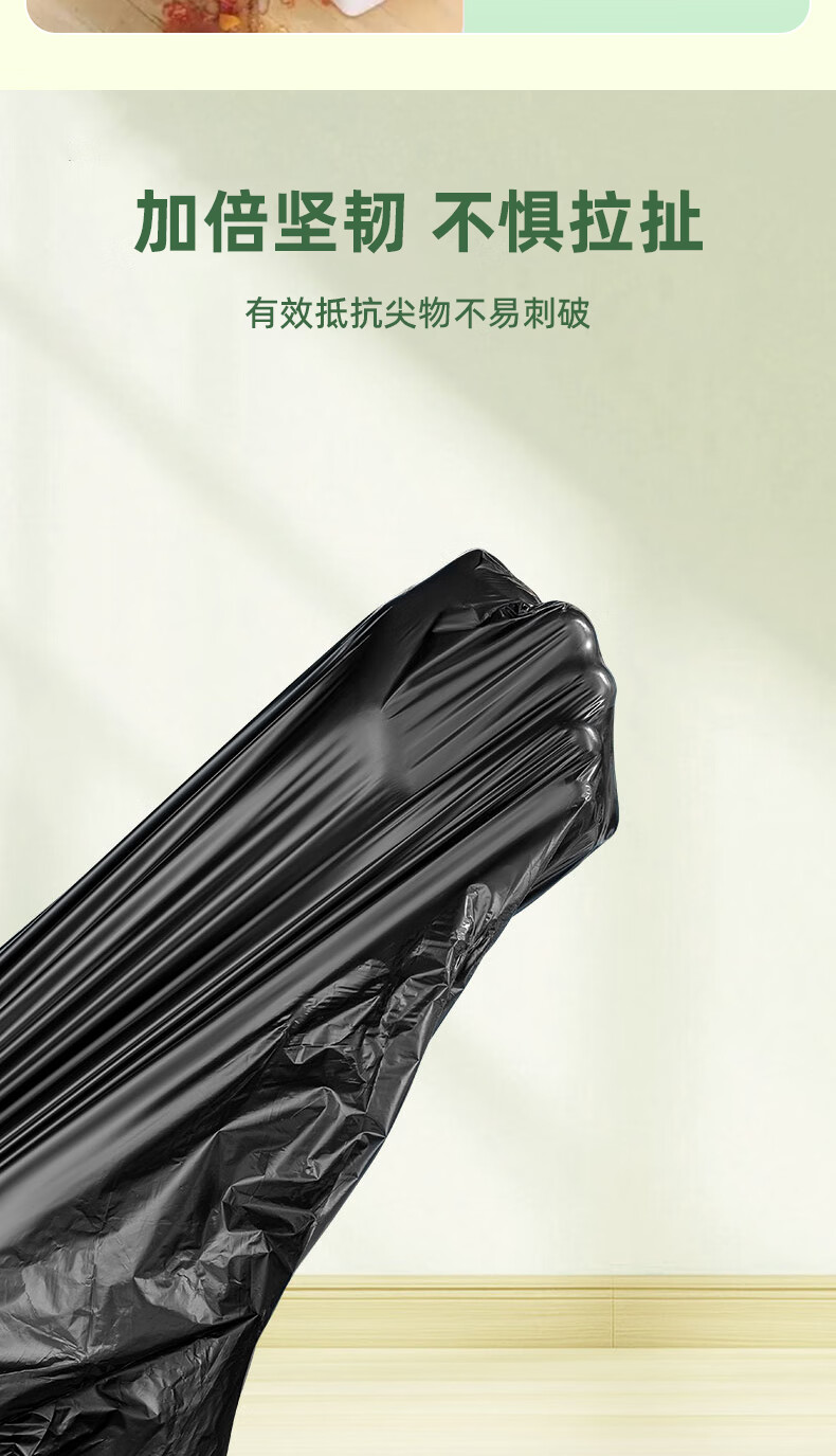知洁抽绳垃圾袋黑绿45*50cm100只单面1.2丝家用手提穿绳免撕加厚塑料
