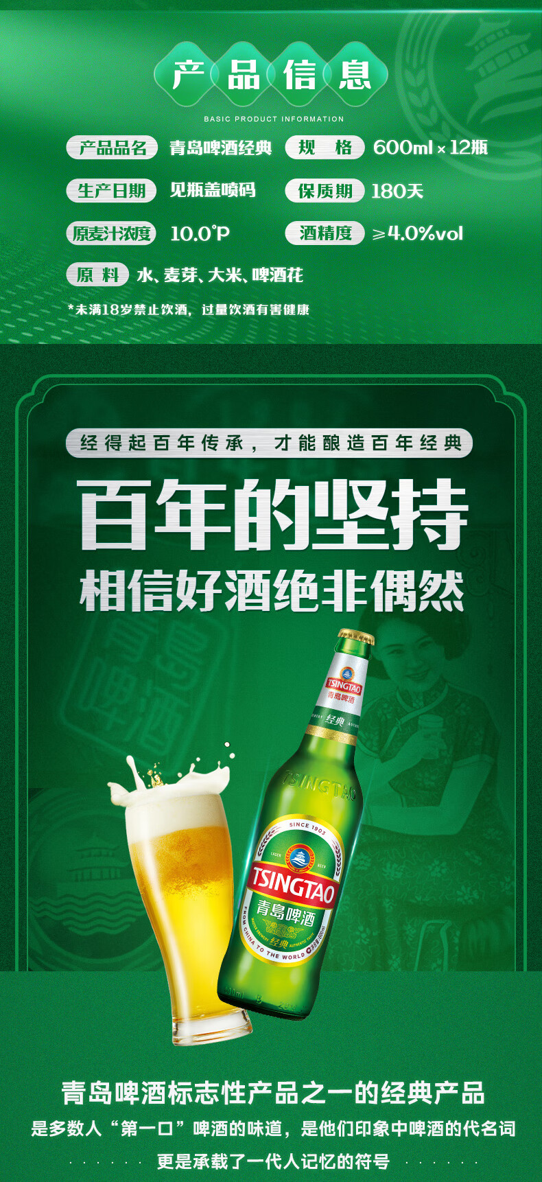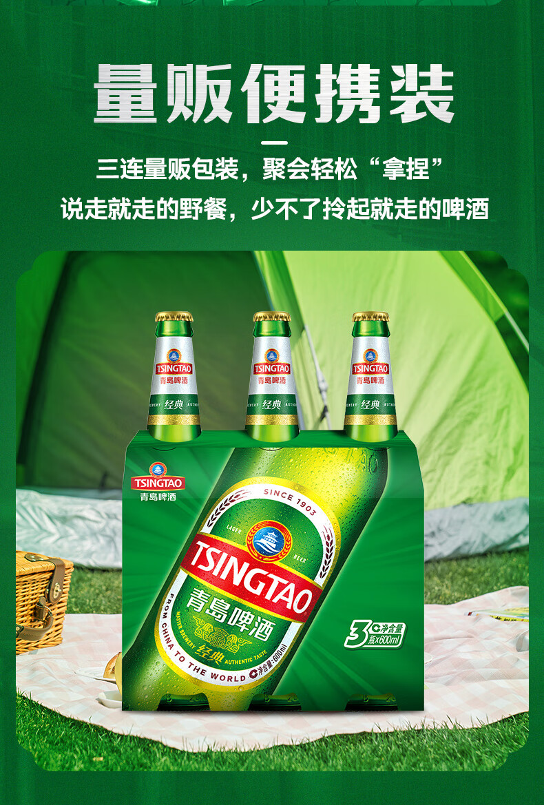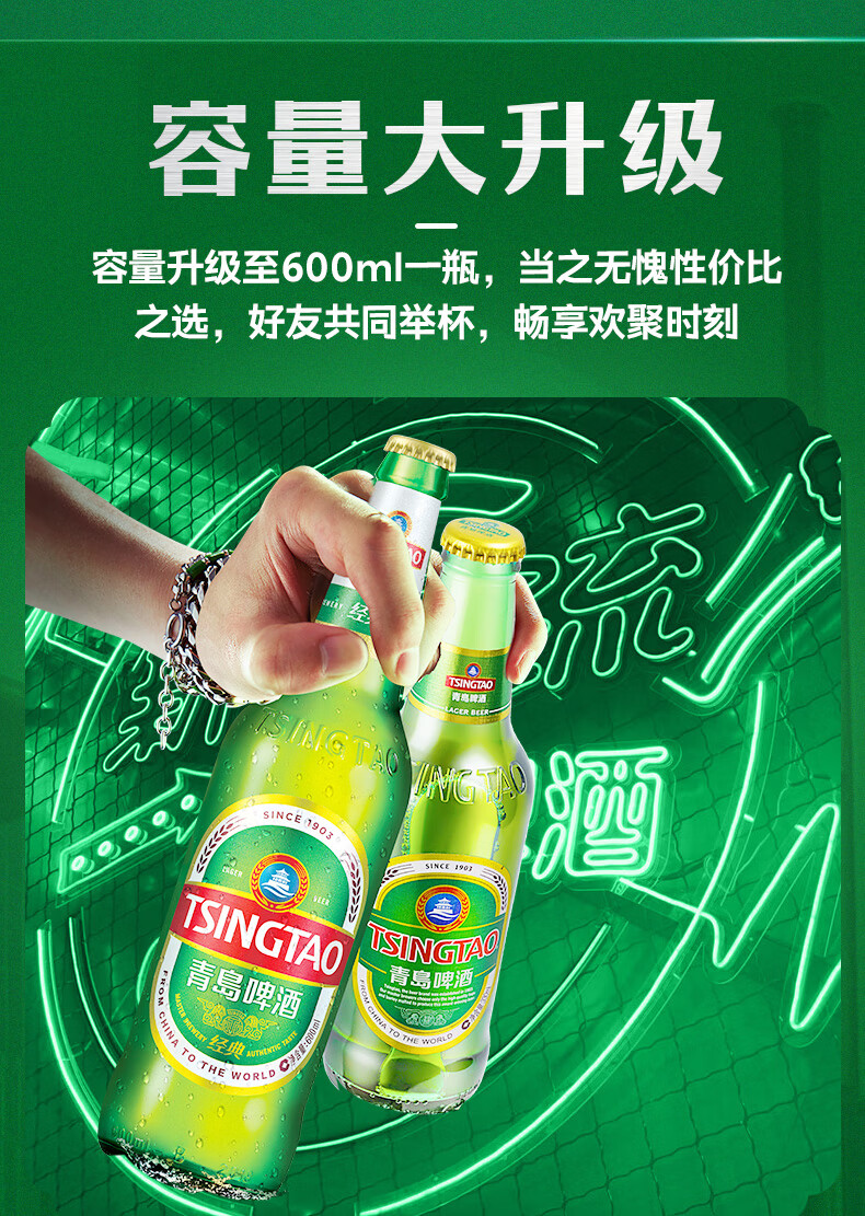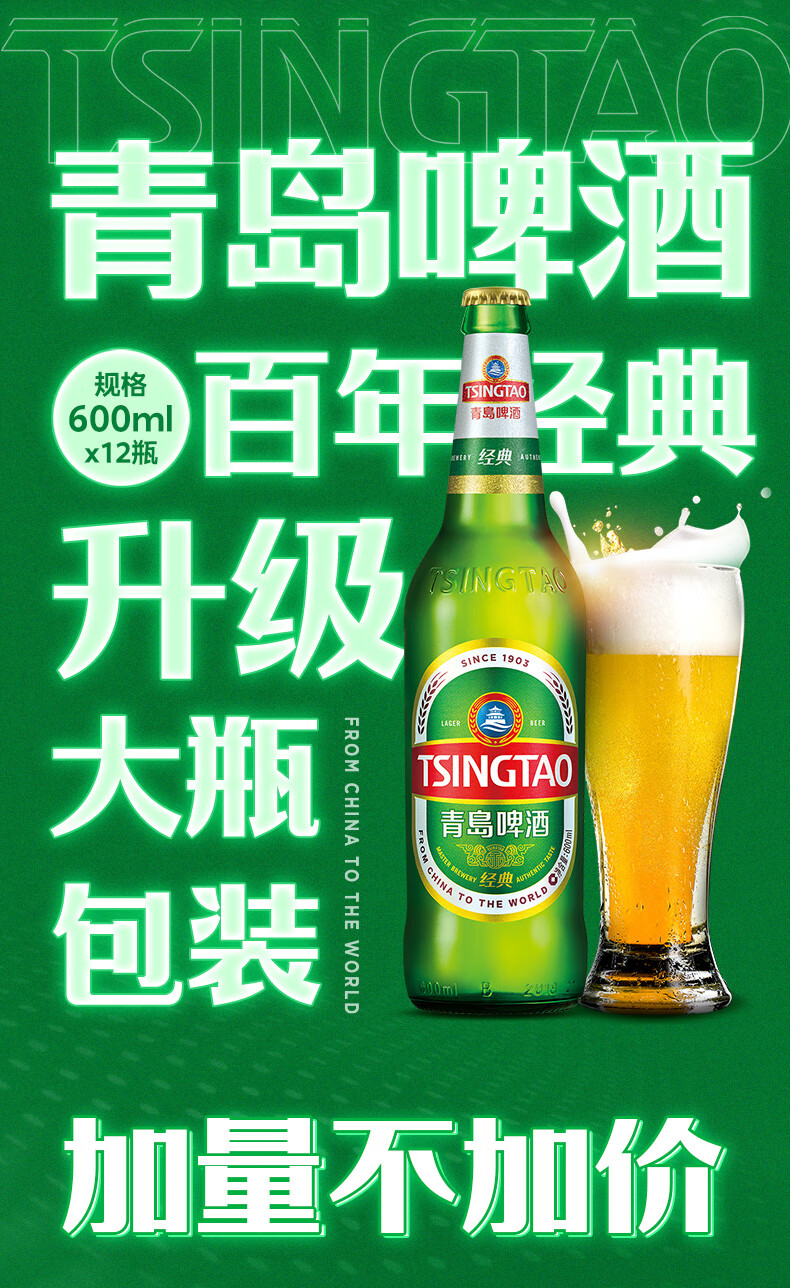 青岛啤酒(TsingTao)经典啤酒 600ml*12瓶 升级大容量 整箱装 年货送礼