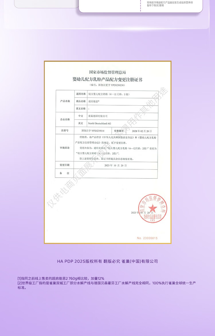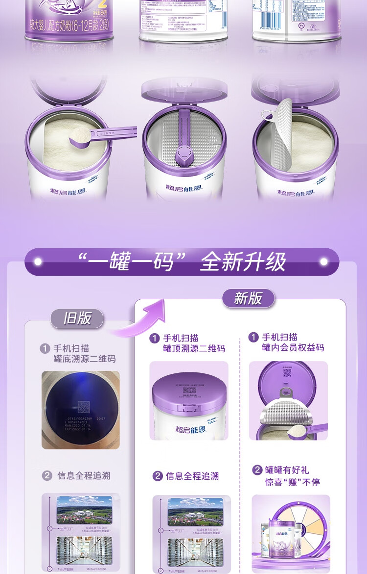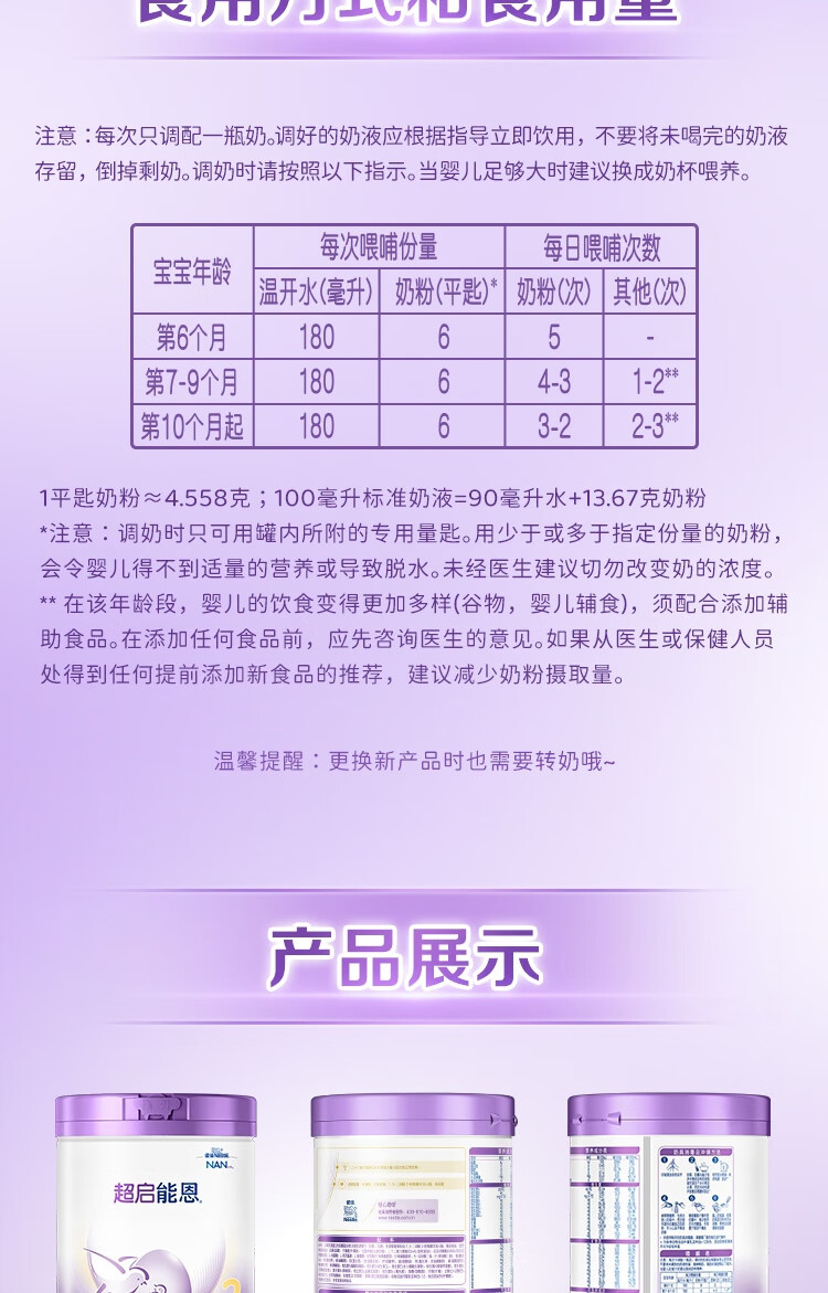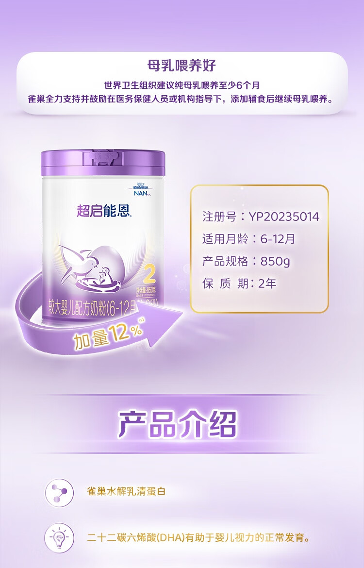 雀巢(Nestle)超启能恩2段 较大婴儿配方奶粉 3倍DHA 亲和OPO 6-12月龄适用850g