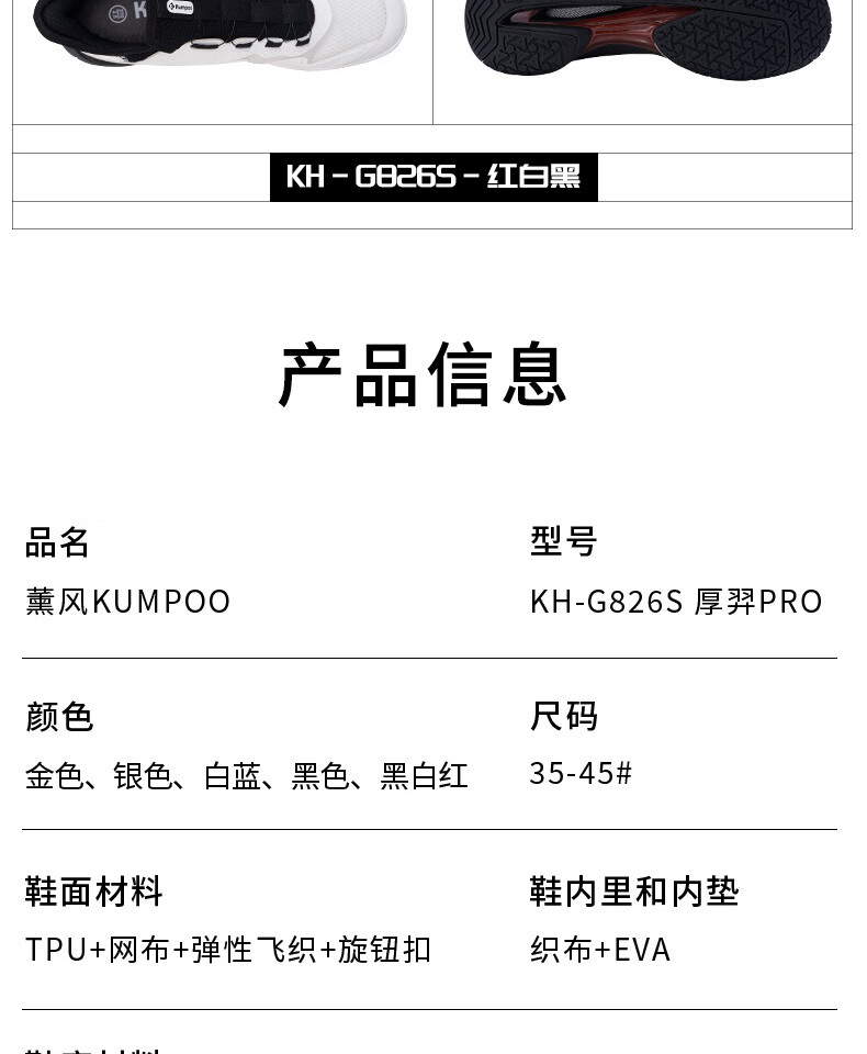 薰风(KUMPOO)厚羿PRO羽毛球鞋G826S 透气减震防滑熏风男女款专业运动鞋 厚羿 KH-G826 白/红/黑 42