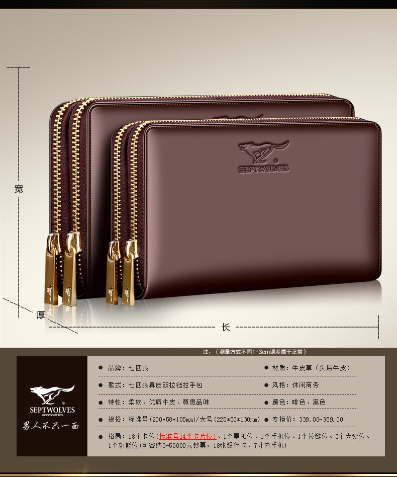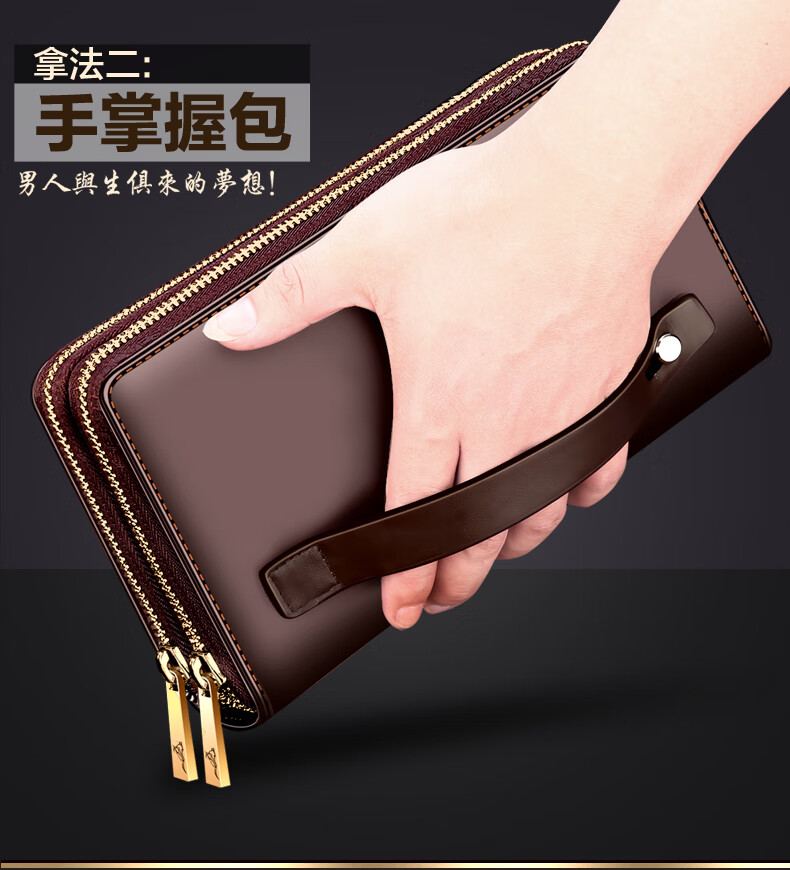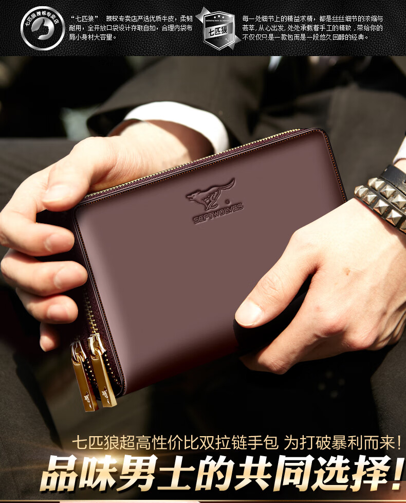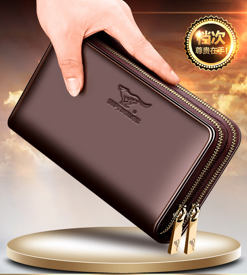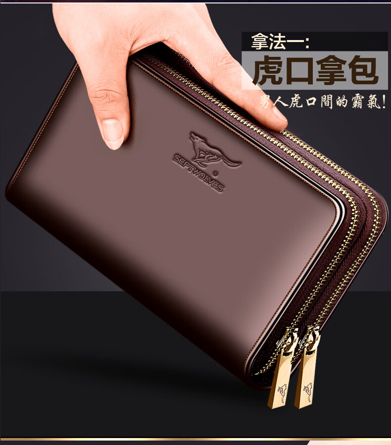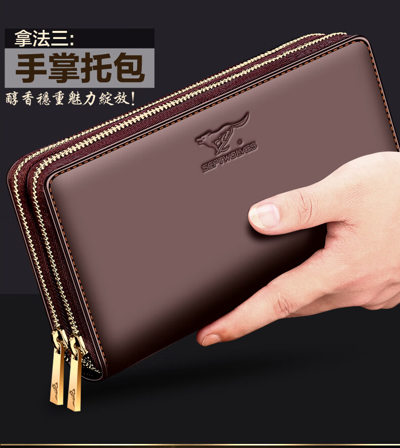 七匹狼手拿包男真皮男包双拉链大容量钱包大牌手包男士潮皮包父亲节礼物 咖色加大号