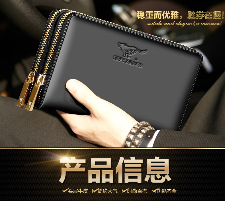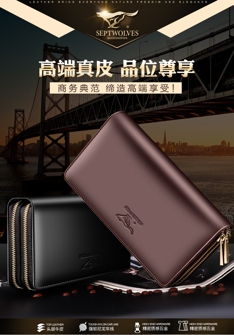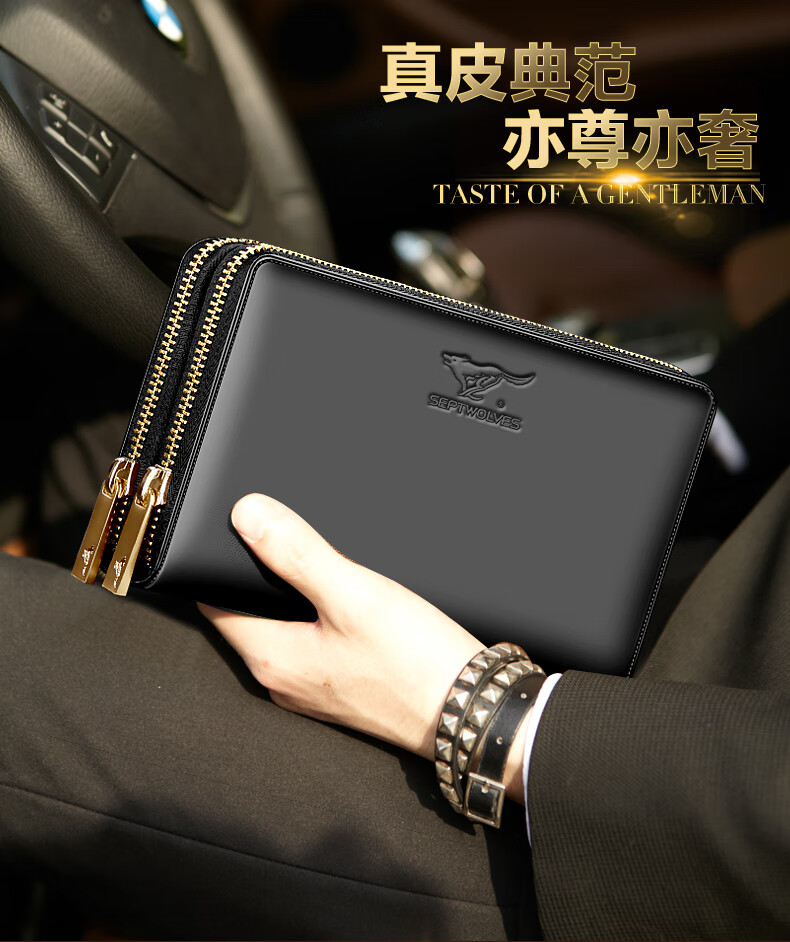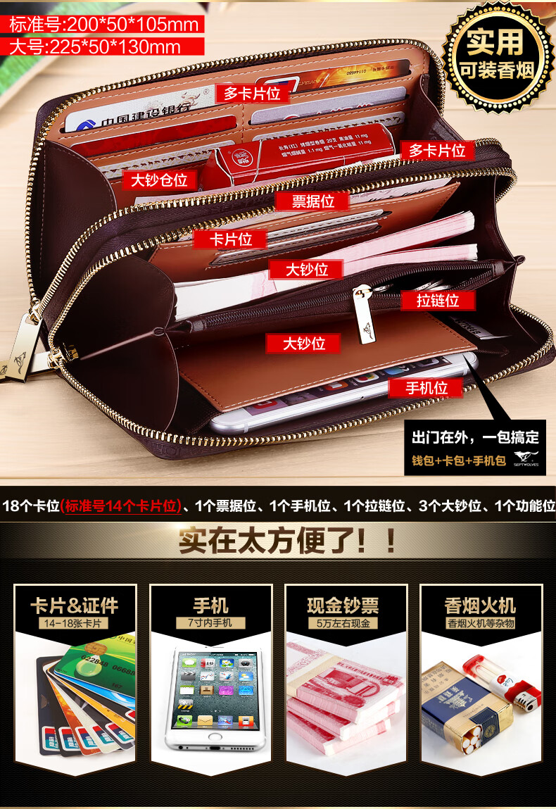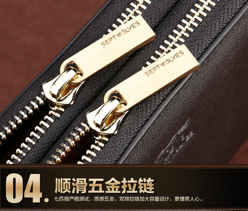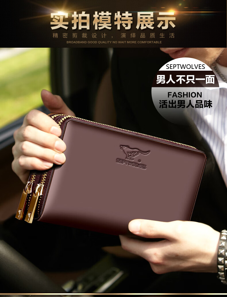 七匹狼手拿包男真皮男包双拉链大容量钱包大牌手包男士潮皮包父亲节礼物 咖色加大号