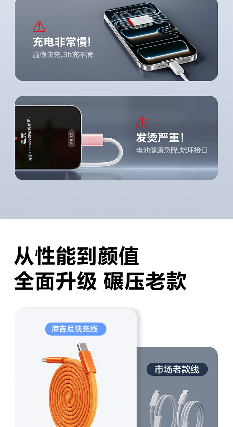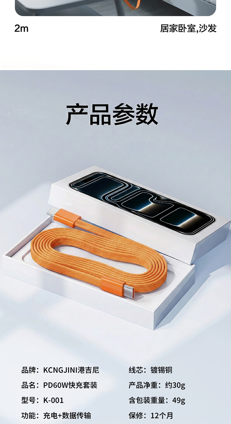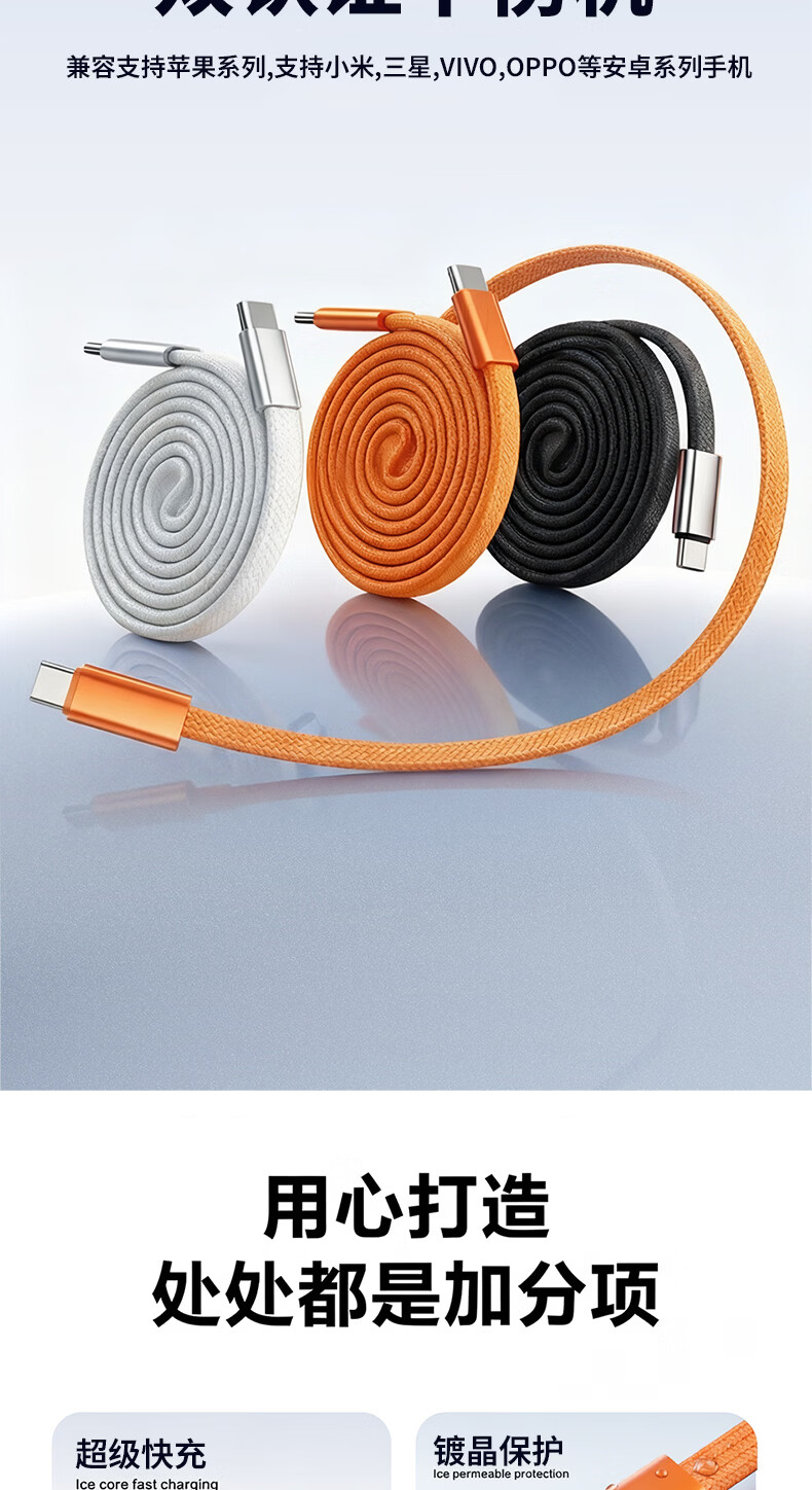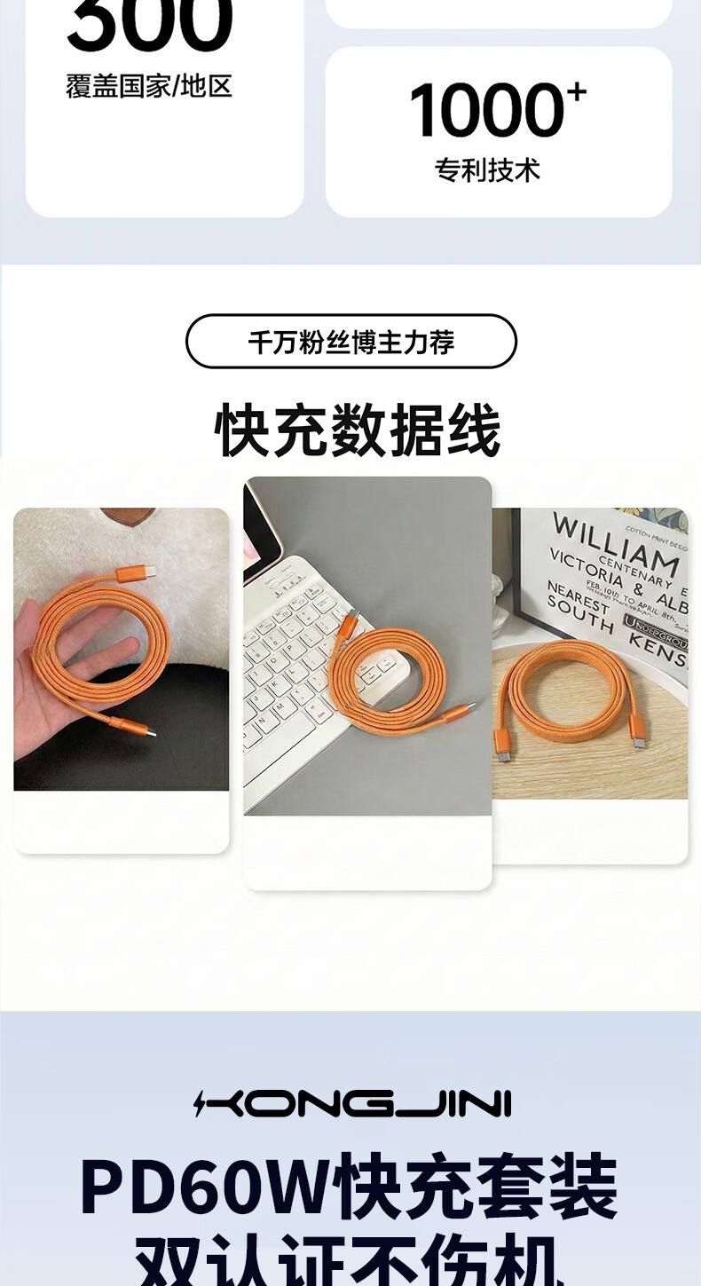 港吉尼(KONGJINI)港吉尼超级快充数据线双Type-C编织PD快充线60W升级车载可用低温闪充赠送手机支架 云雾白双type-c超级快充数据线两条装再送一条