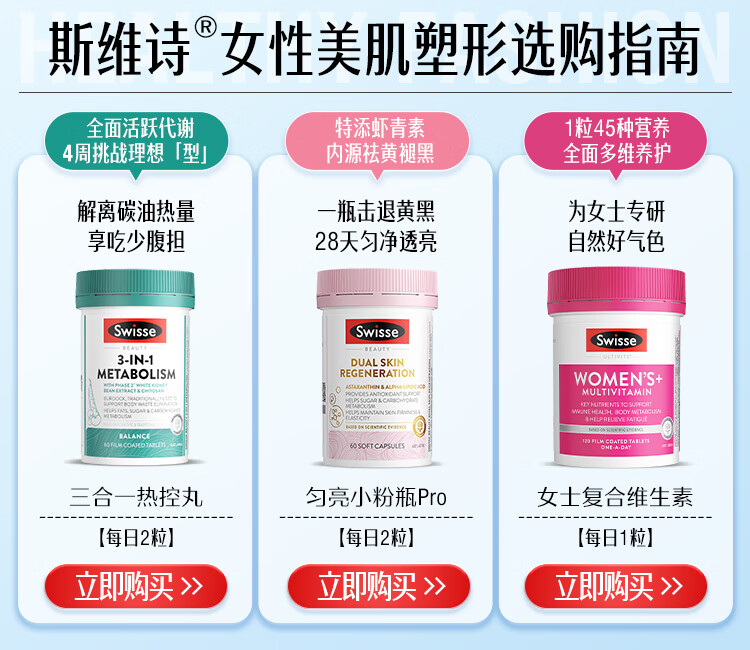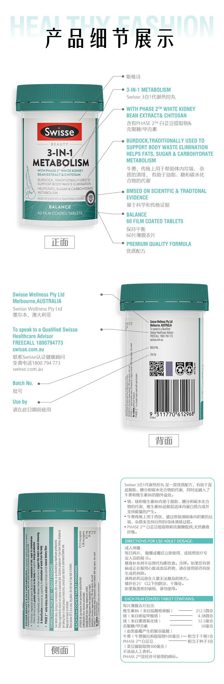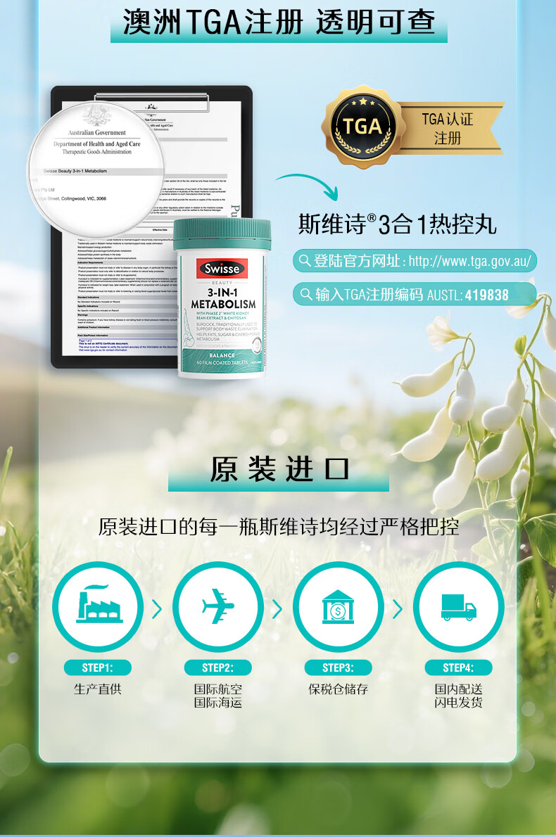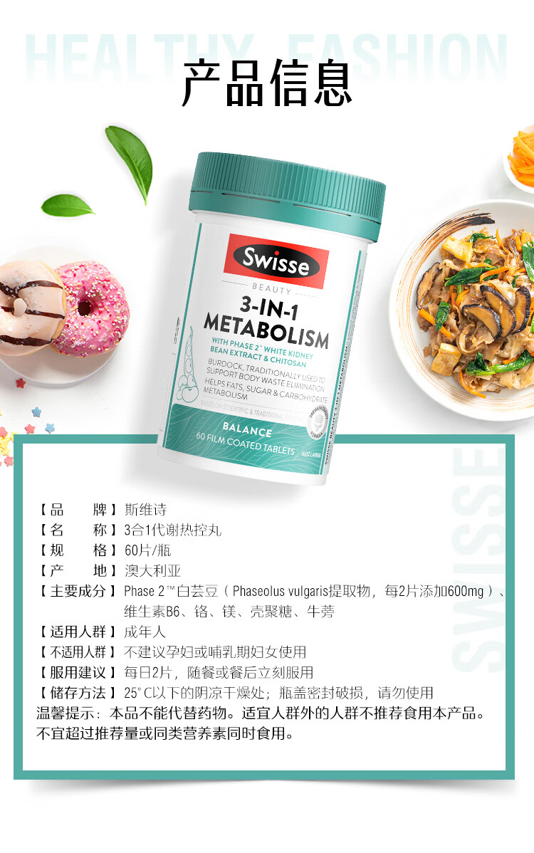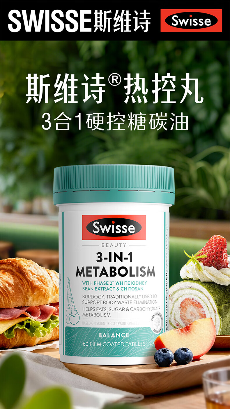 Swisse斯维诗三合一代谢热控丸 白芸豆 膳食纤维铬镁控热量排油阻碳60粒