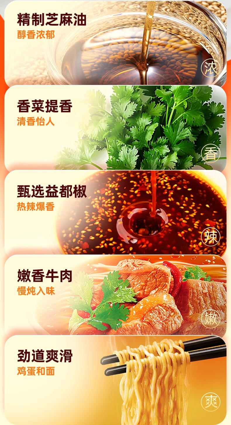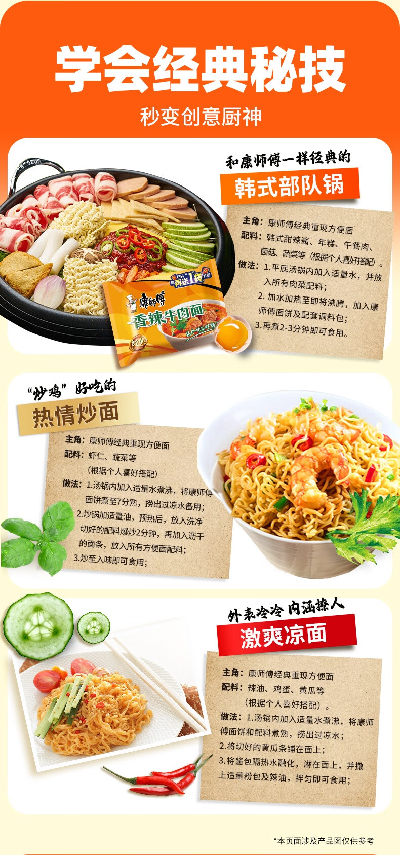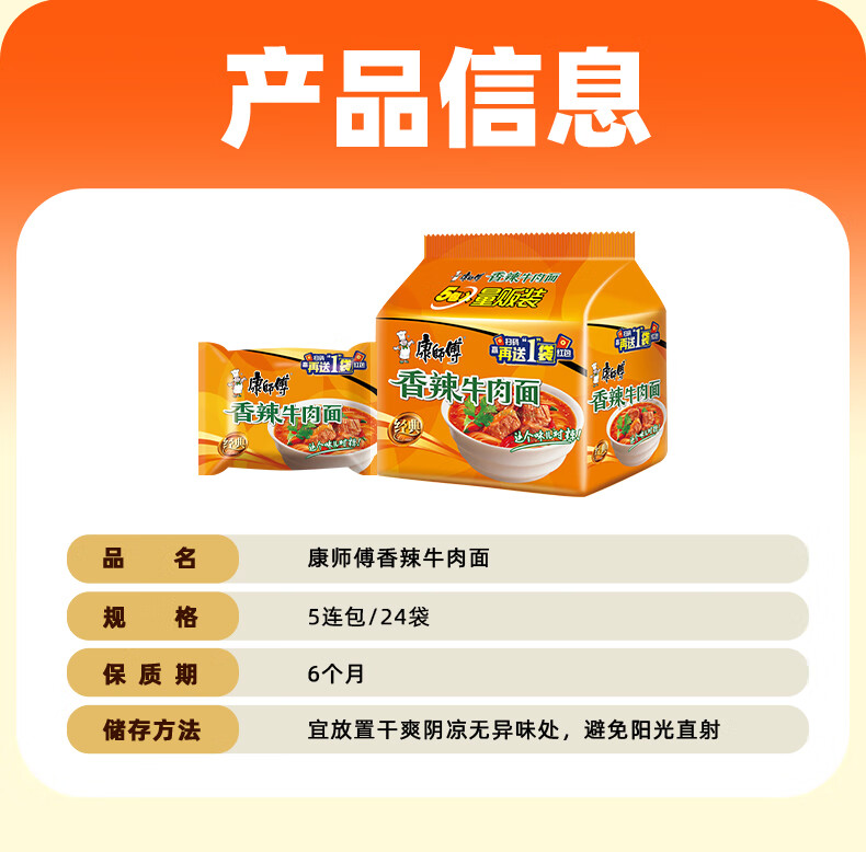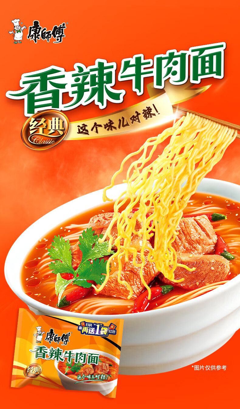 康师傅 方便面 经典香辣牛肉袋面104g*24袋 泡面整箱速食 方便食品