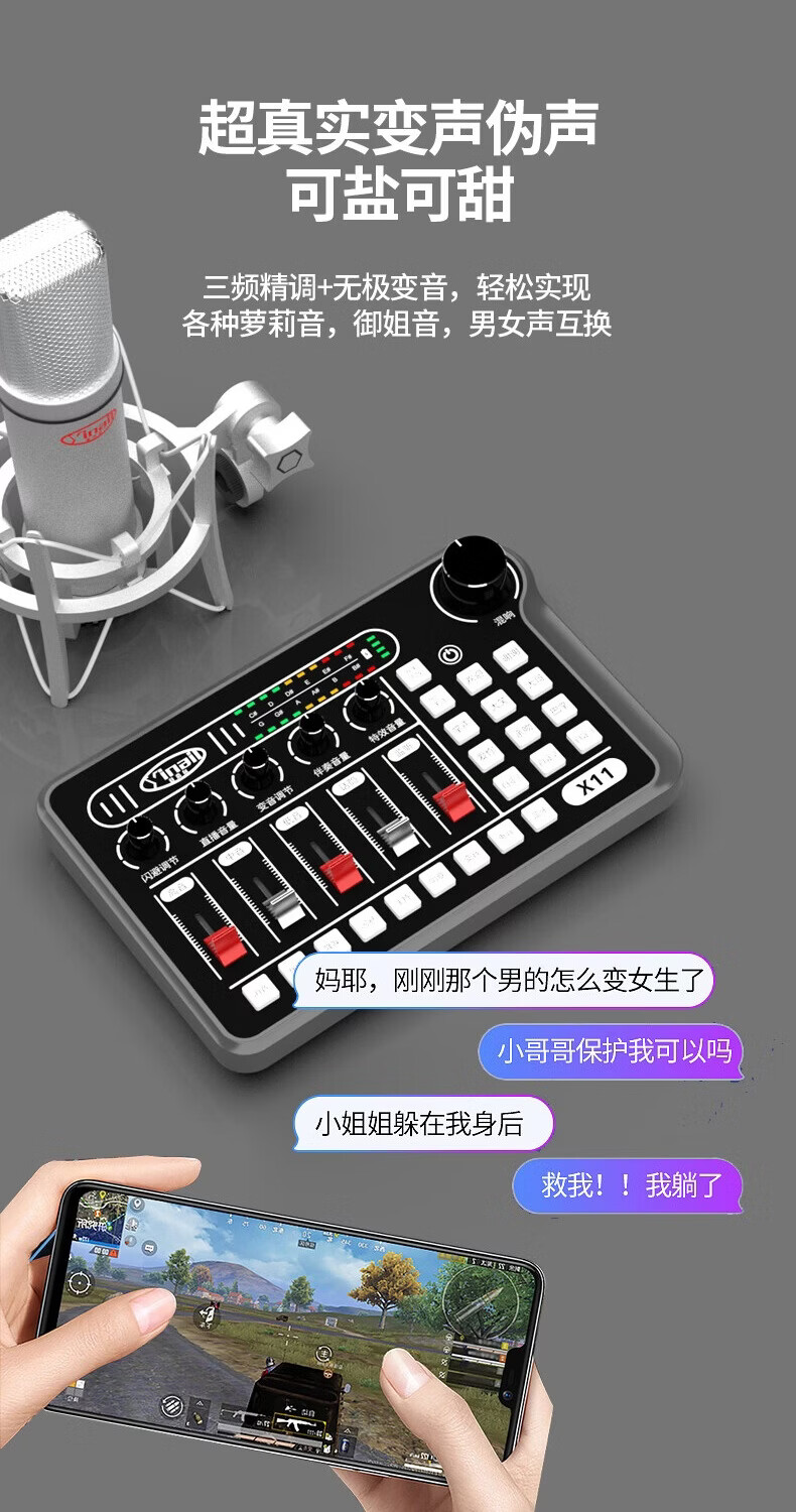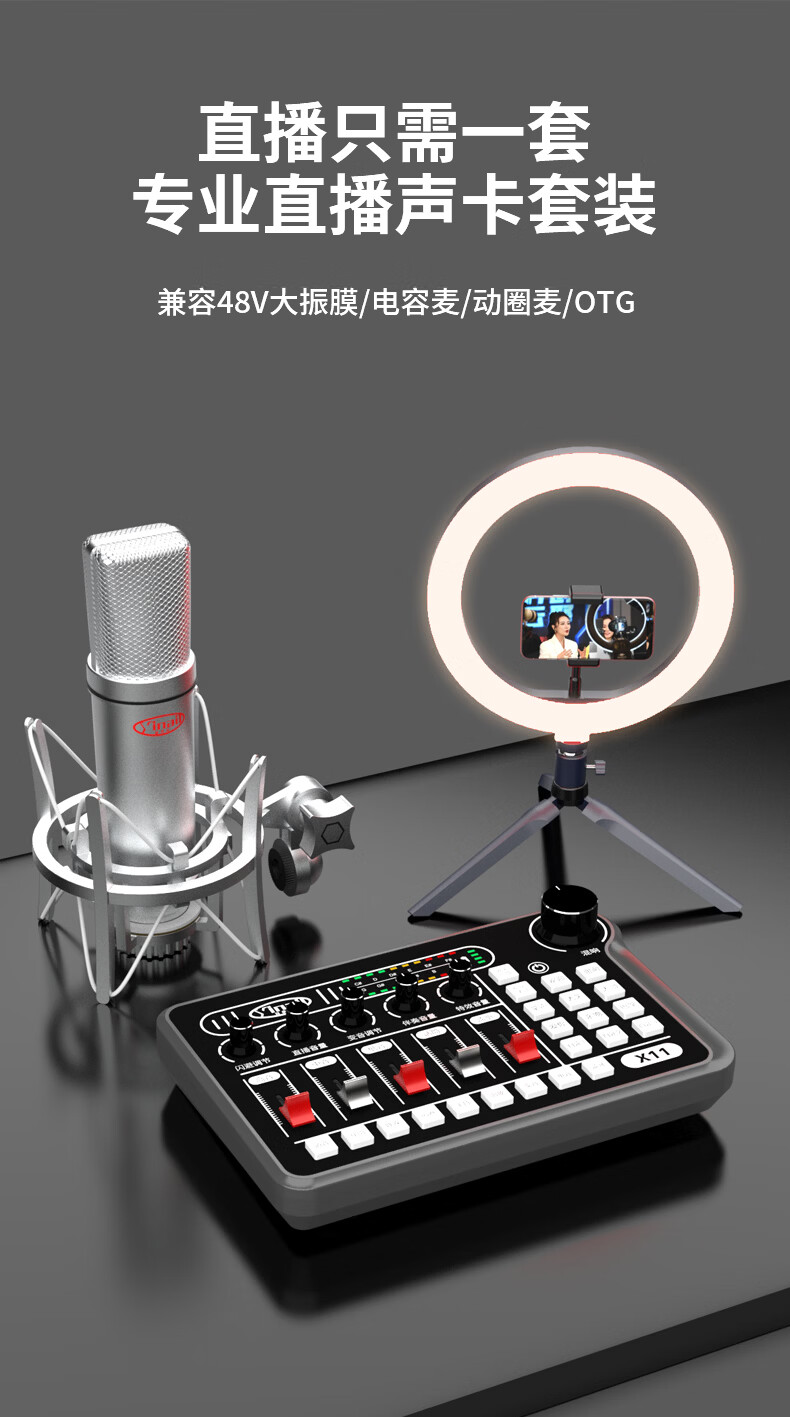 音奈尔(yinail)网红专业外置声卡直播设备48V麦克风一套调音台室内台式电脑录音无线耳机户外手机K歌游戏变音 音奈尔X11+988有线高端电容麦克风