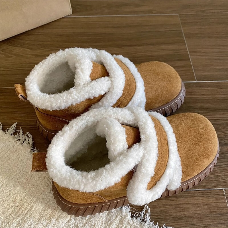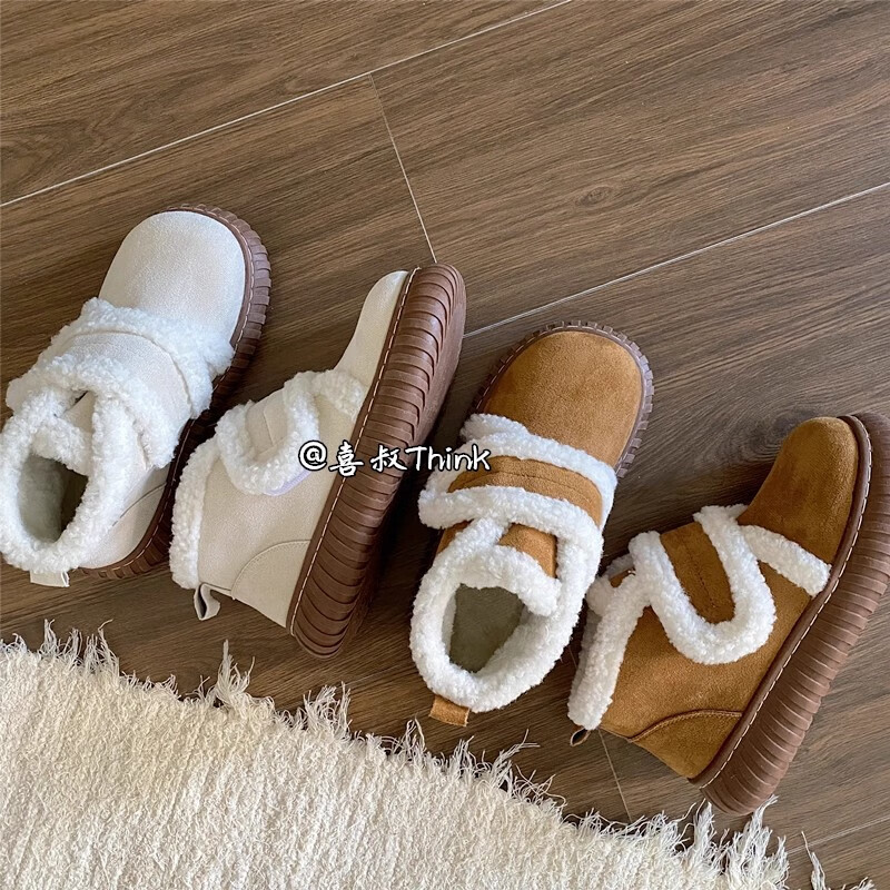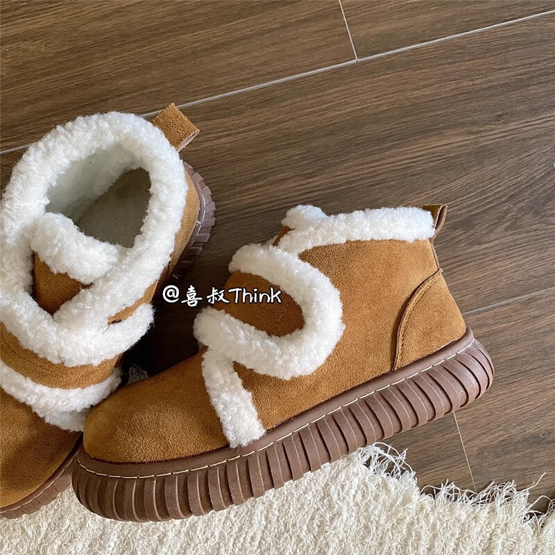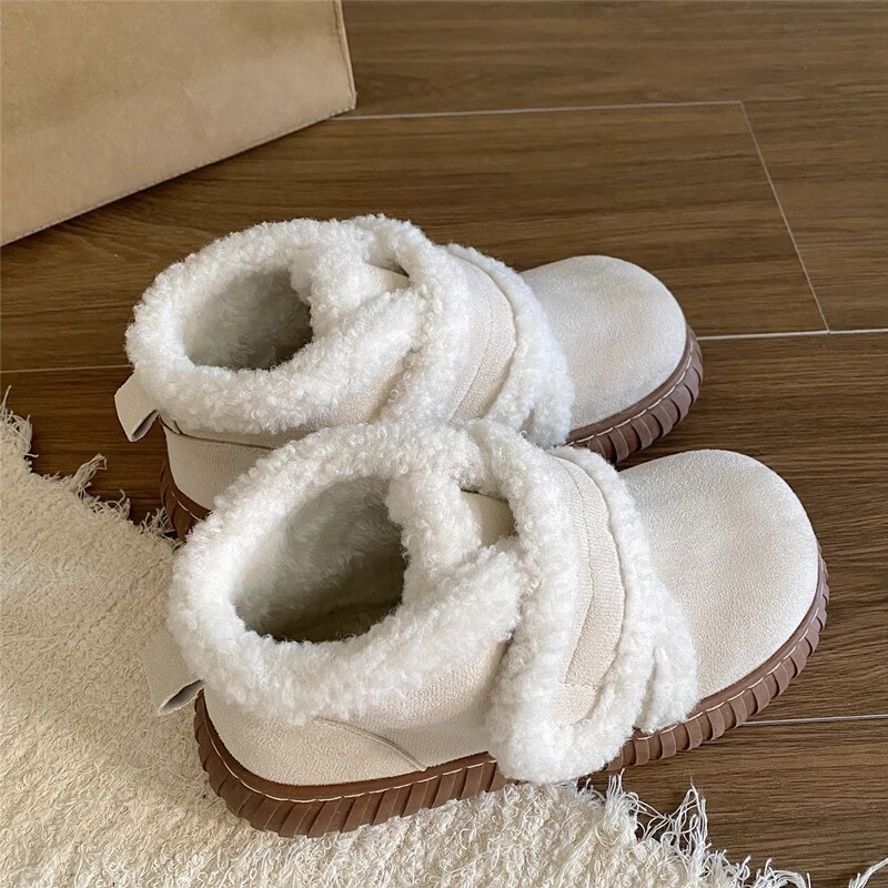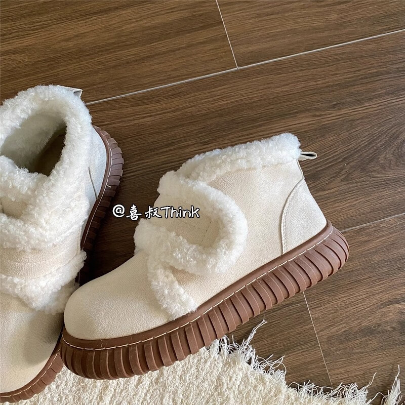 稻草人(MEXICAN)保暖厚底雪地靴女2026秋冬新款加绒加厚防滑皮毛一体东北短筒棉鞋 米白色 40