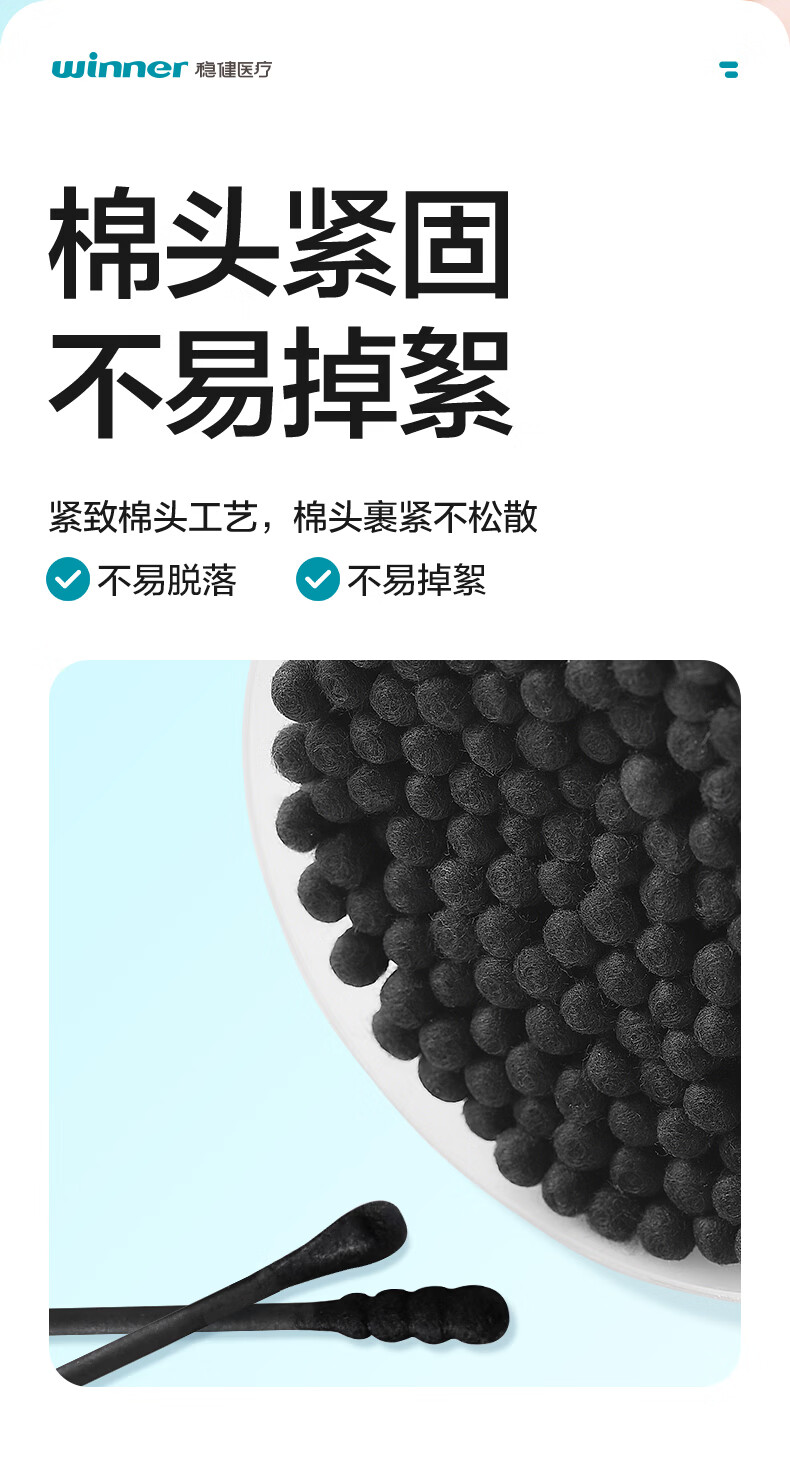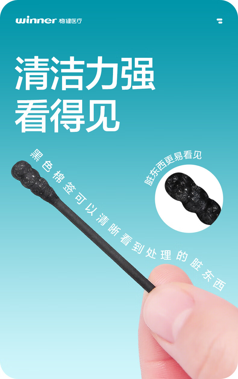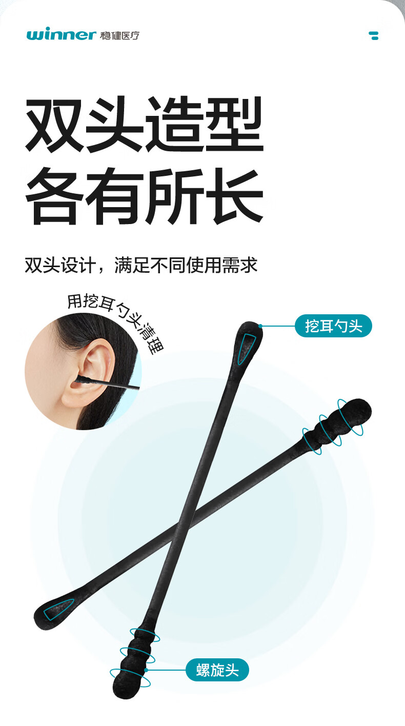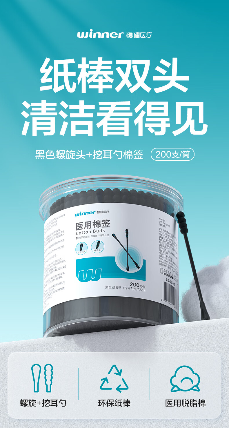 稳健医用棉签黑色双头耳勺棉棒200支掏耳朵化妆棉签螺旋头清洁棉棒