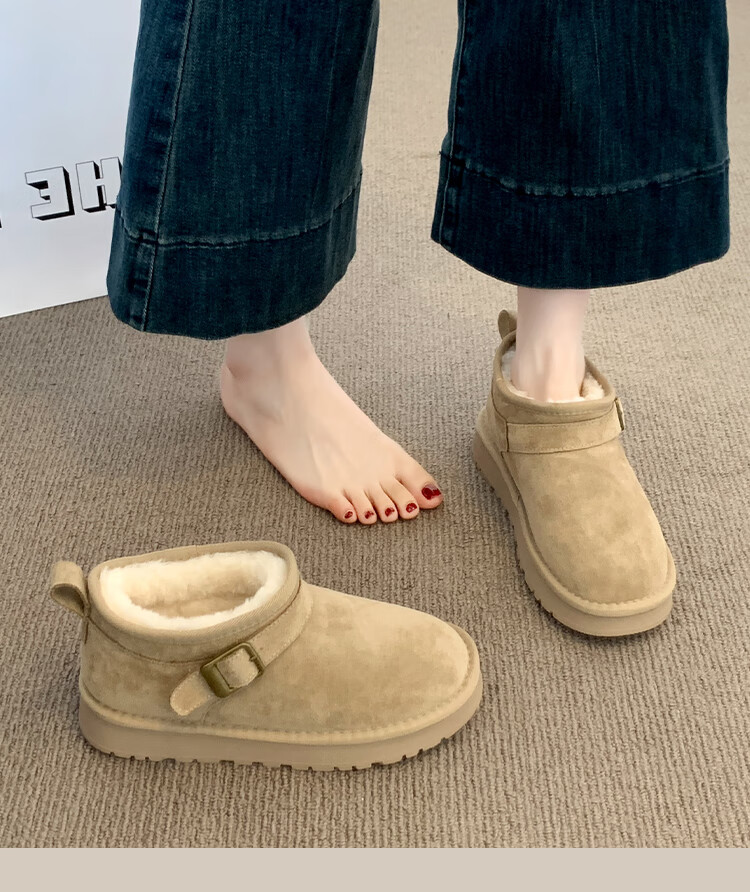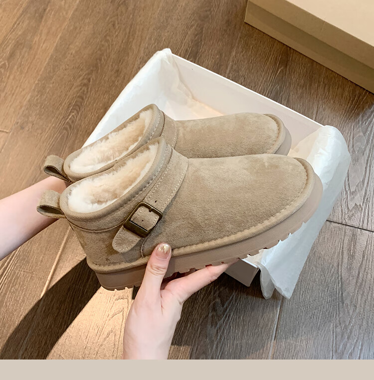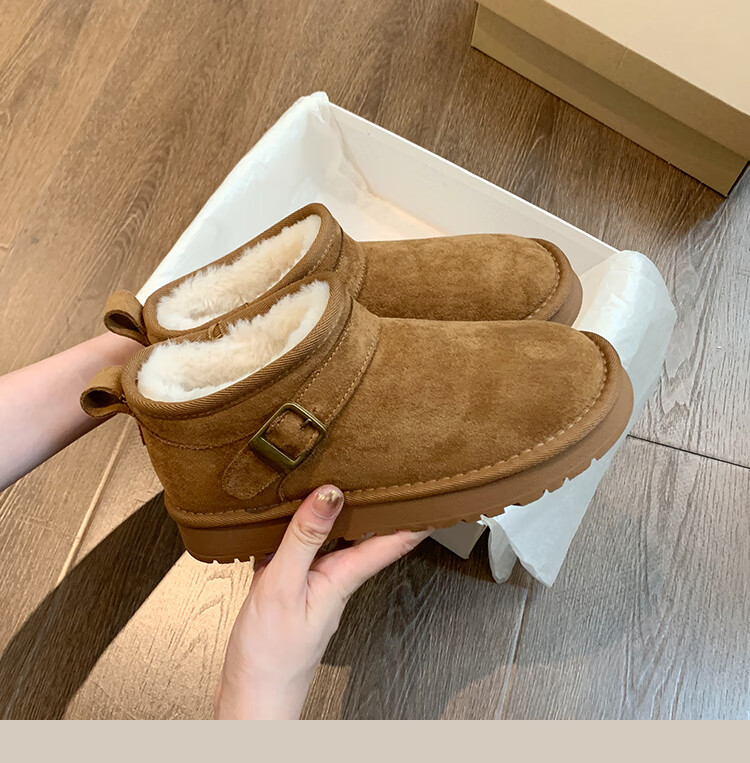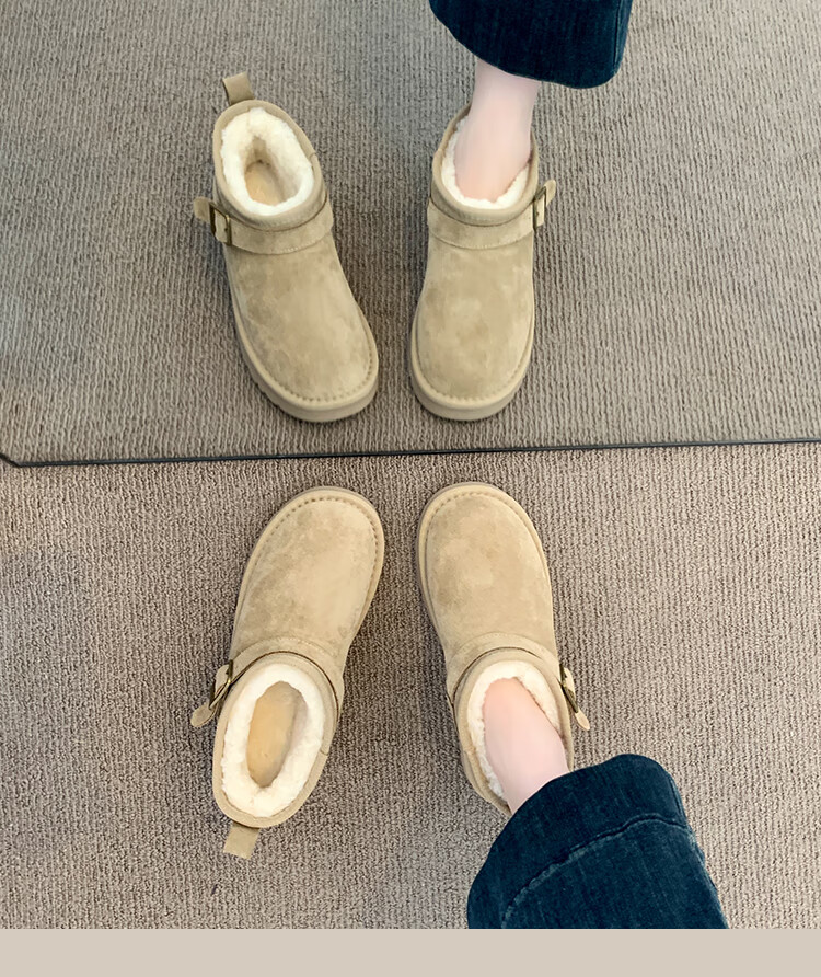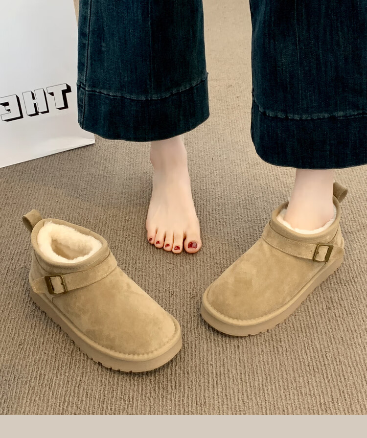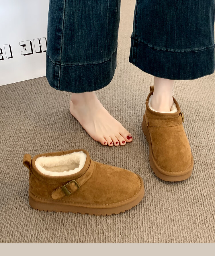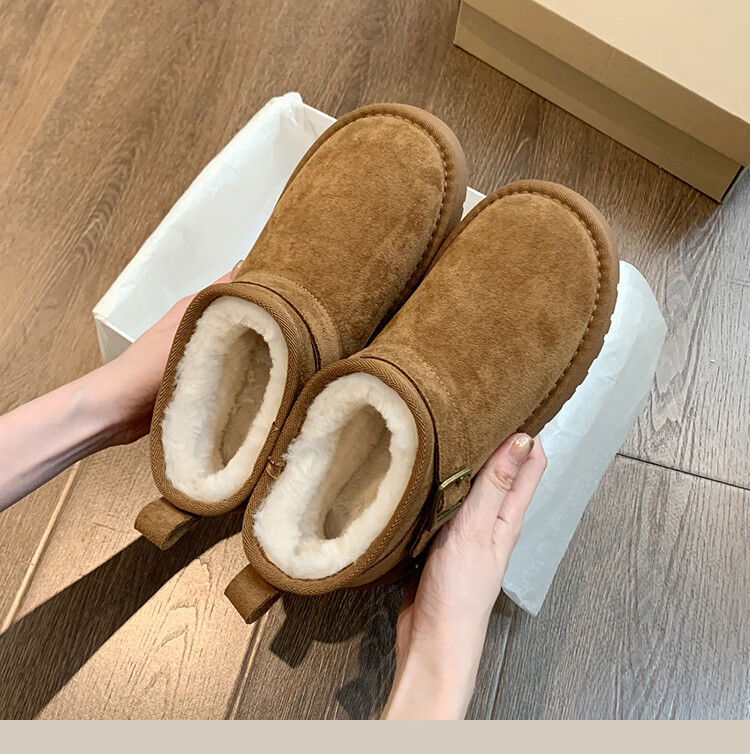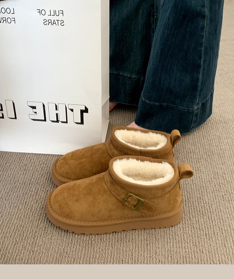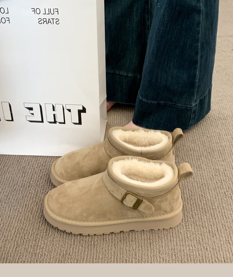 稻草人(MEXICAN)厚底勃肯鞋皮毛一体雪地靴女冬2026新款加绒短筒棉靴东北大棉鞋子 驼色【专柜版】店主推荐95%买家选择 35