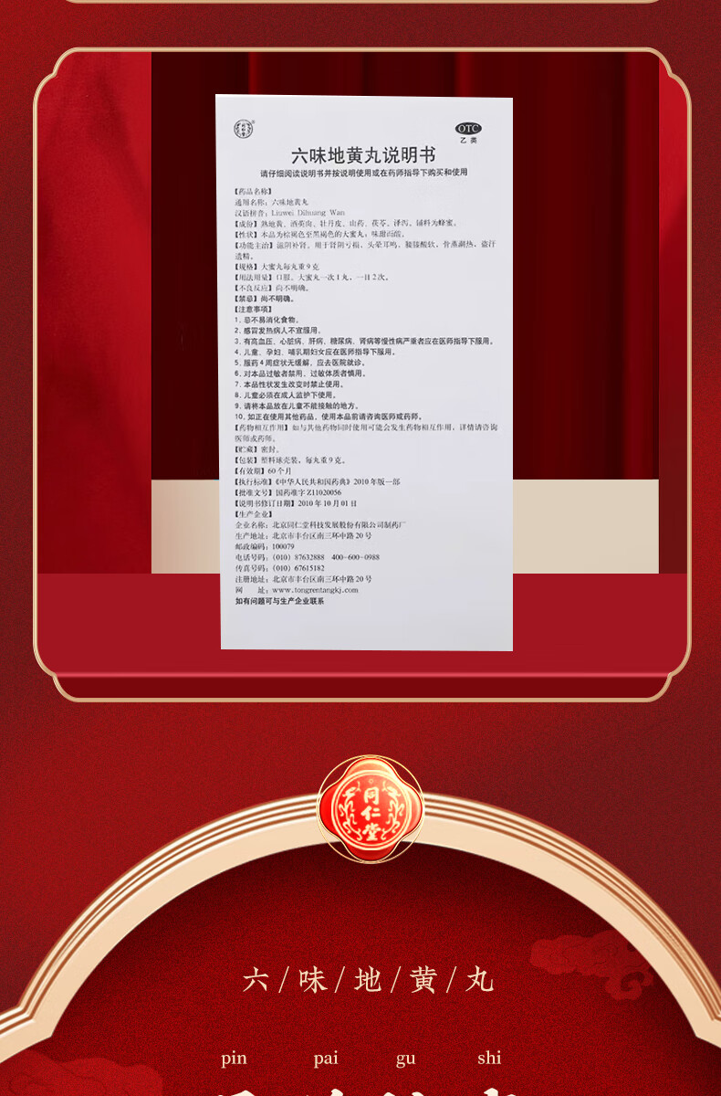 北京同仁堂 六味地黄丸 大蜜丸 9g*10丸 滋阴补肾 用于肾阴亏损 头晕耳鸣 腰膝酸软 骨蒸潮热 盗汗遗精