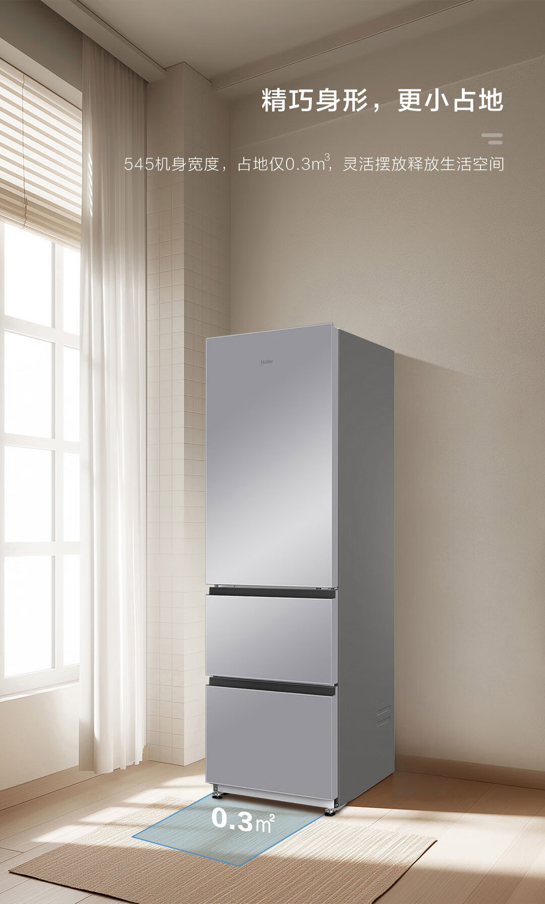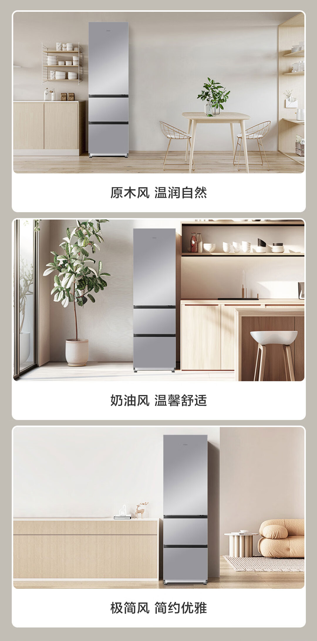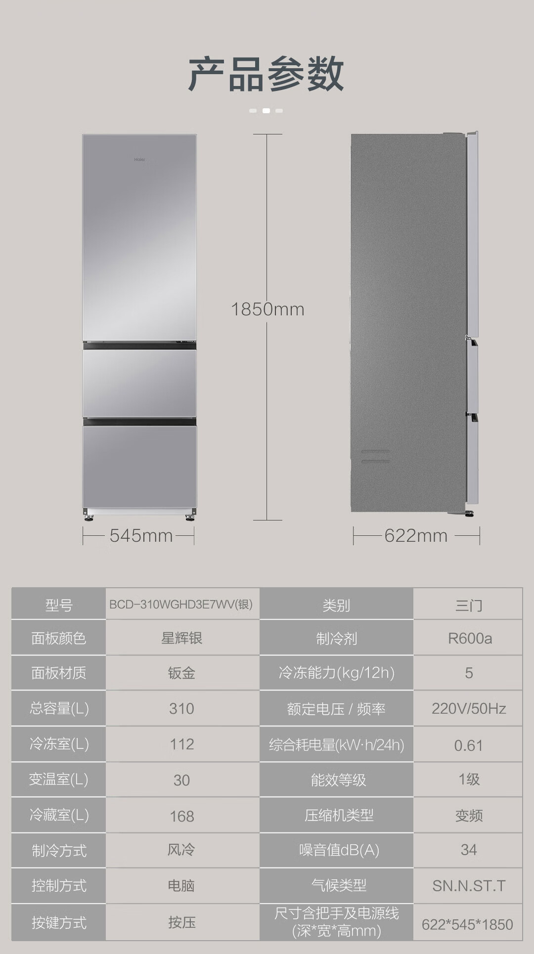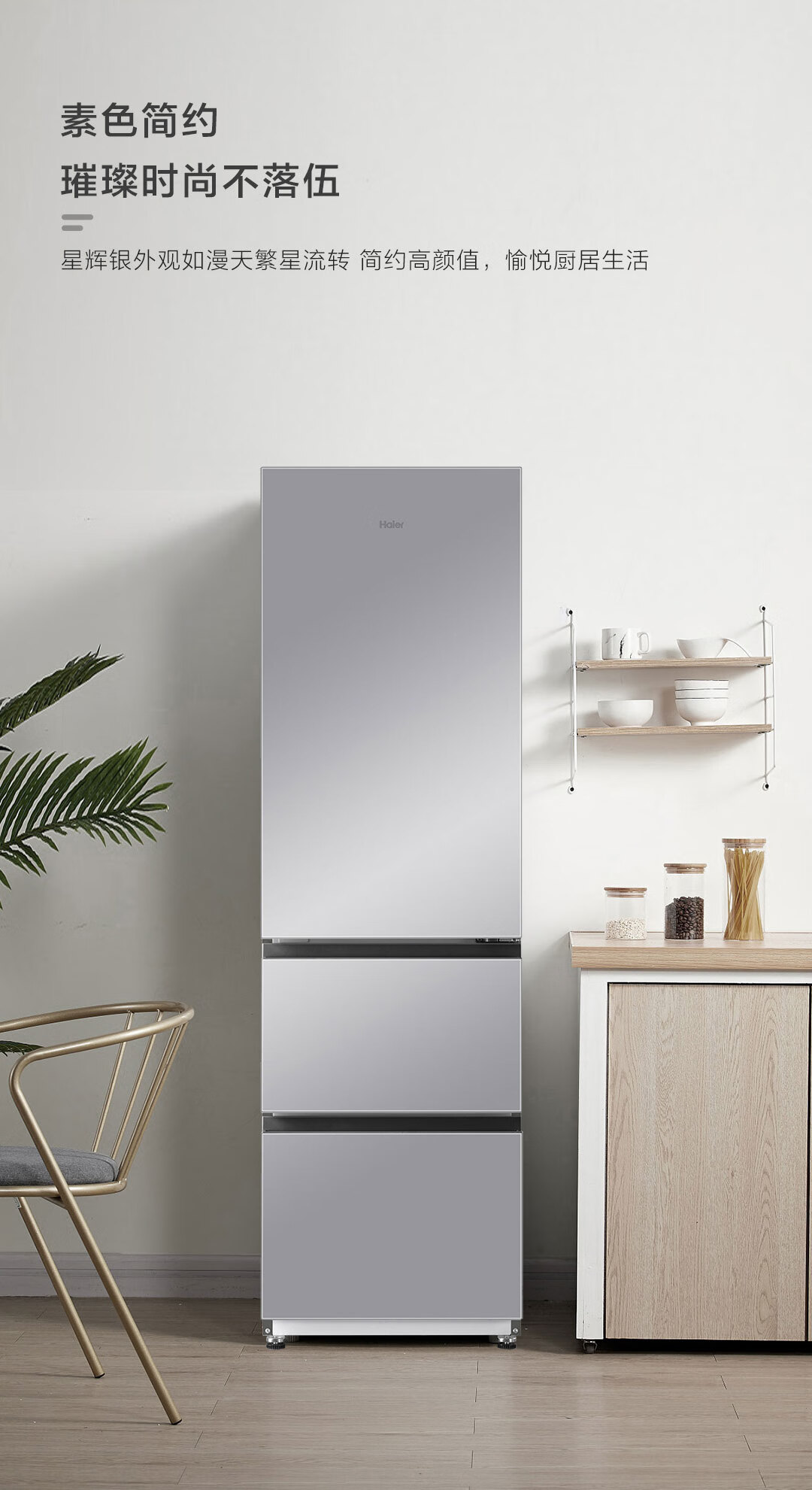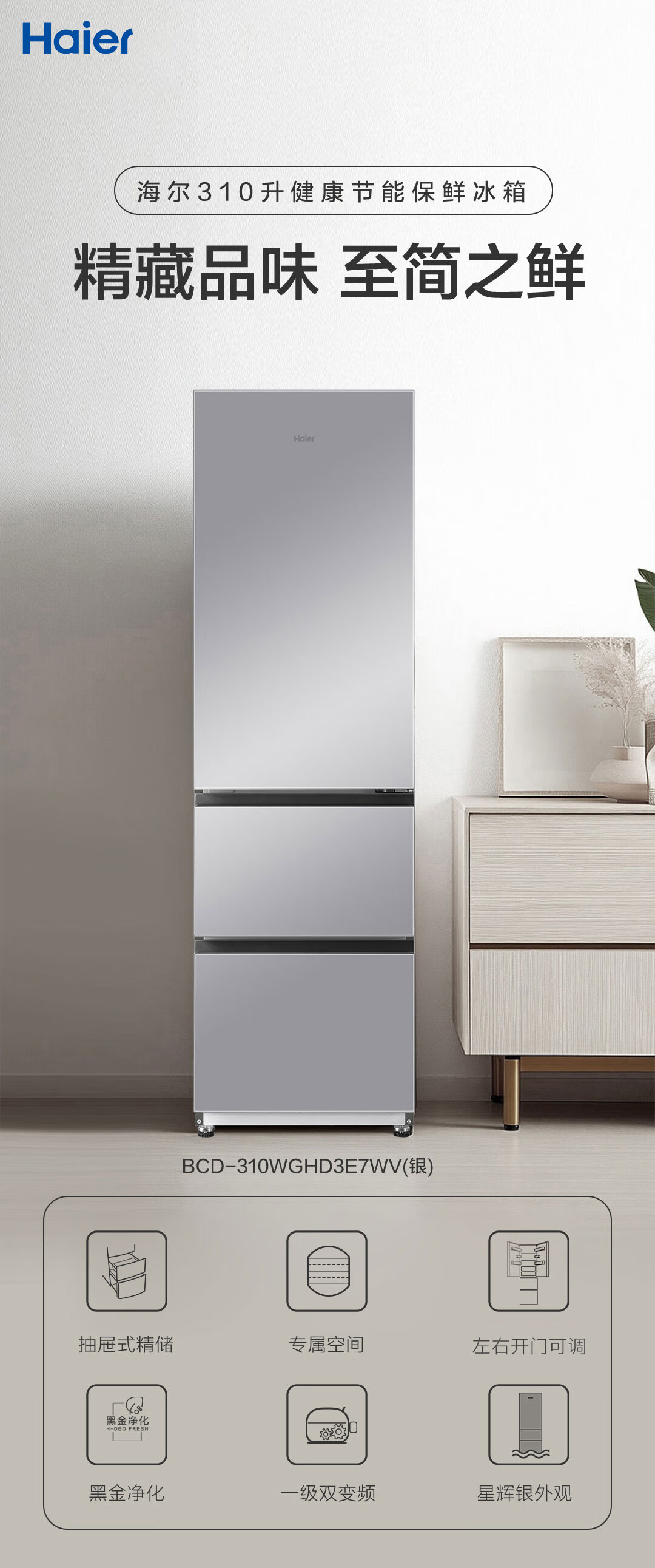 海尔(Haier)「真省电」310L三门冰箱黑金净化一级能效风冷无霜BCD-310WGHD3E7WV(银)国家补贴