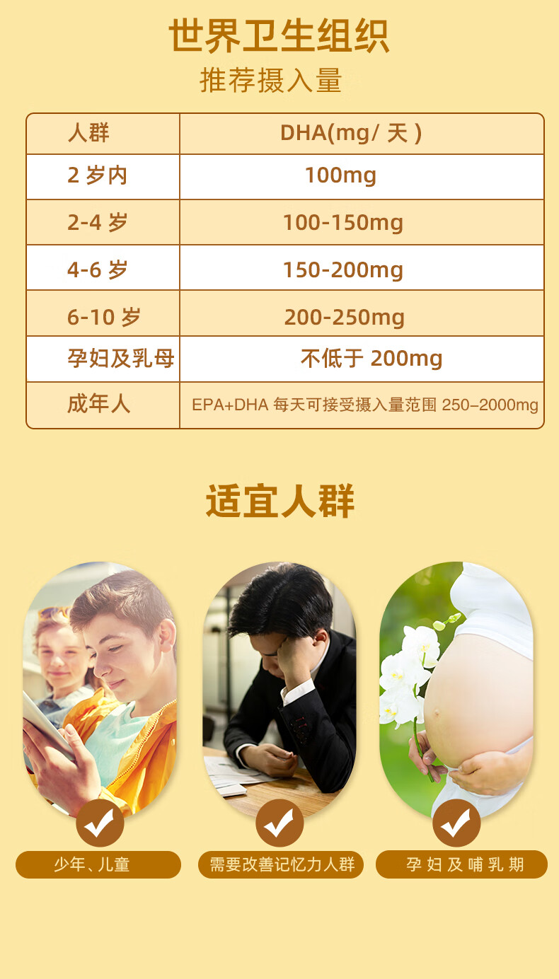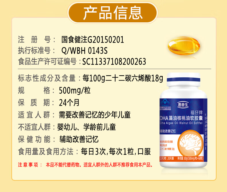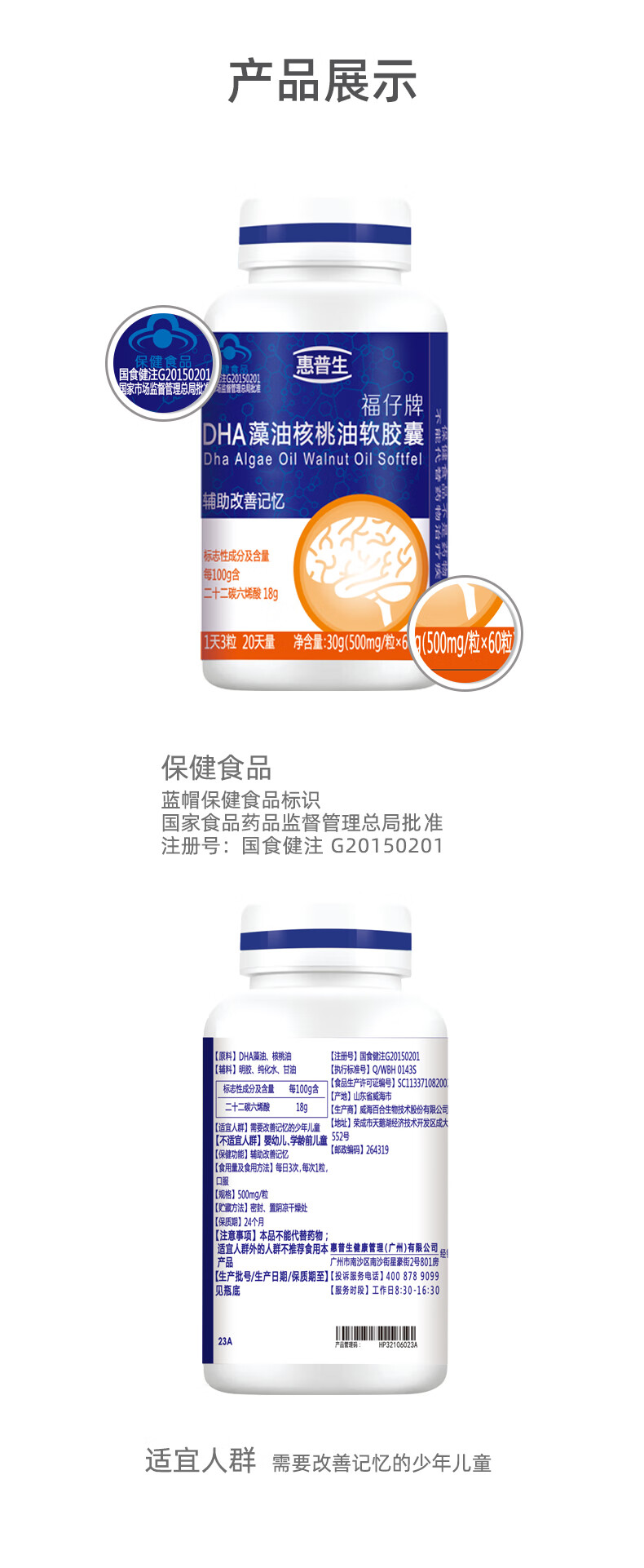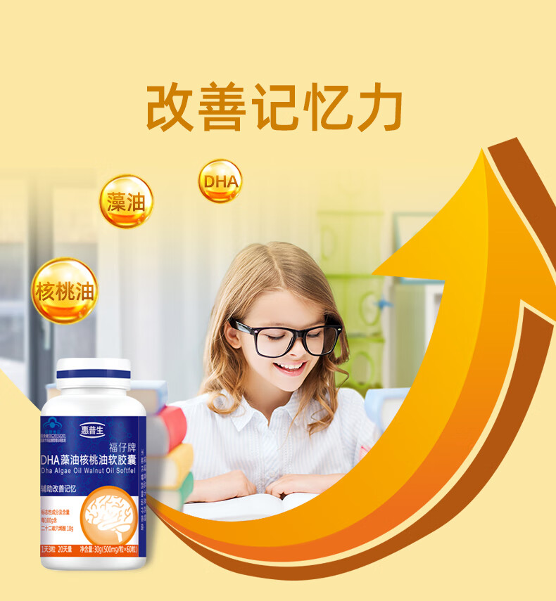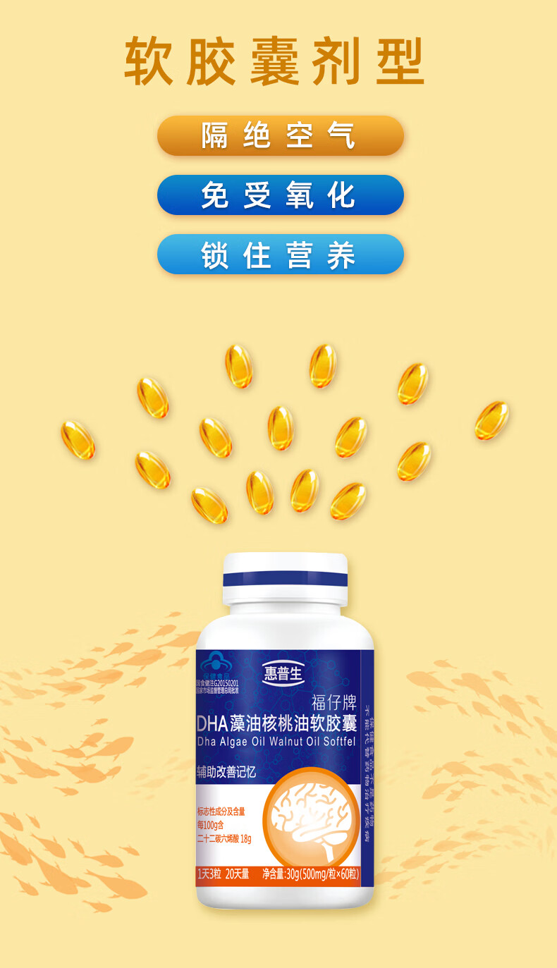 惠普生DHA藻油软胶囊青少年学生补脑改善记忆力儿童初高中生备考非糖果 2瓶120粒(每粒含DHA 90mg)