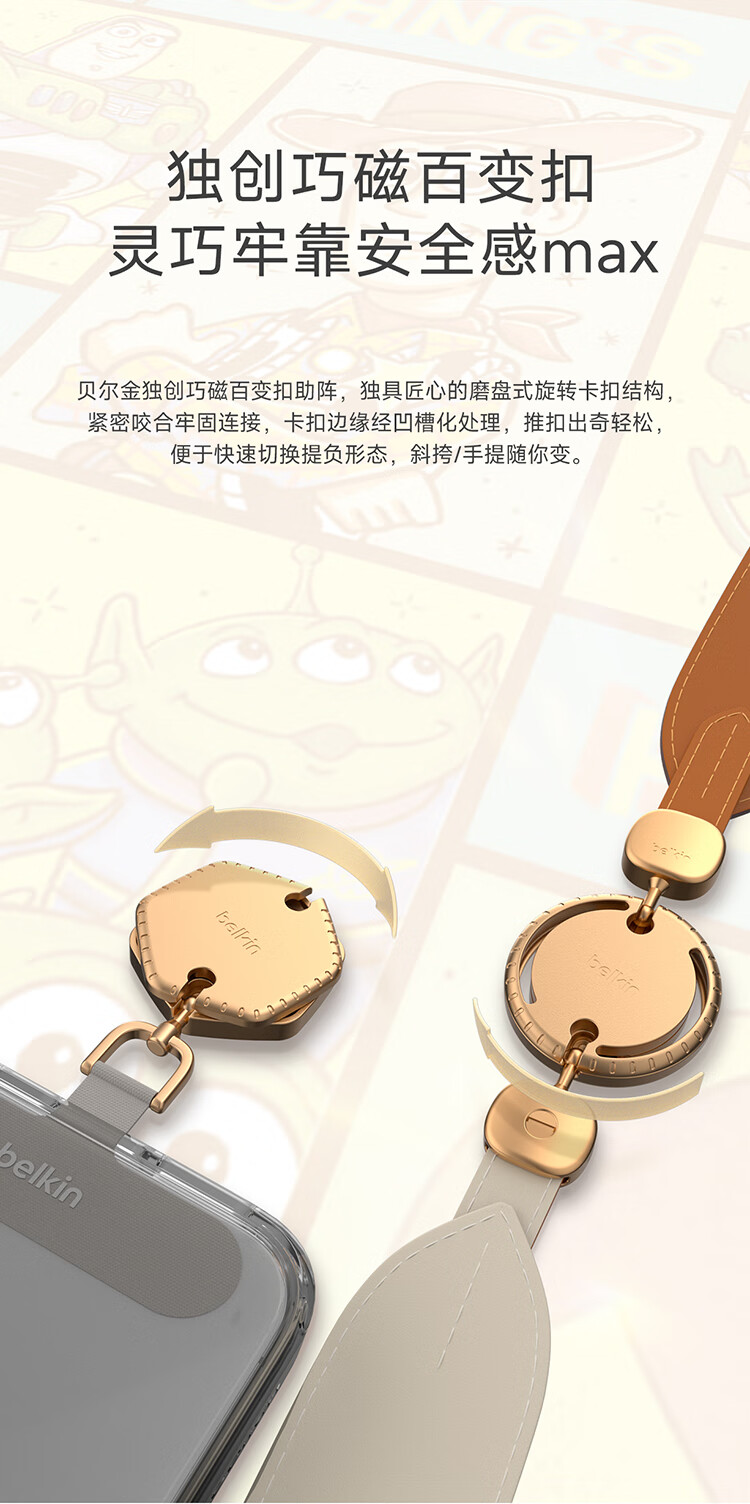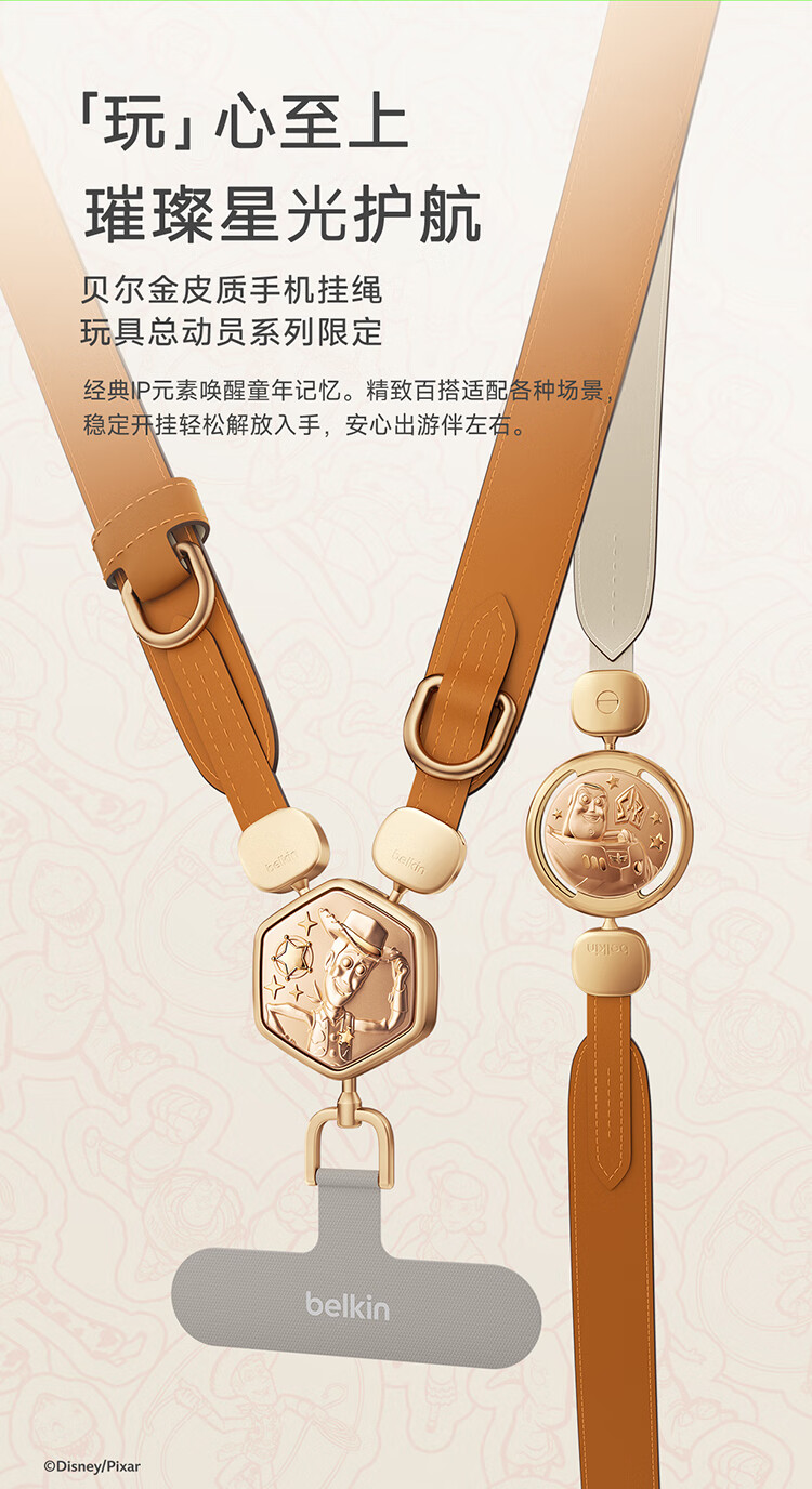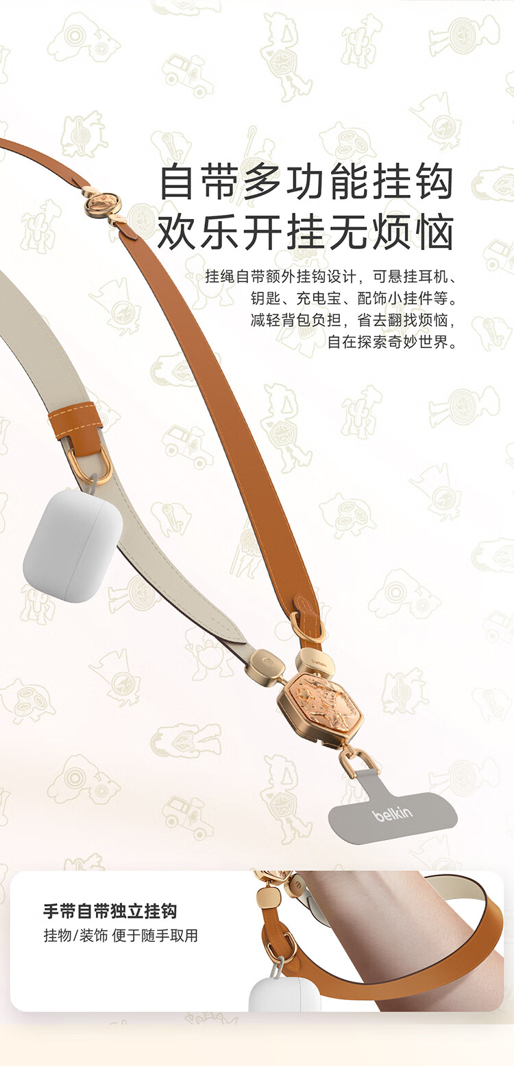 贝尔金(BELKIN)手机挂绳手腕 手机链手机绳高级感挂脖斜跨手机防丢绳带手机垫片 皮革二合一 玩具总动员