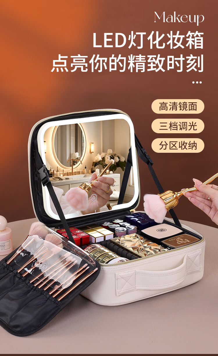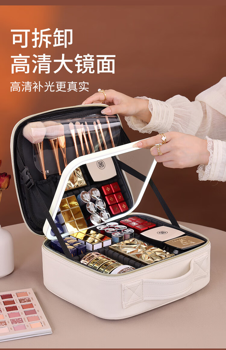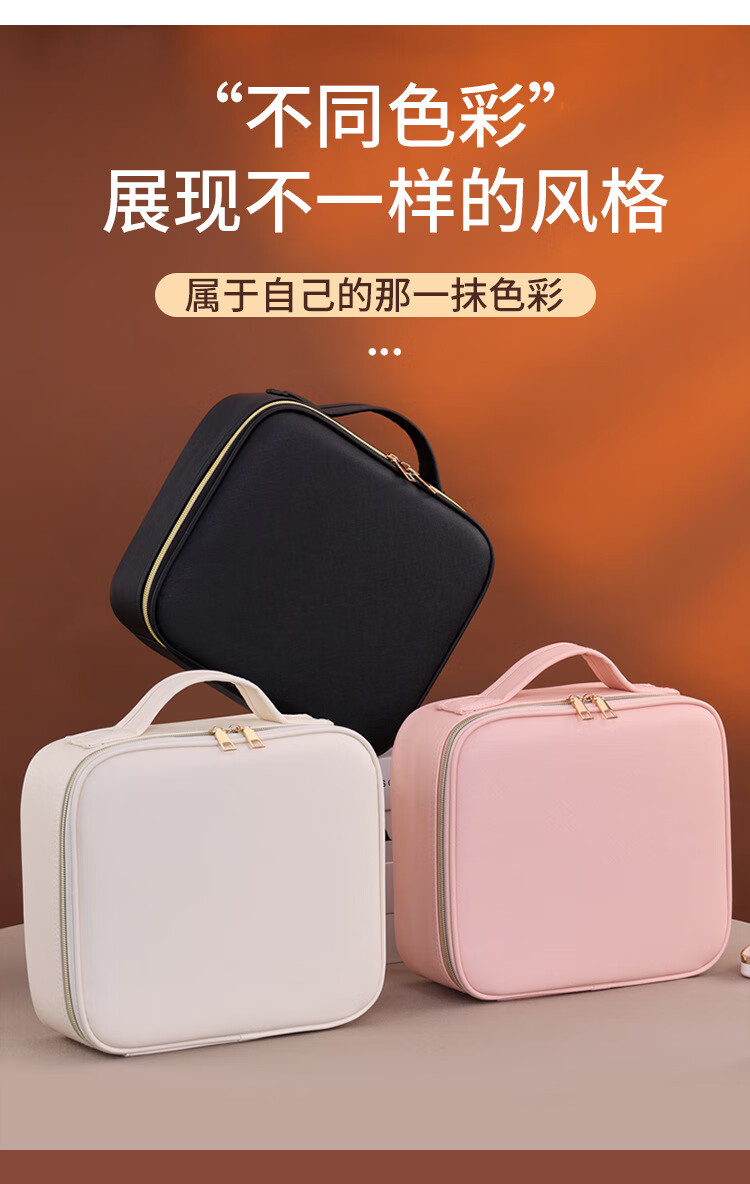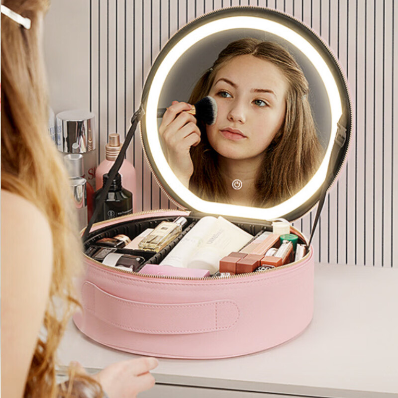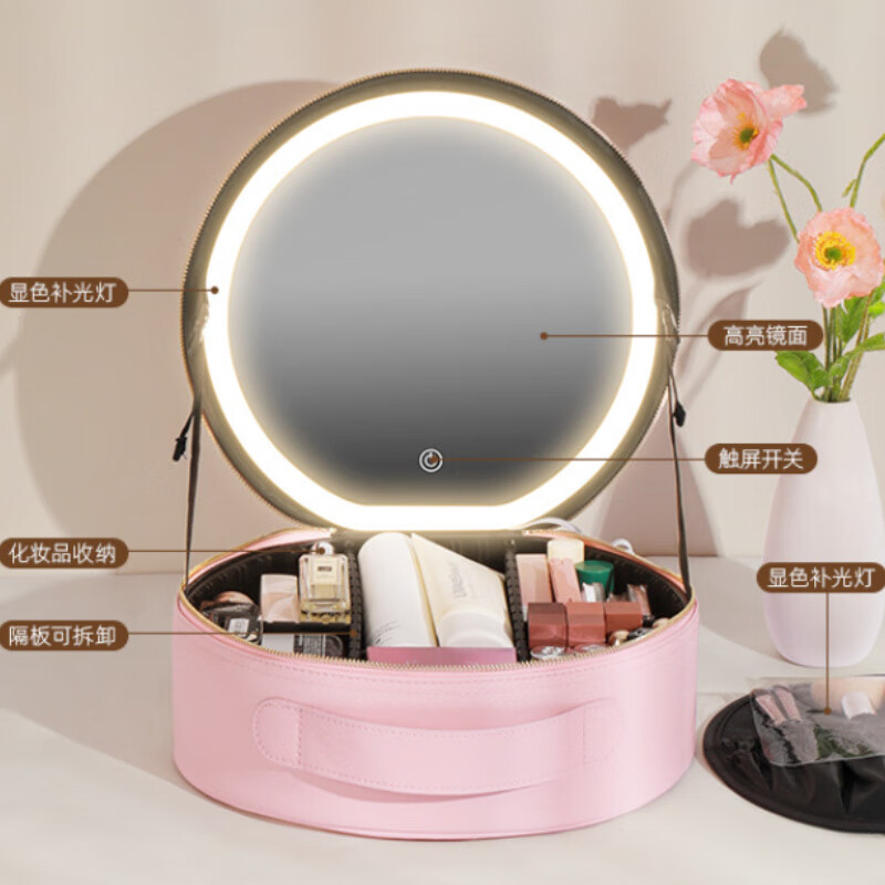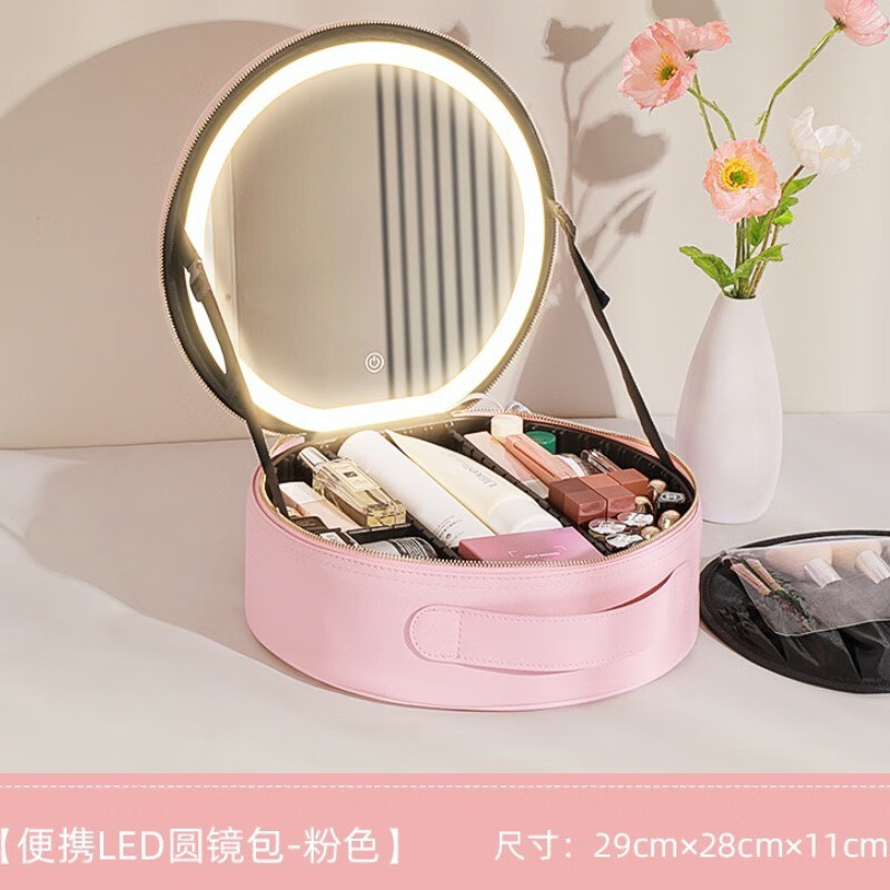 沃有家手提化妆包化妆品分区男士旅行洗潄收纳包女带镜子高级皮革化妆箱 圆形大号灯镜皮革手提化妆包优雅黑