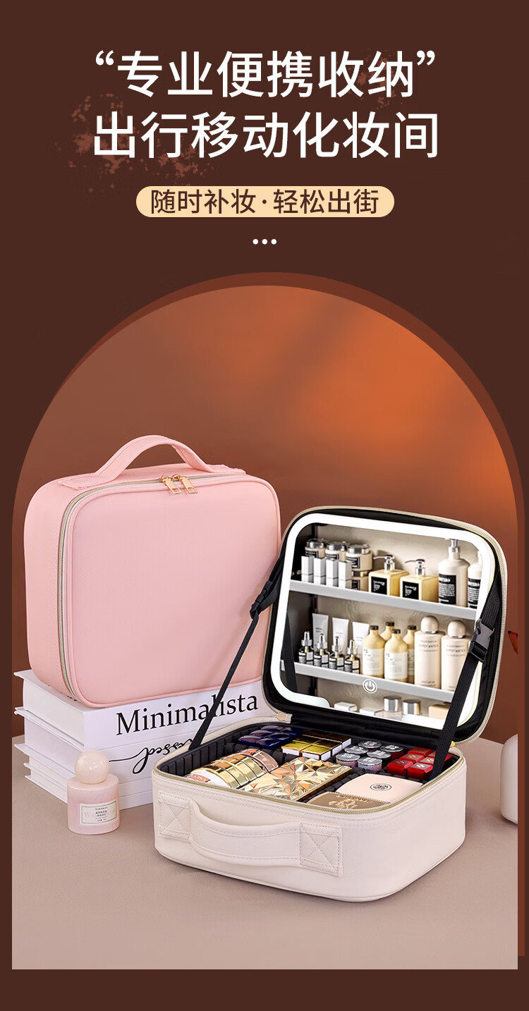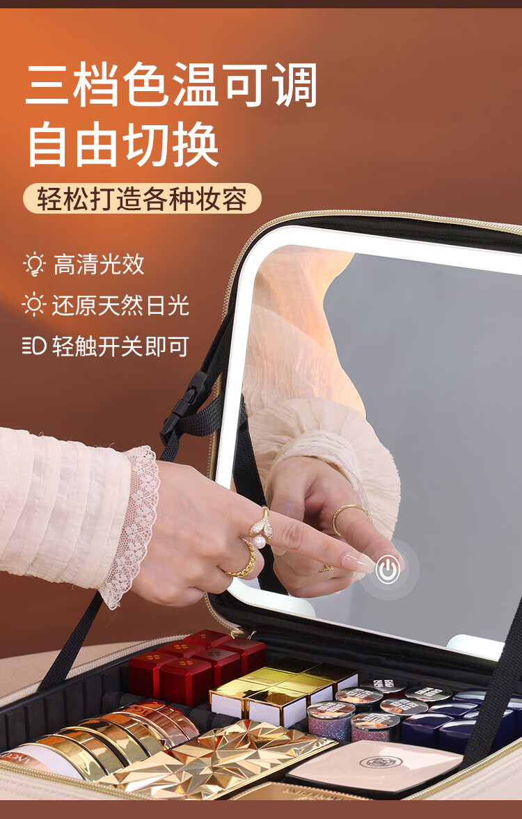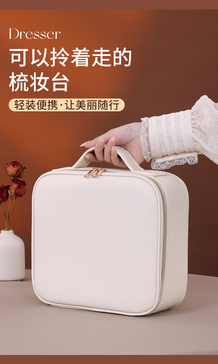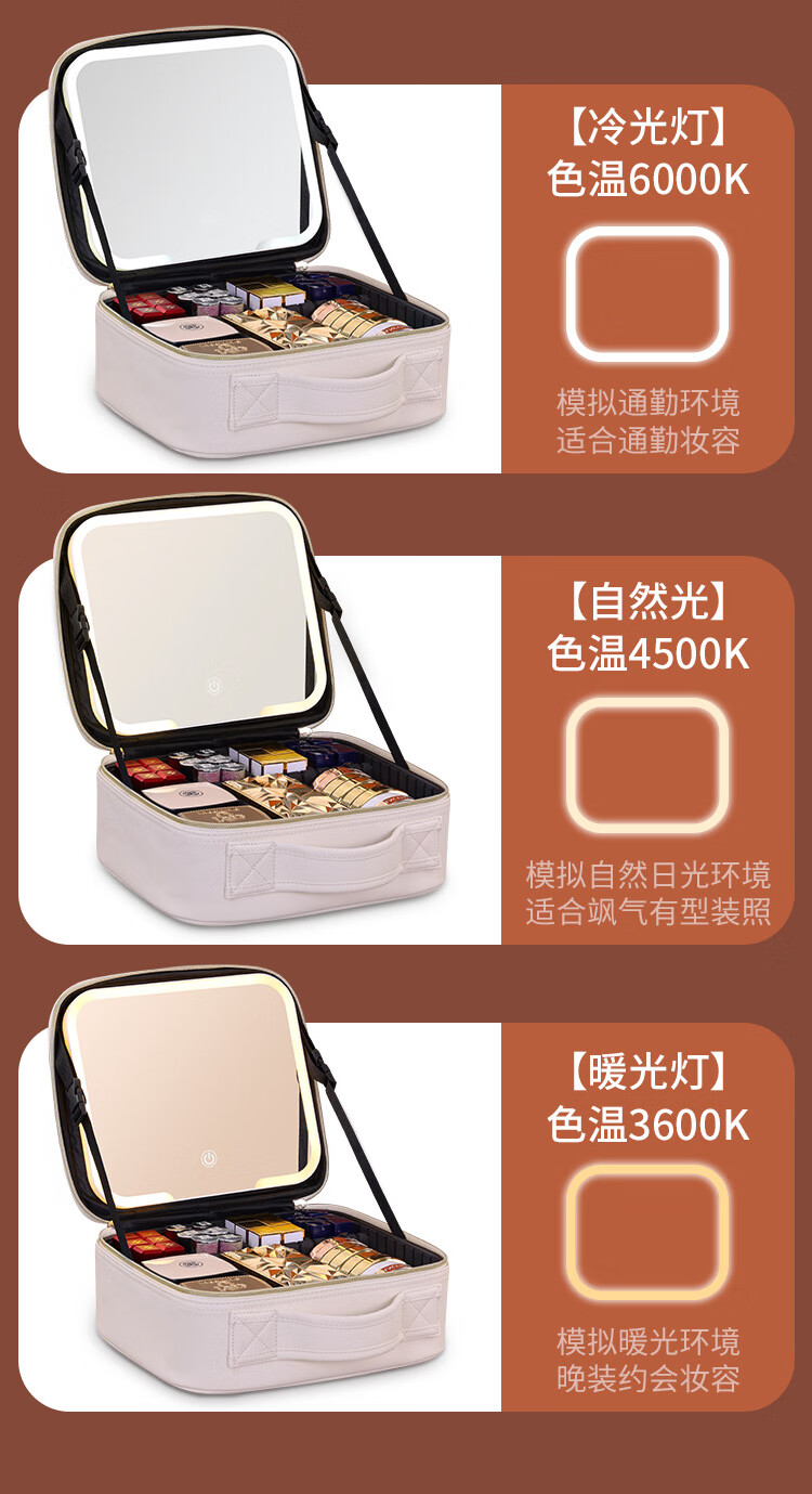 沃有家手提化妆包化妆品分区男士旅行洗潄收纳包女带镜子高级皮革化妆箱 圆形大号灯镜皮革手提化妆包优雅黑