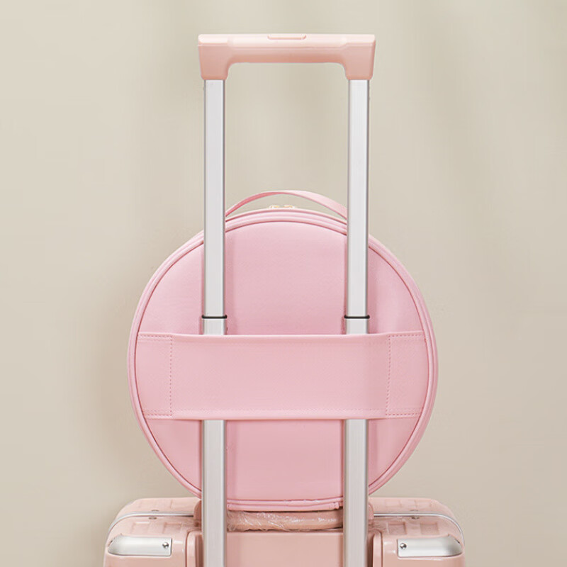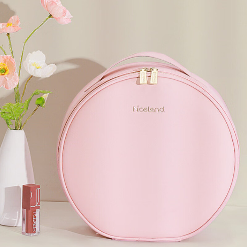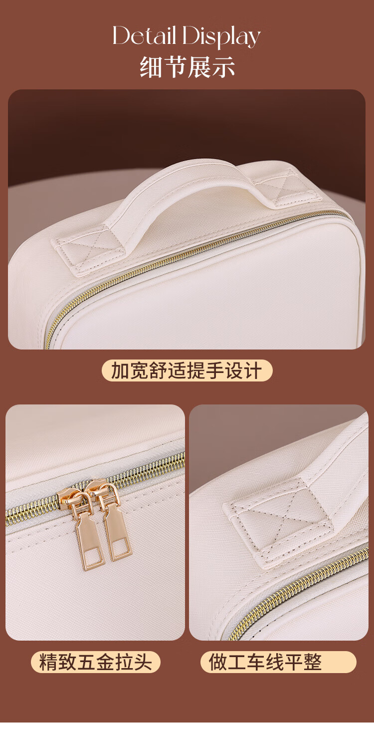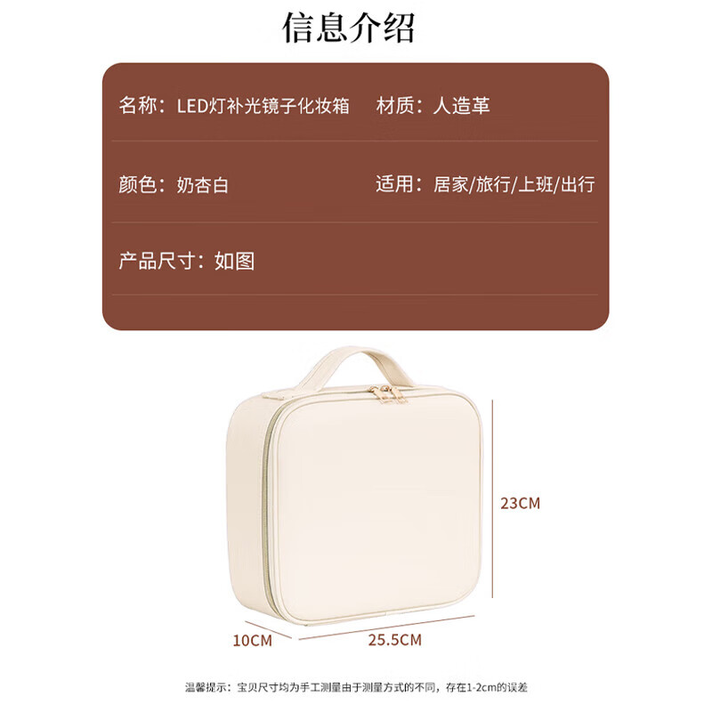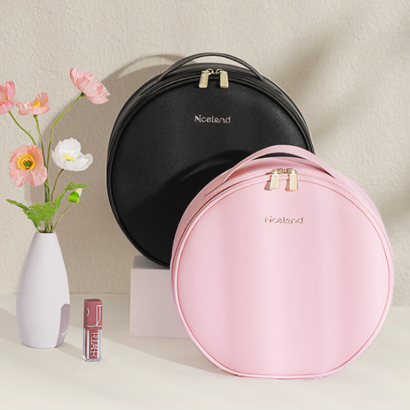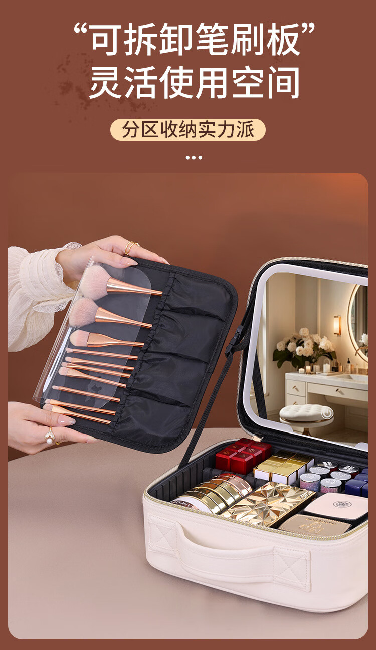 沃有家手提化妆包化妆品分区男士旅行洗潄收纳包女带镜子高级皮革化妆箱 圆形大号灯镜皮革手提化妆包优雅黑