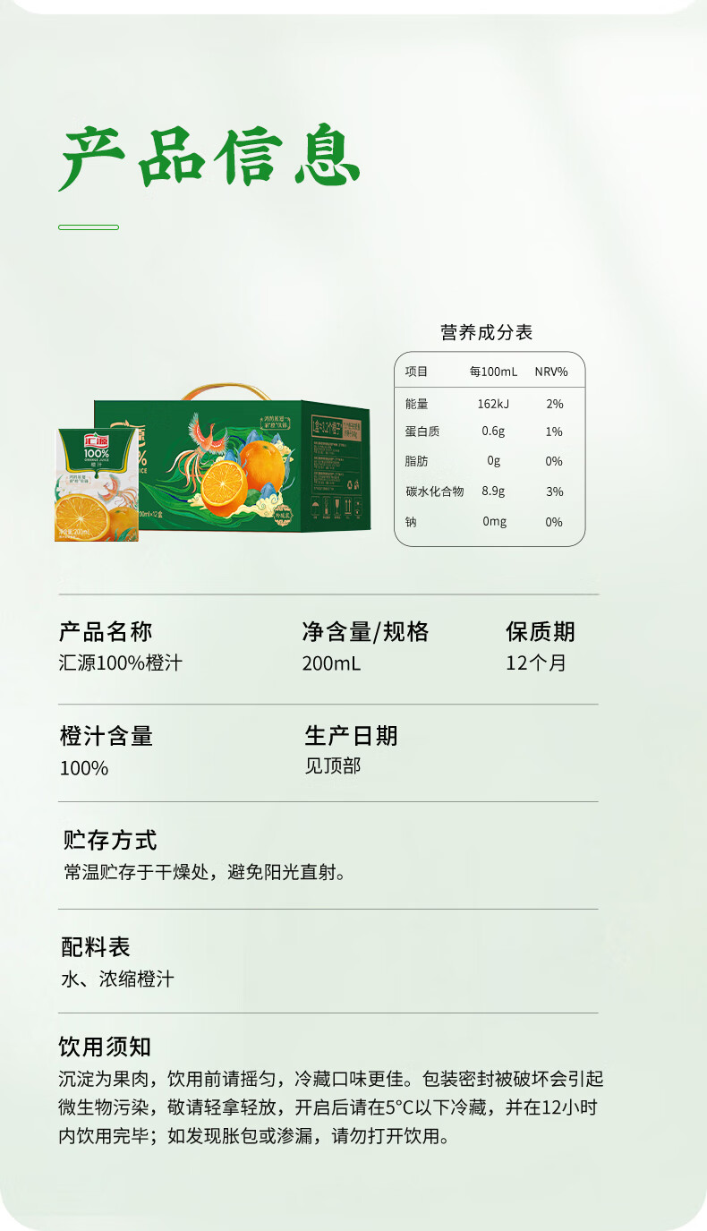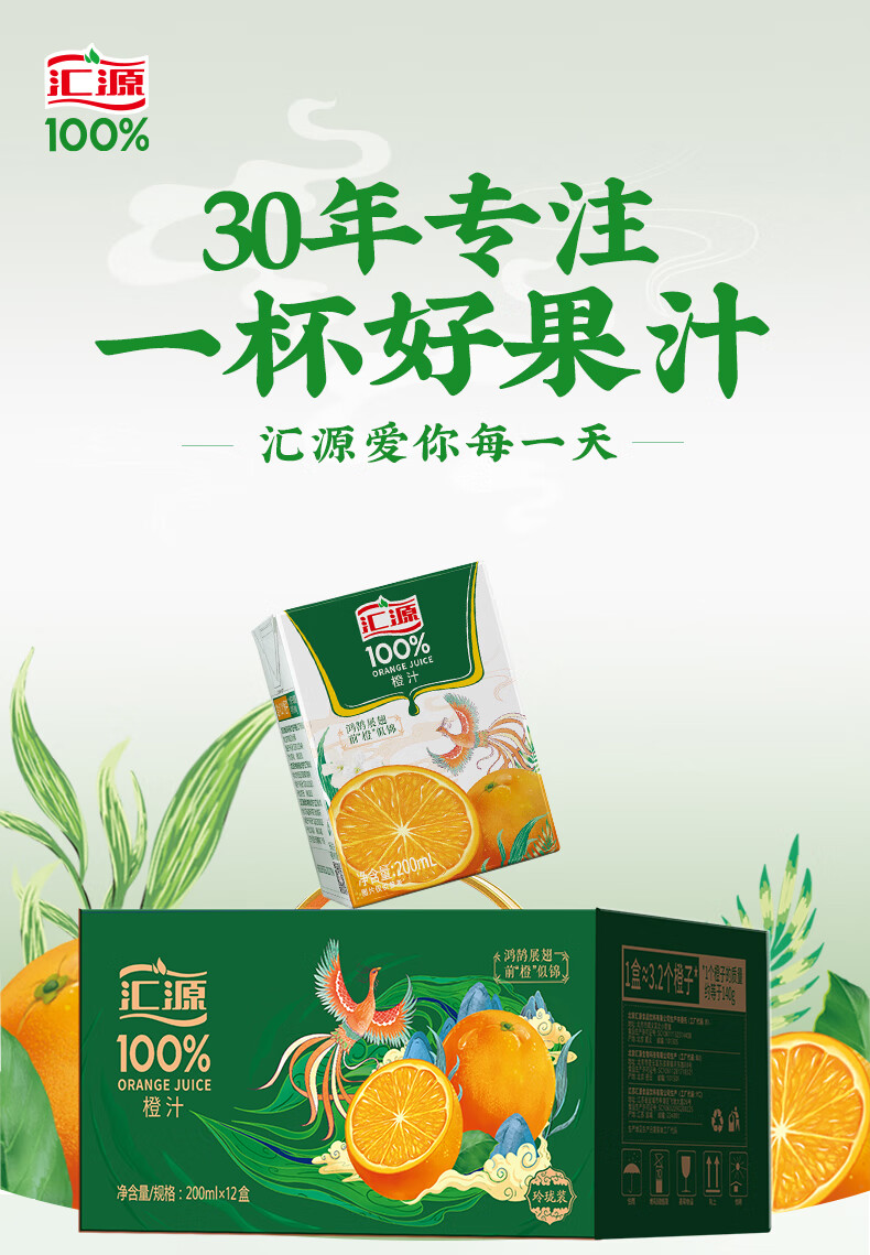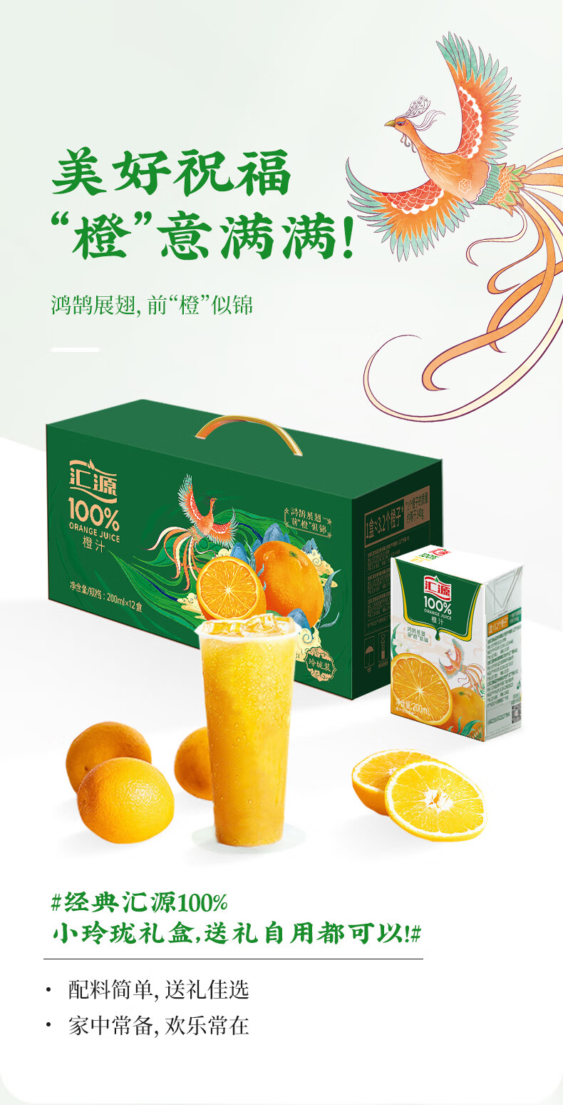 汇源100%橙汁礼盒装果汁饮料200ml*12盒节日年货节送礼宴请