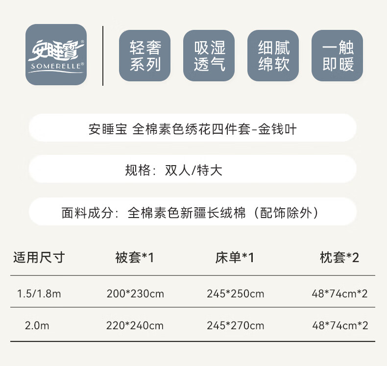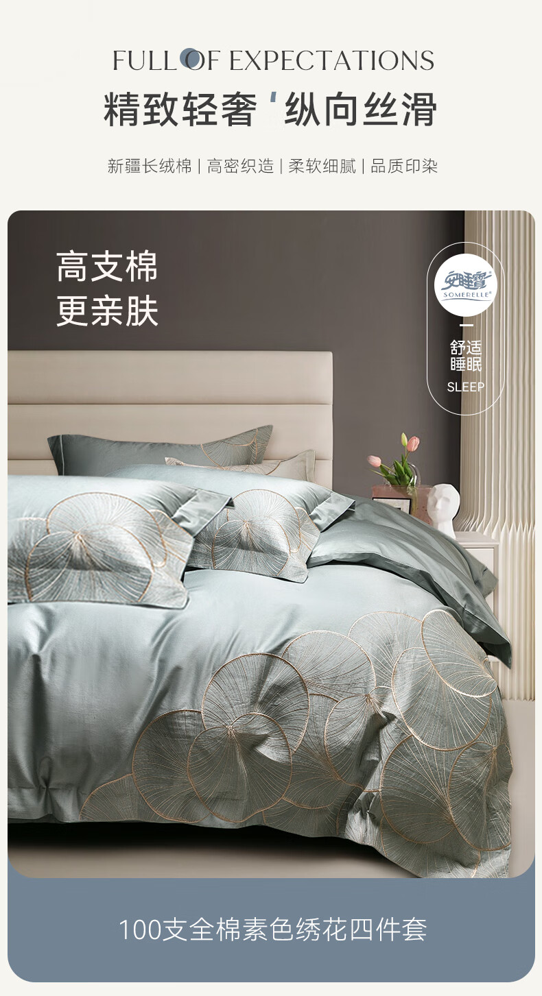 安睡宝(SOMERELLE)100支长绒棉四件套全棉素色绣花轻奢高端套件床单被套床上用品 100支 轻奢长绒棉四件套糯米粉 床单款 (被套220*240cm) 特大