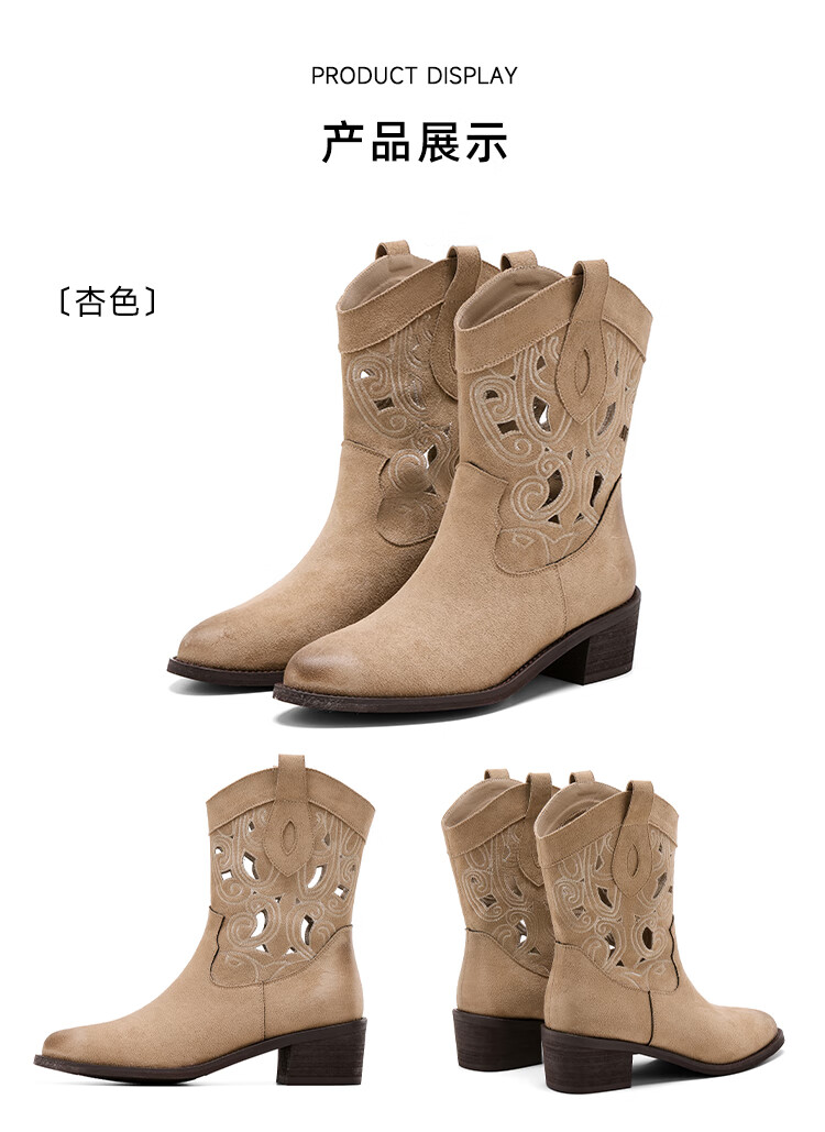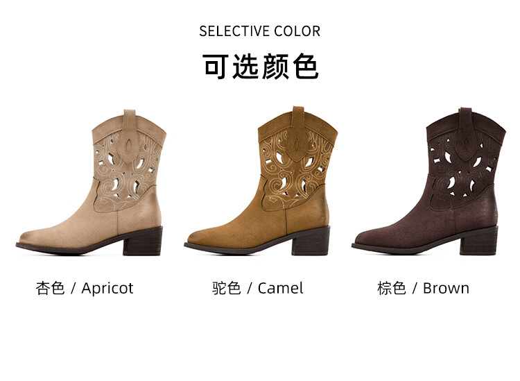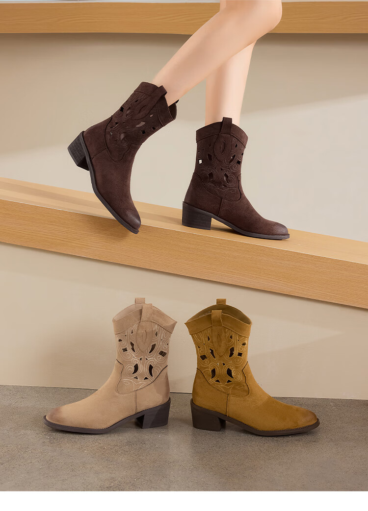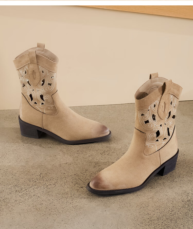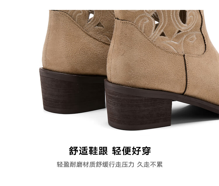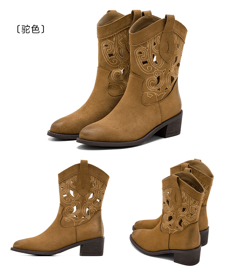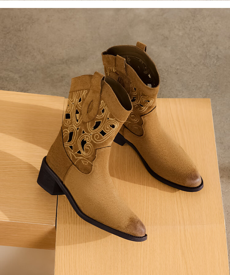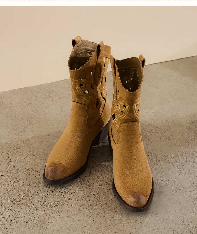 星期六复古西部牛仔靴女2025秋季新款刺绣镂空V口骑士靴时装短靴 驼色 35