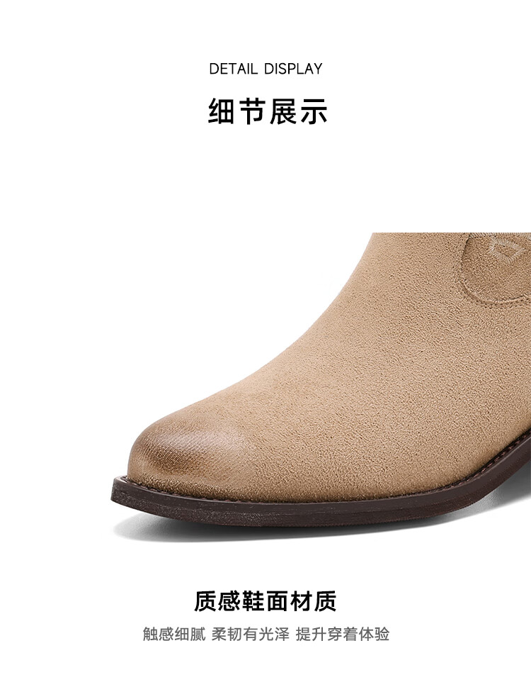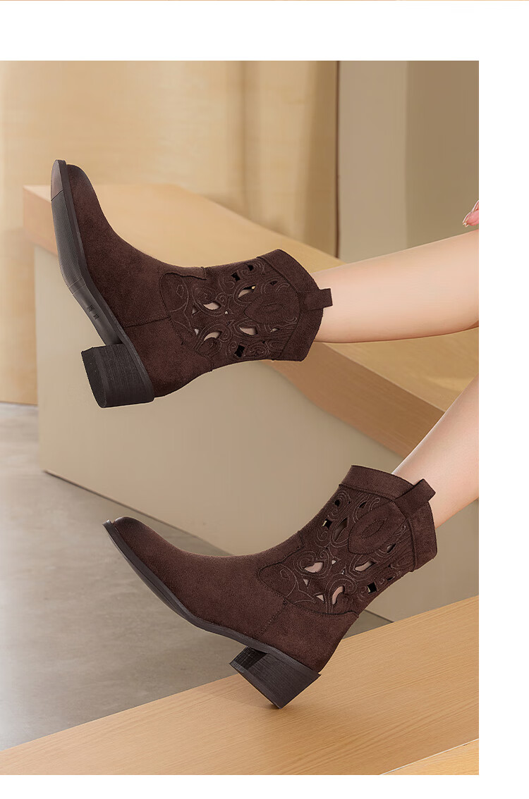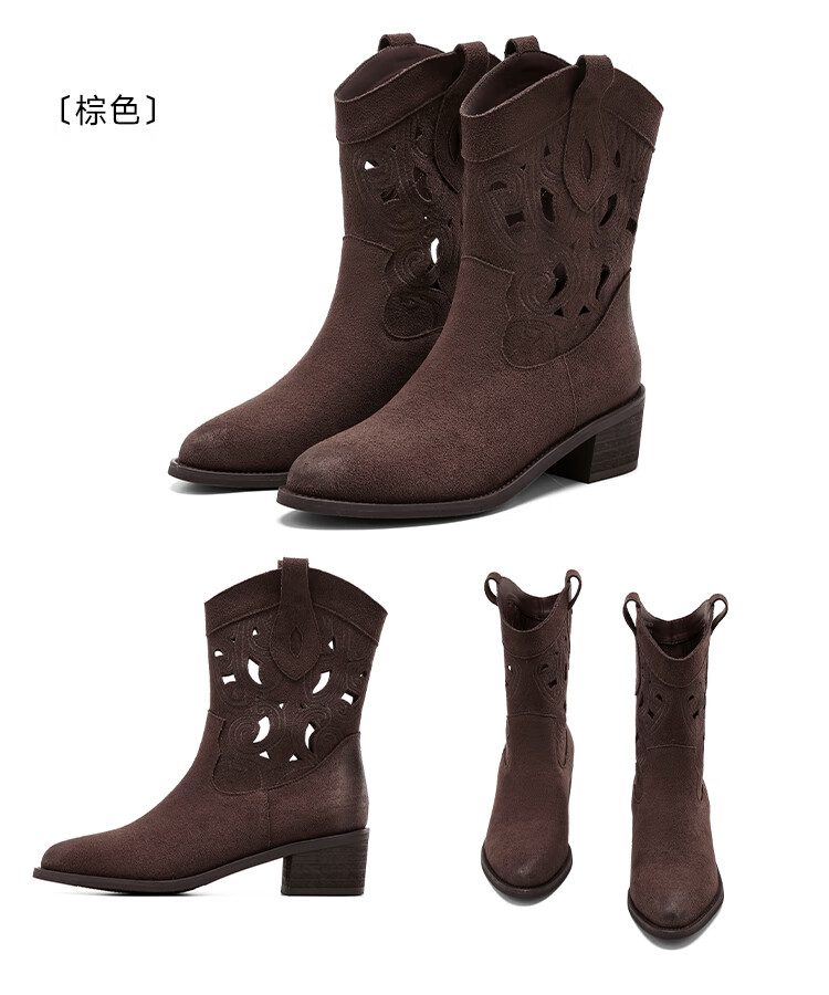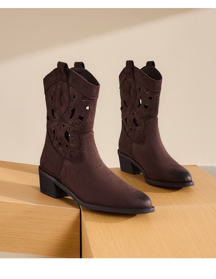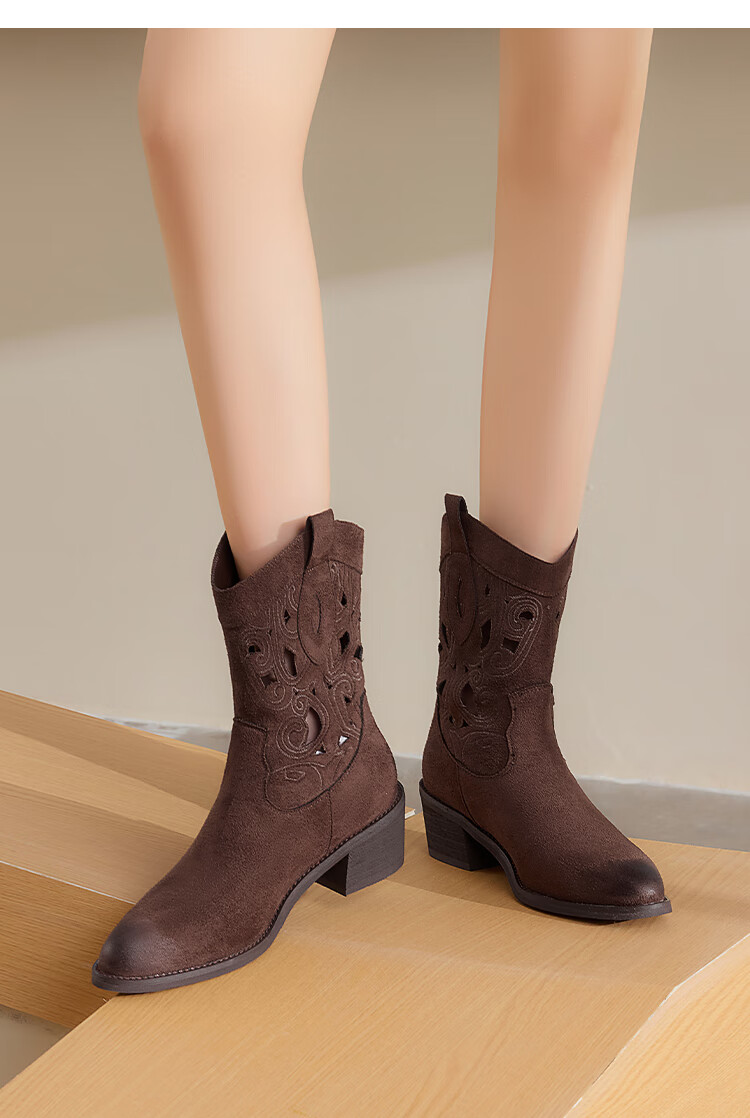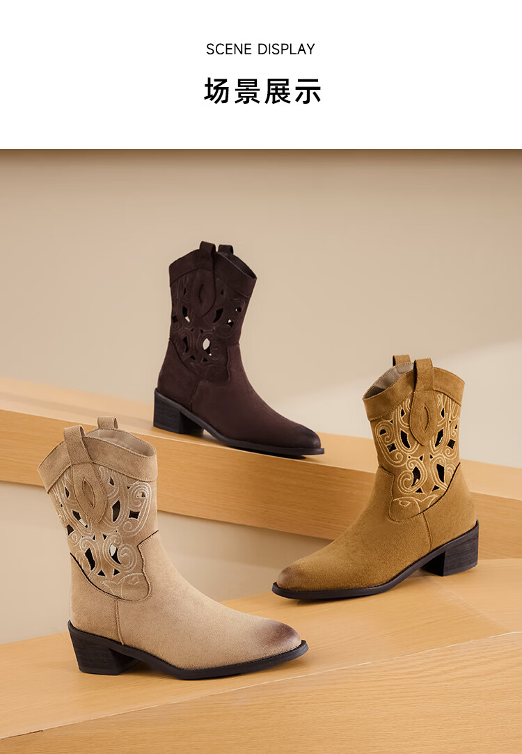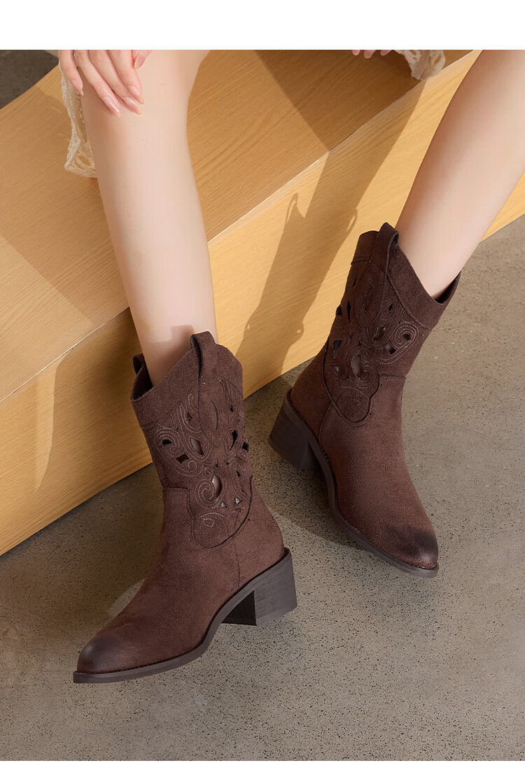 星期六复古西部牛仔靴女2025秋季新款刺绣镂空V口骑士靴时装短靴 驼色 35