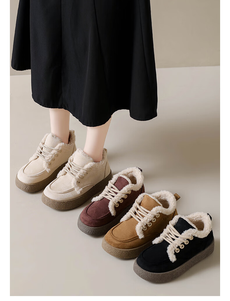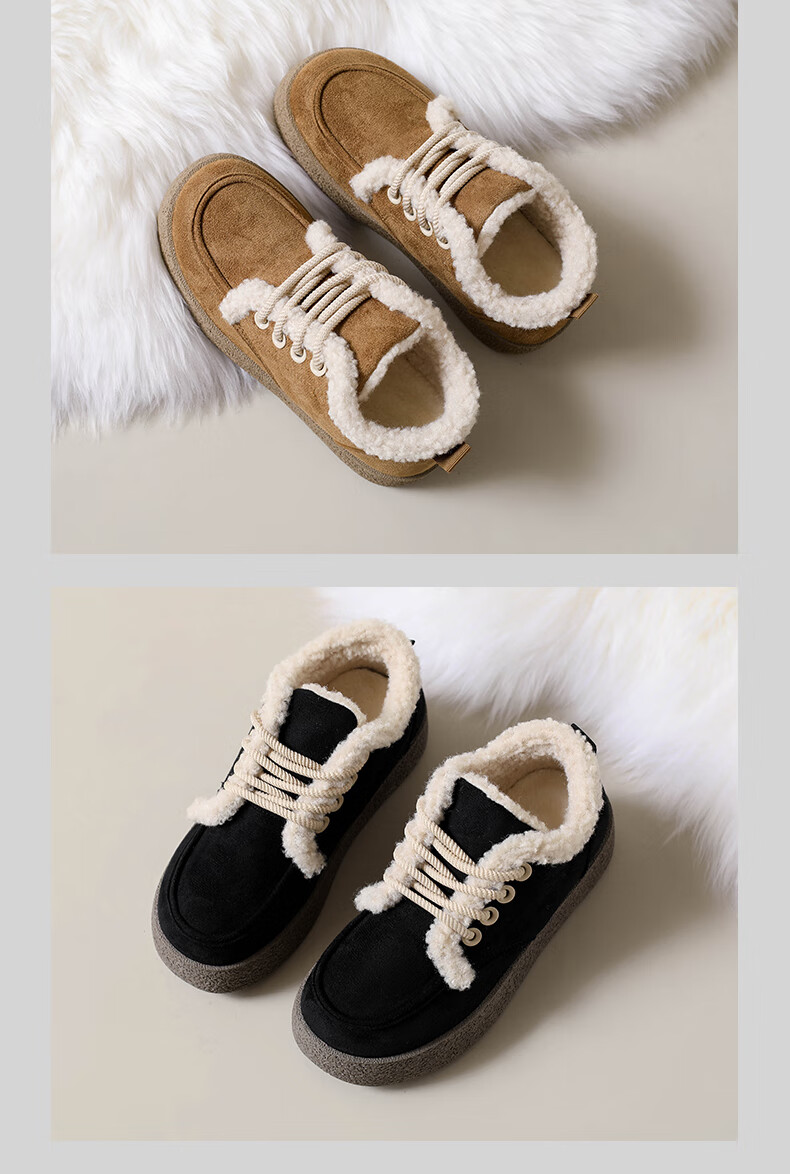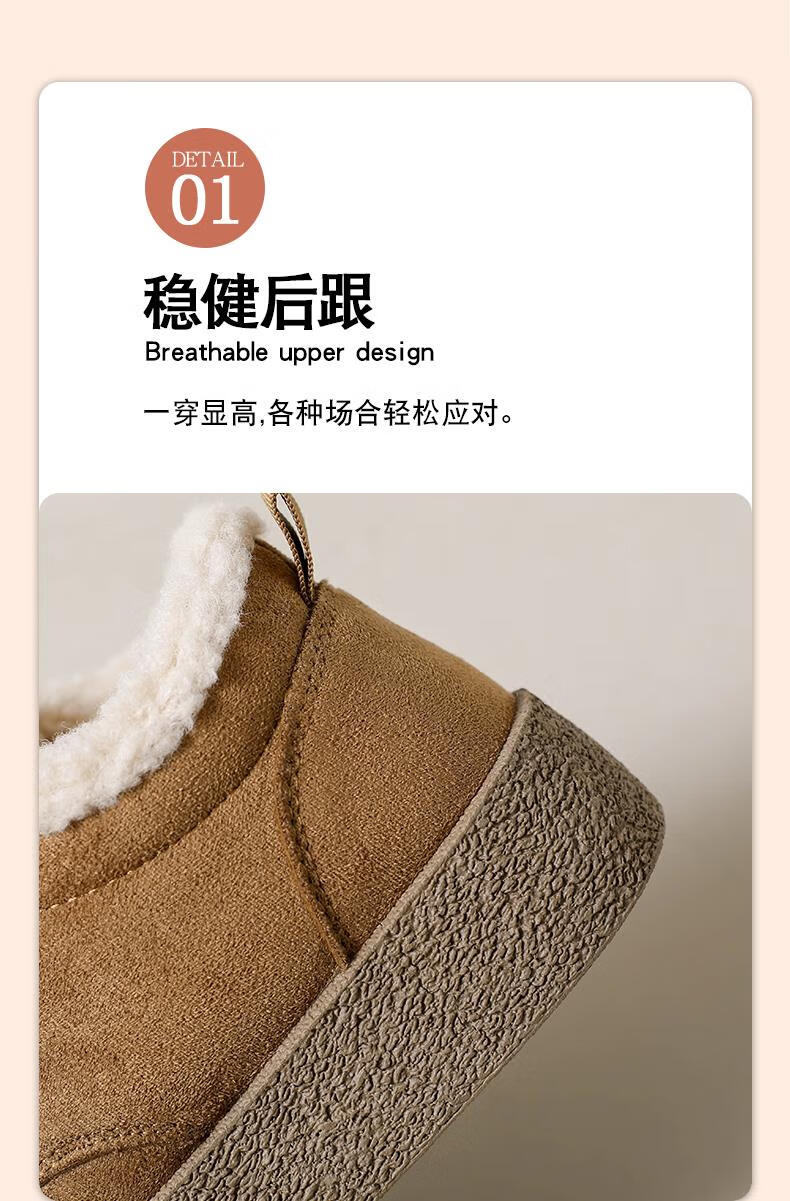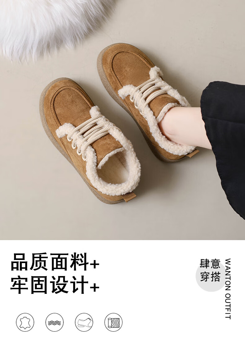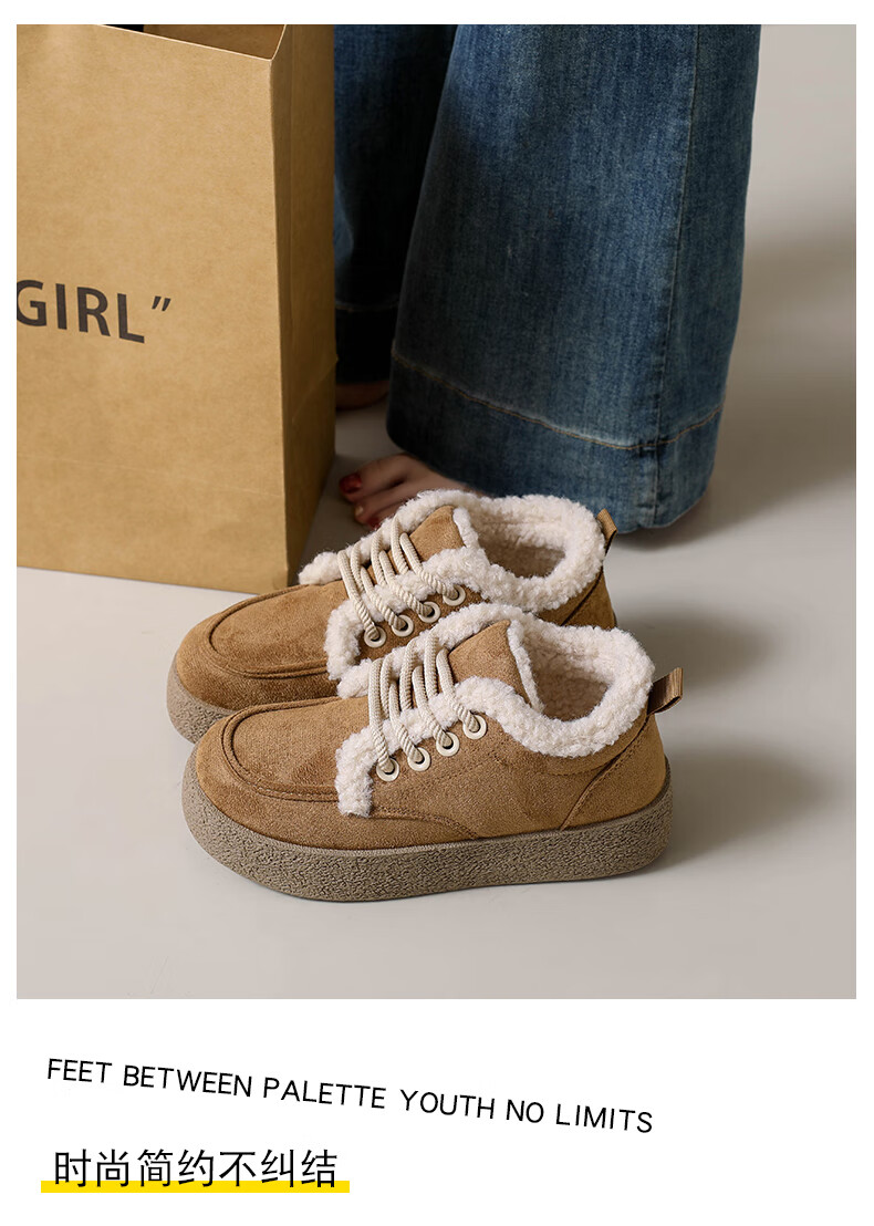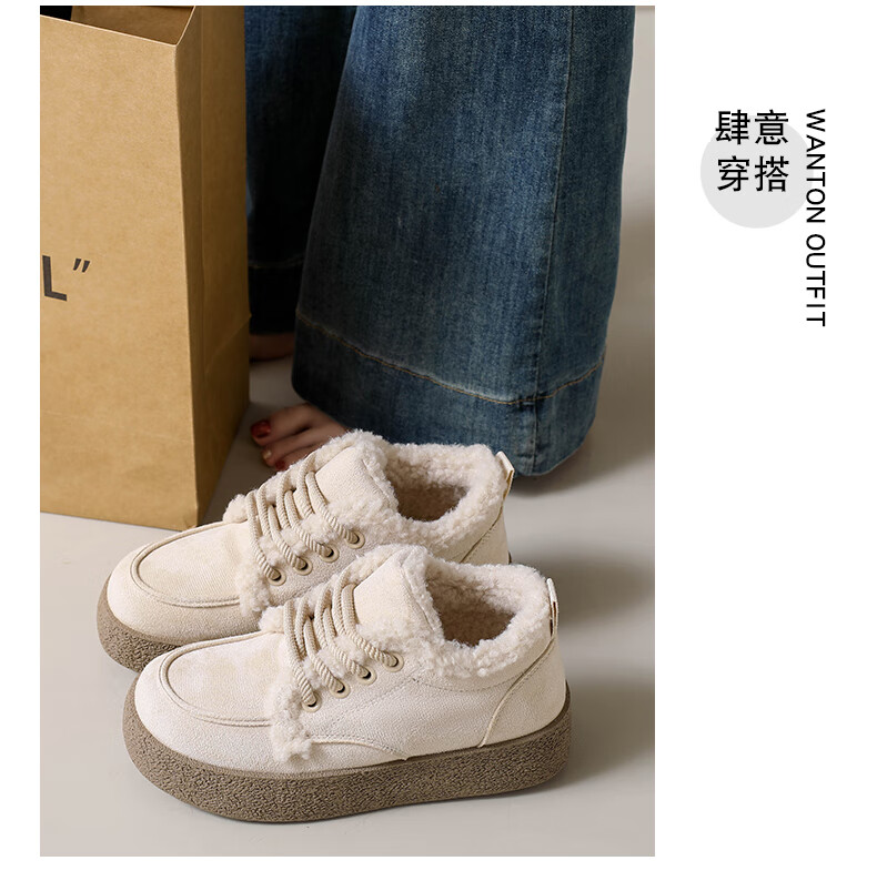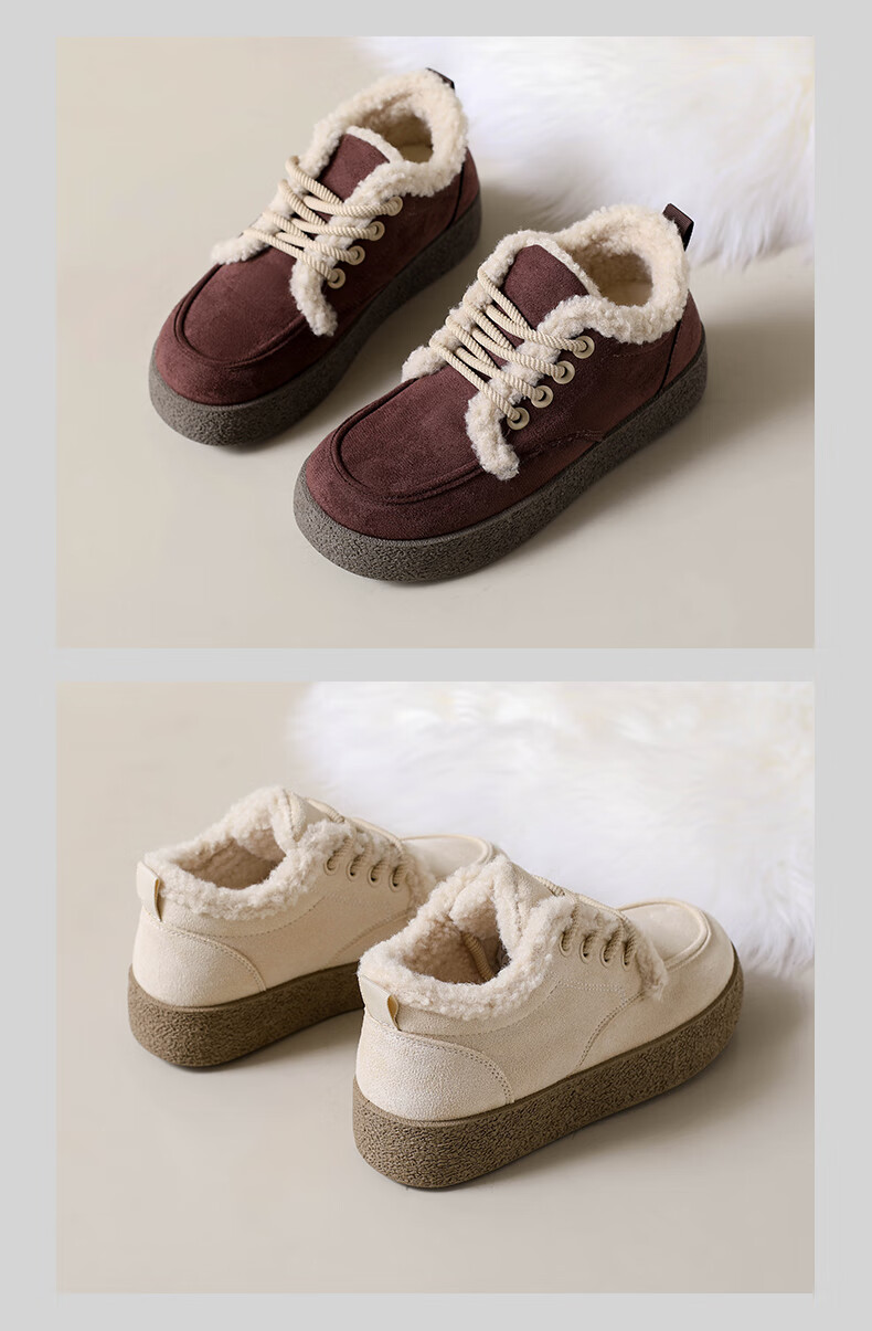 稻草人(MEXICAN)棉鞋女款踩屎感一脚蹬冬季厚底勃肯鞋外穿懒人保暖加绒系带雪地靴 米色【升级款更防滑耐磨】 40