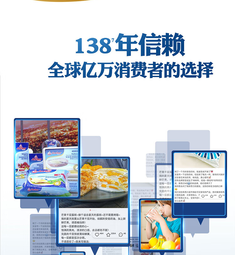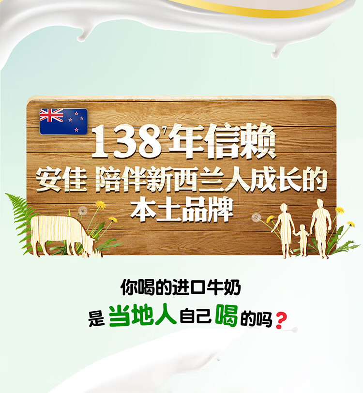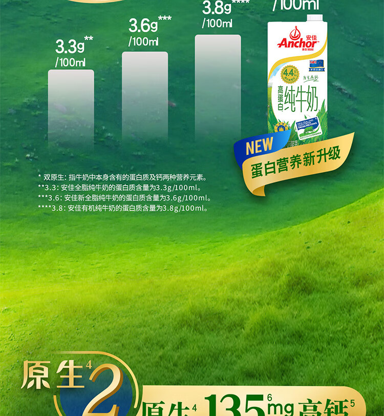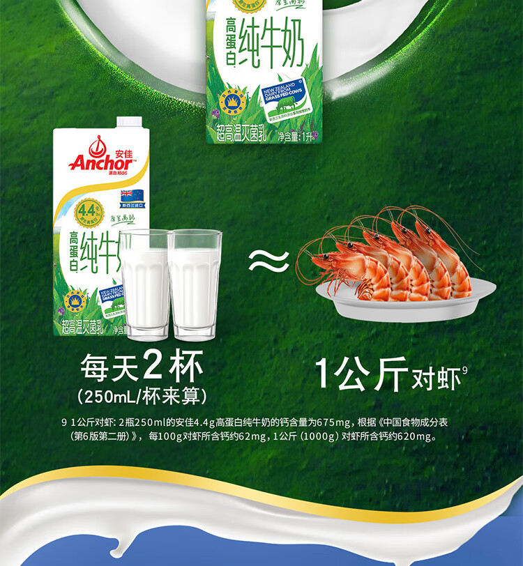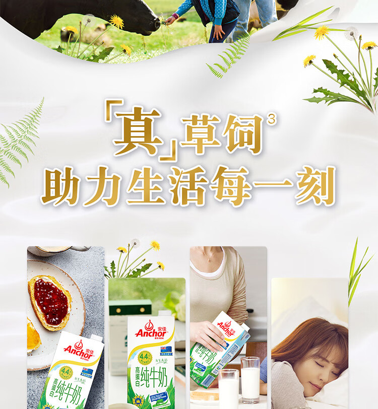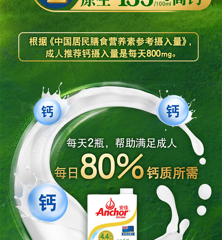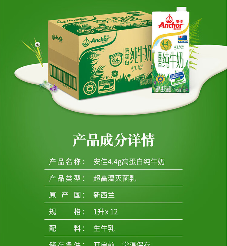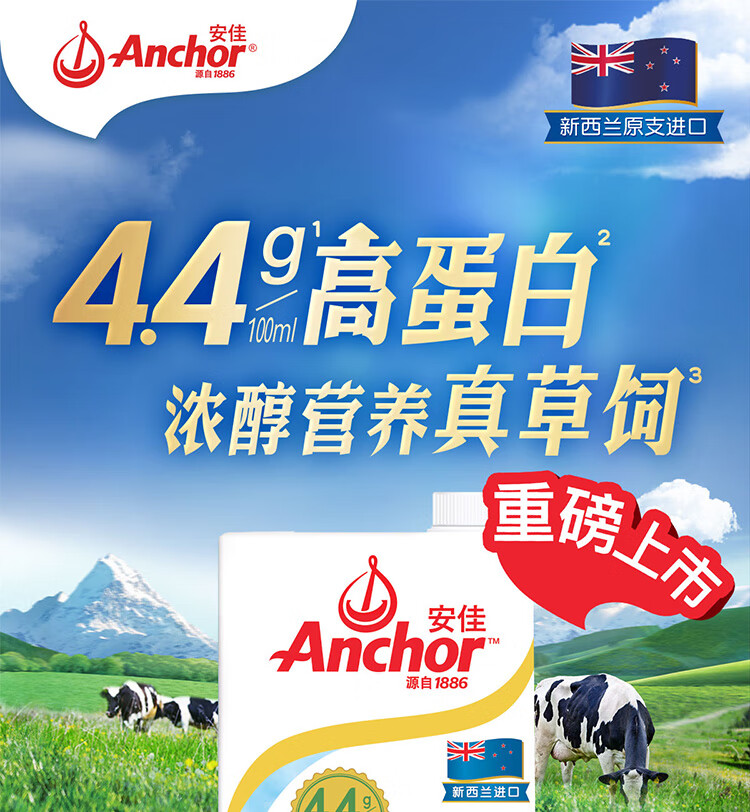 安佳(Anchor)4.4g原生高钙高蛋白全脂纯牛奶1L*12盒 新西兰进口草饲牛奶