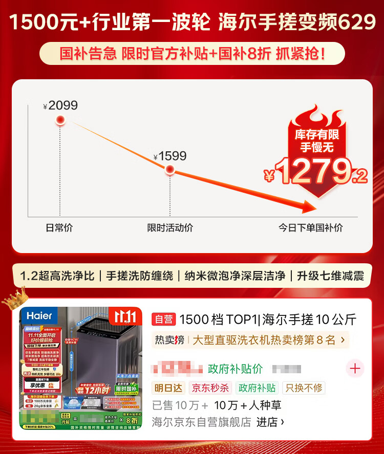 海尔(Haier)手搓洗 全自动波轮洗衣机 10KG 抗菌 一级能效 家电国家补贴以旧换新京东自营 XQB100-BS629