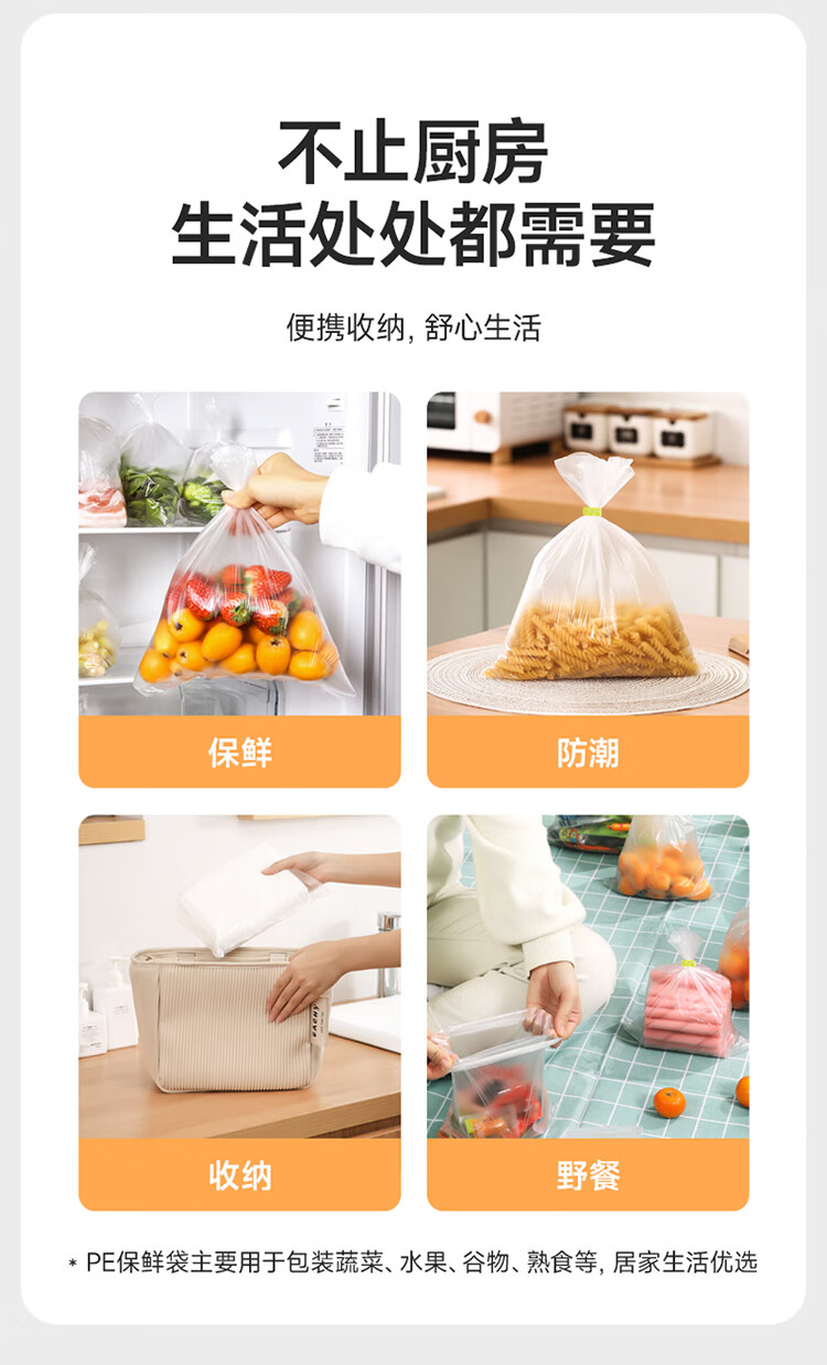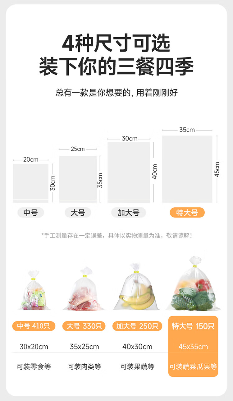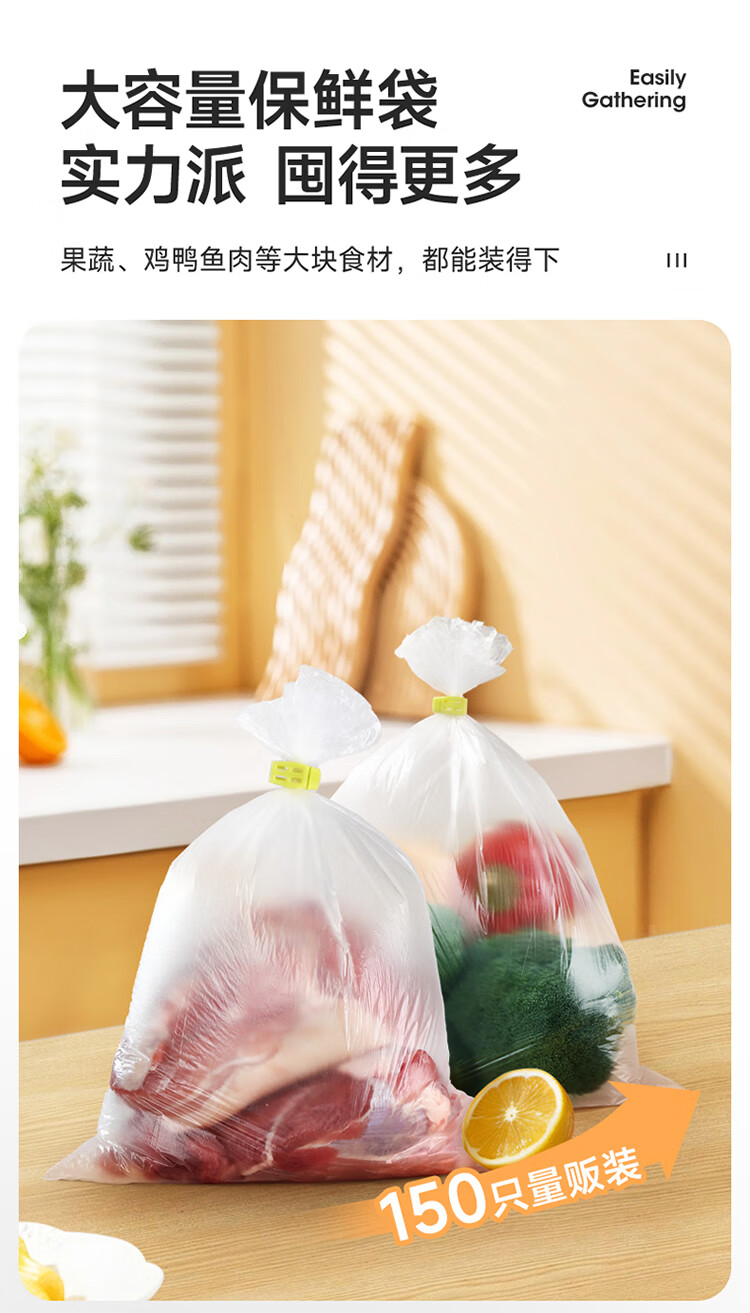 美丽雅家用食品级保鲜袋特大号35*45cm150只厚实分装袋子连卷塑料袋