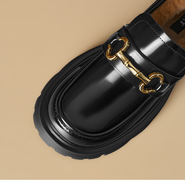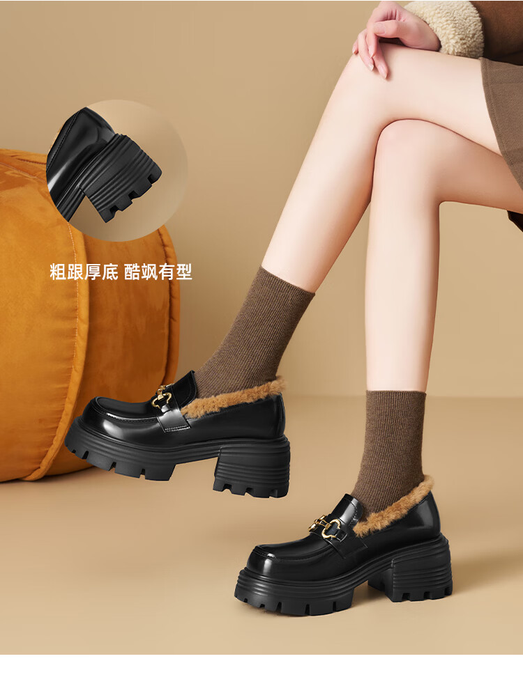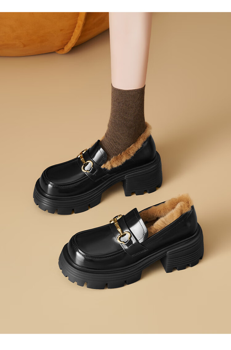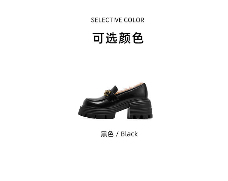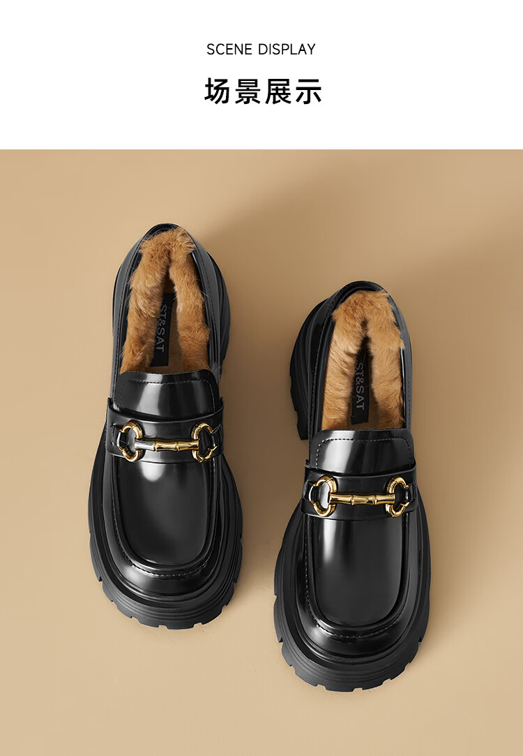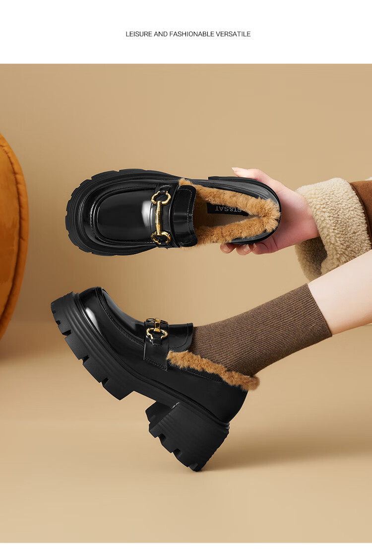 星期六加绒乐福鞋女2025新款冬季加厚保暖黑色小皮鞋厚底增高女鞋 黑色 【复古百搭】 35