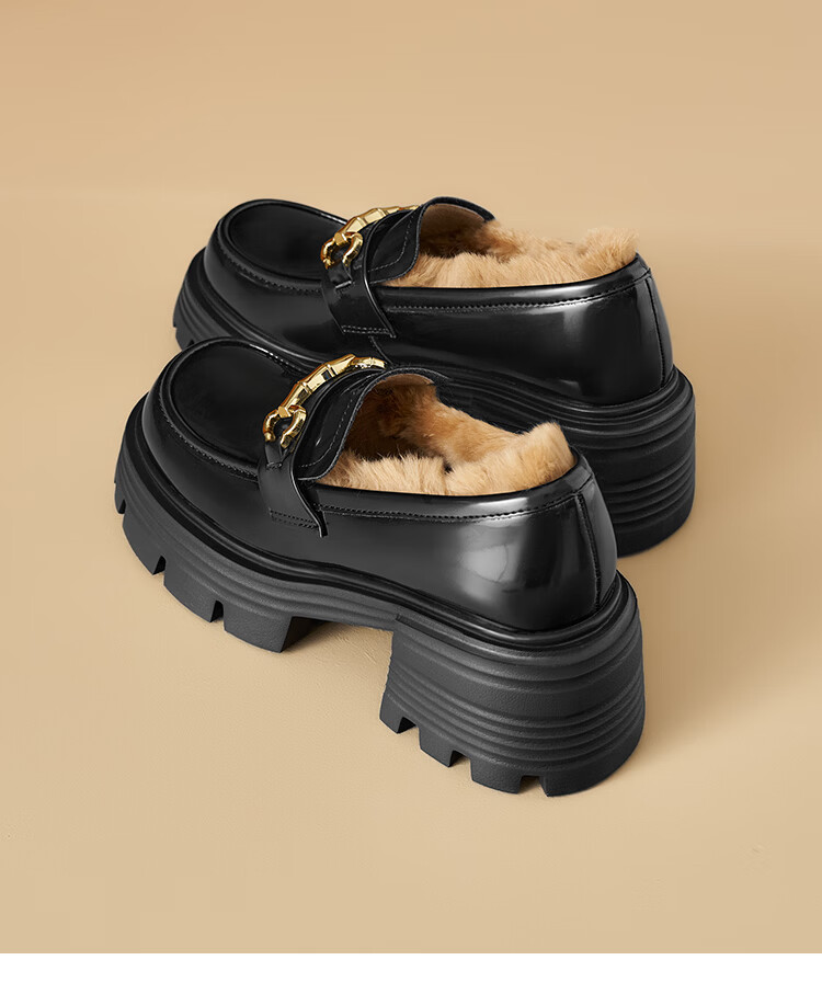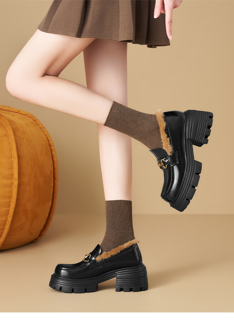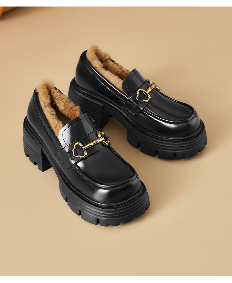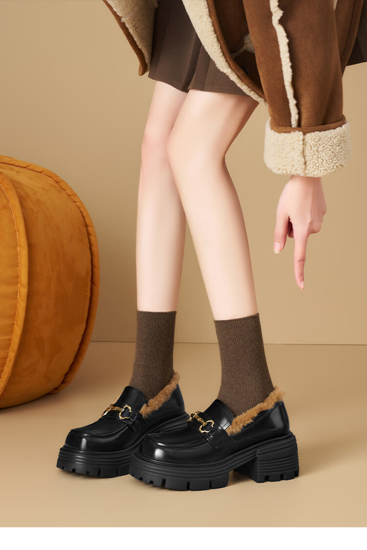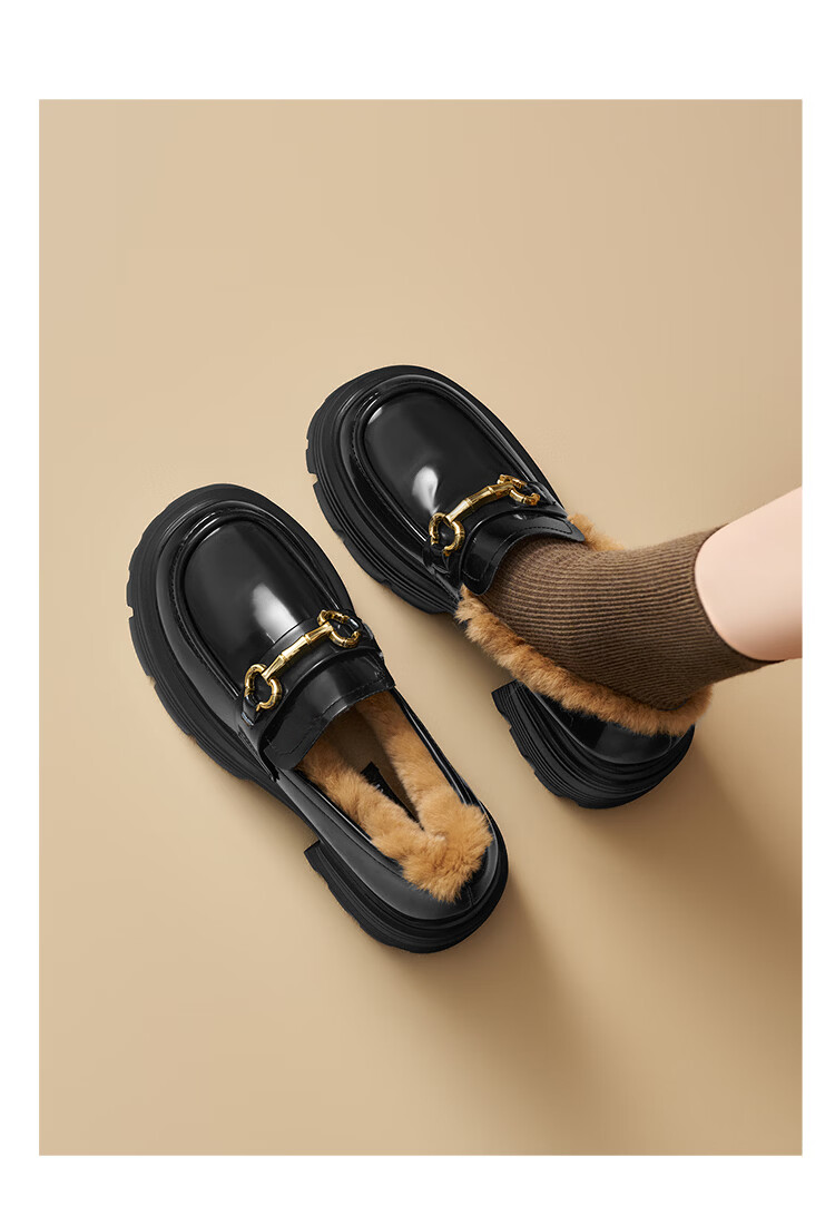 星期六加绒乐福鞋女2025新款冬季加厚保暖黑色小皮鞋厚底增高女鞋 黑色 【复古百搭】 35