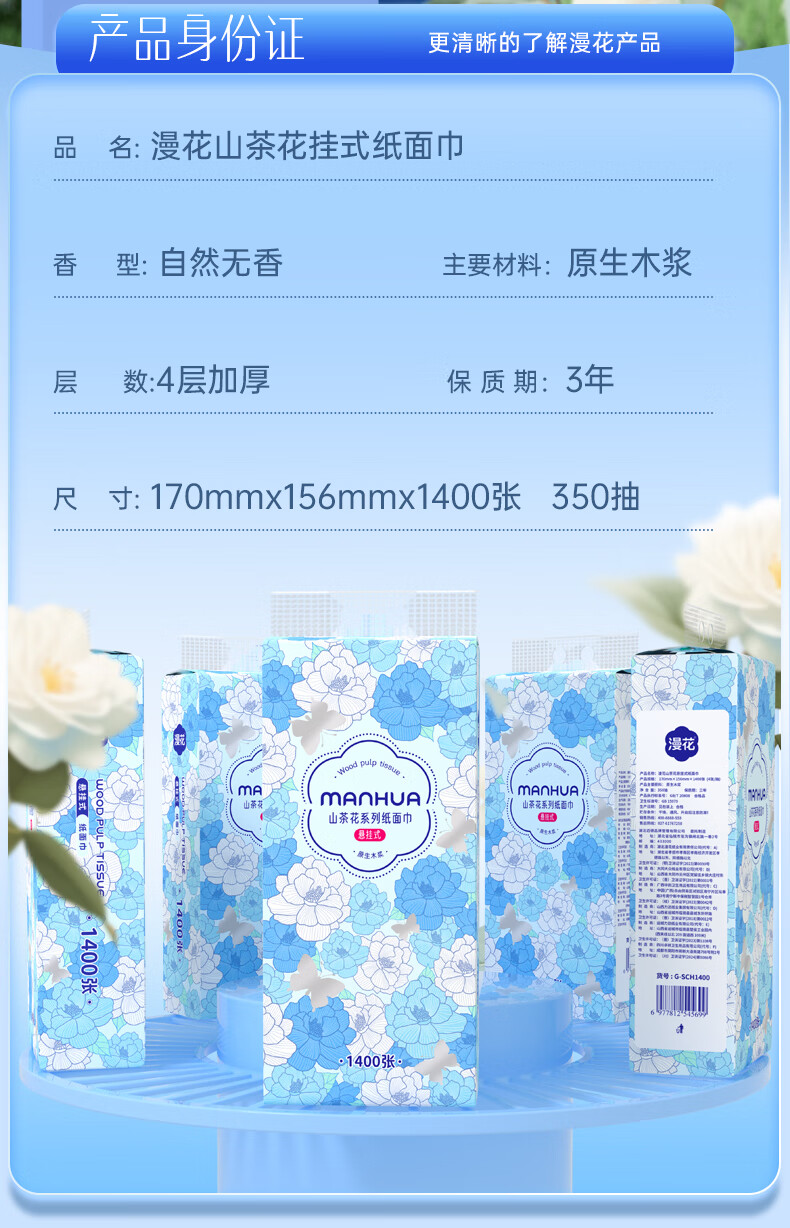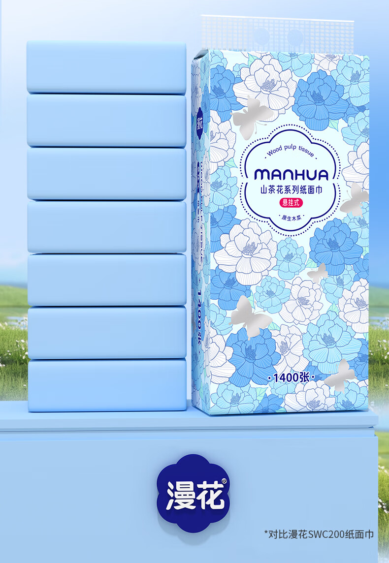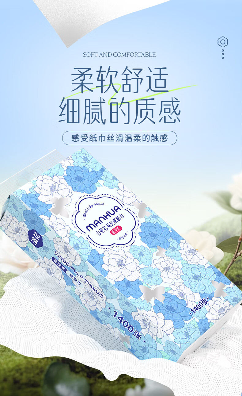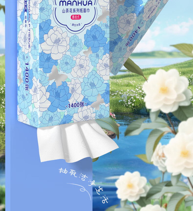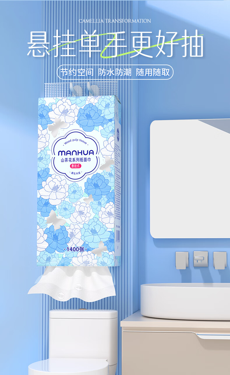 漫花悬挂式抽纸底部抽取式纸面巾4层350抽加量装卫生纸厕纸家用擦手纸 山茶花 4层 1400张*6提