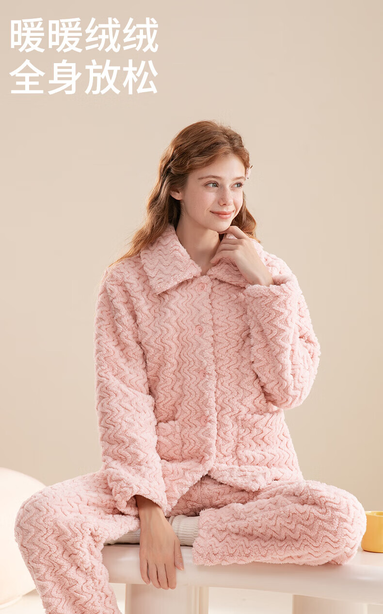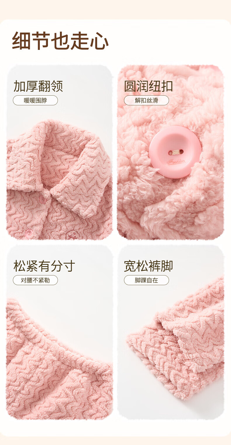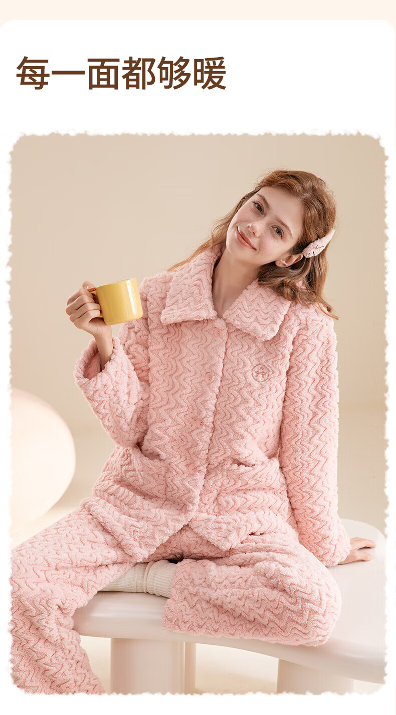 芬腾睡衣女【加厚暖绒】秋冬季少女感保暖翻领开衫长袖家居服套装 虾粉 L