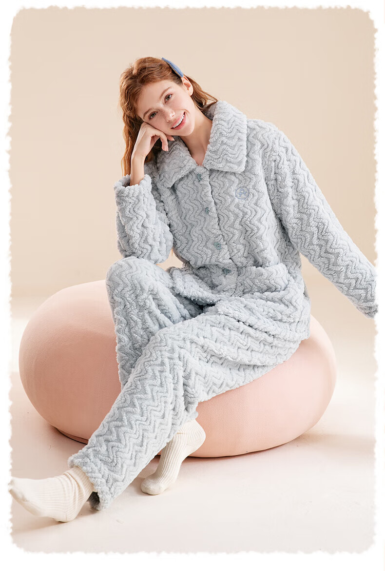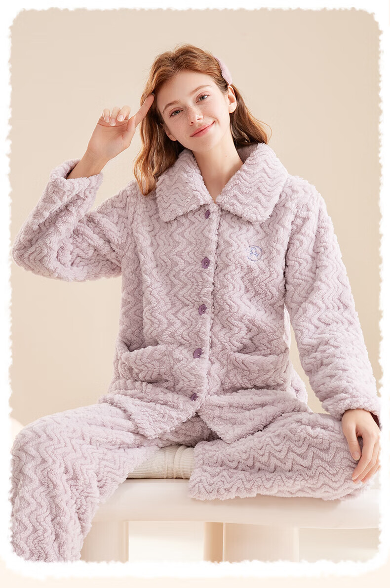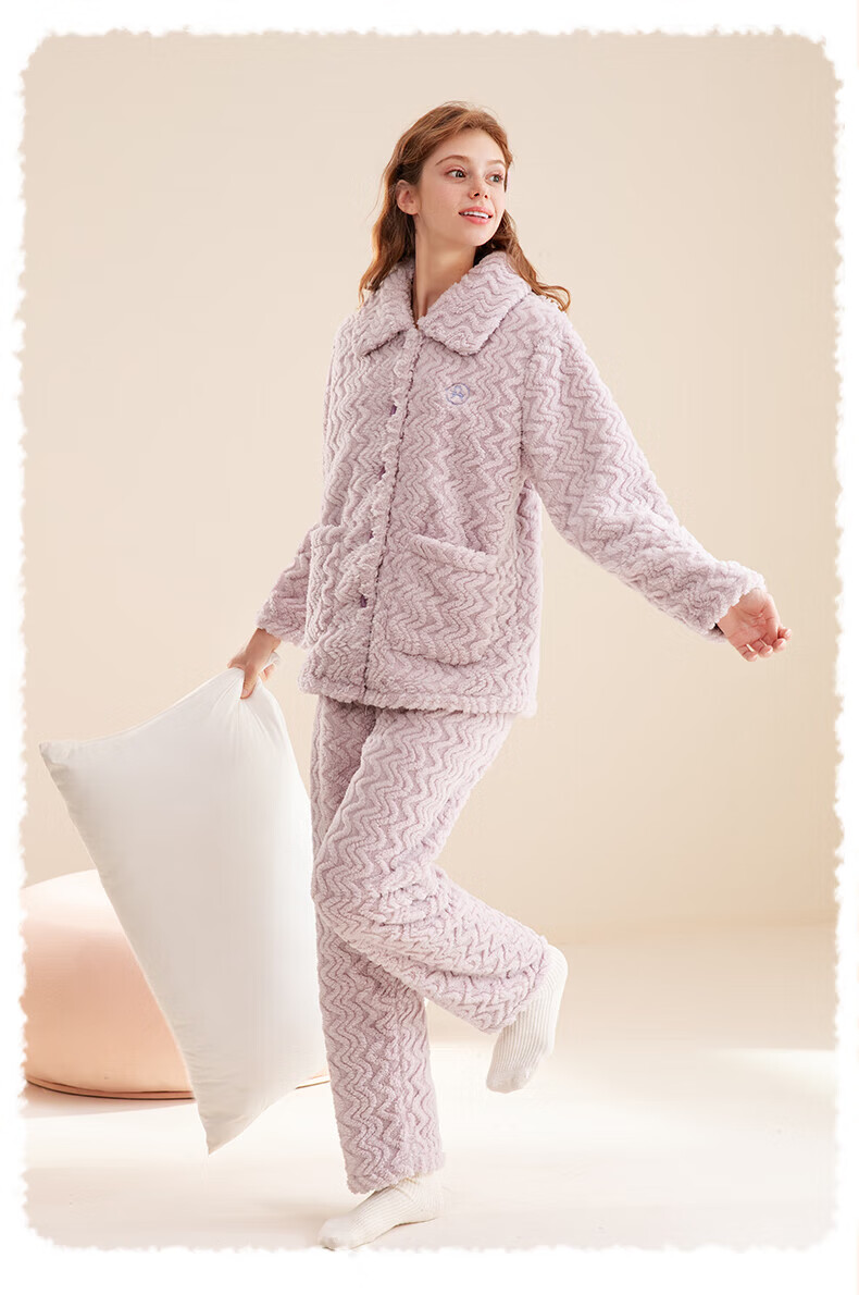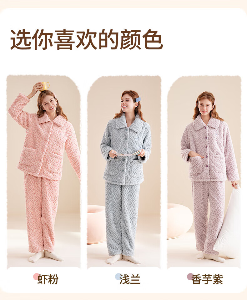 芬腾睡衣女【加厚暖绒】秋冬季少女感保暖翻领开衫长袖家居服套装 虾粉 L