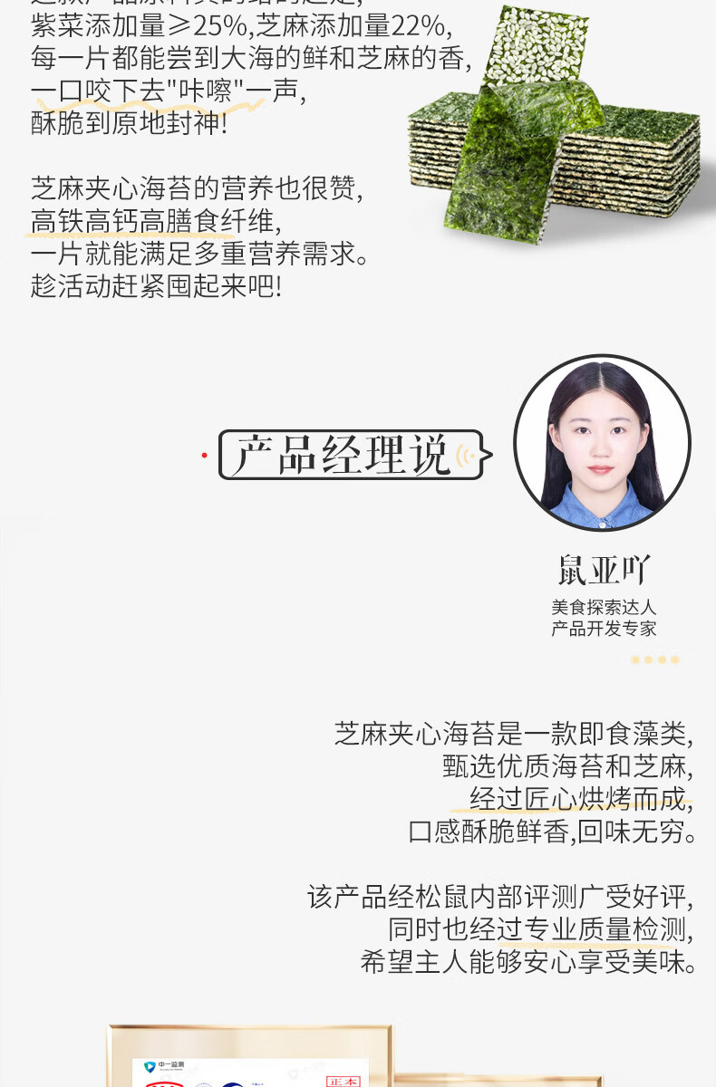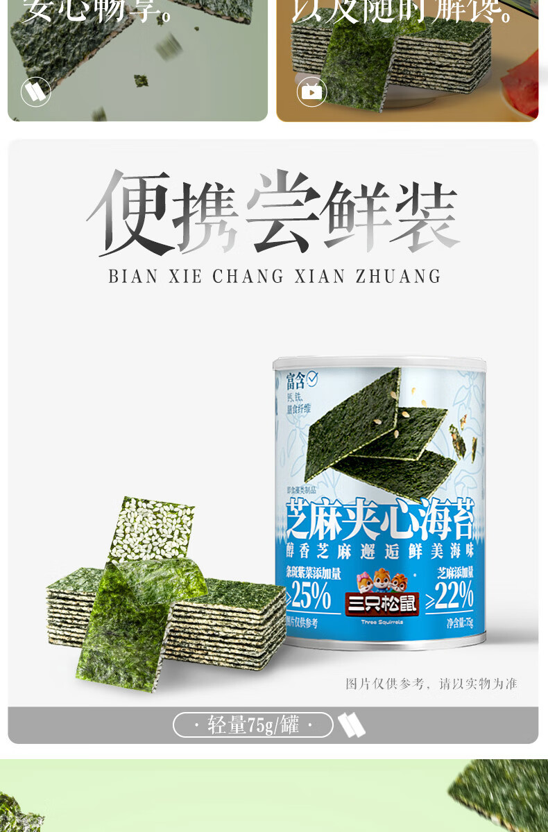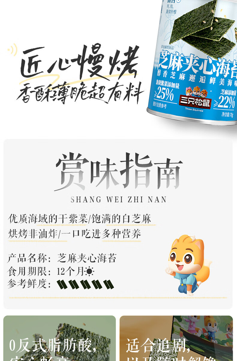 三只松鼠海苔夹心脆芝麻味75g*2 罐装海苔酥脆即食紫菜海味零食解馋儿童