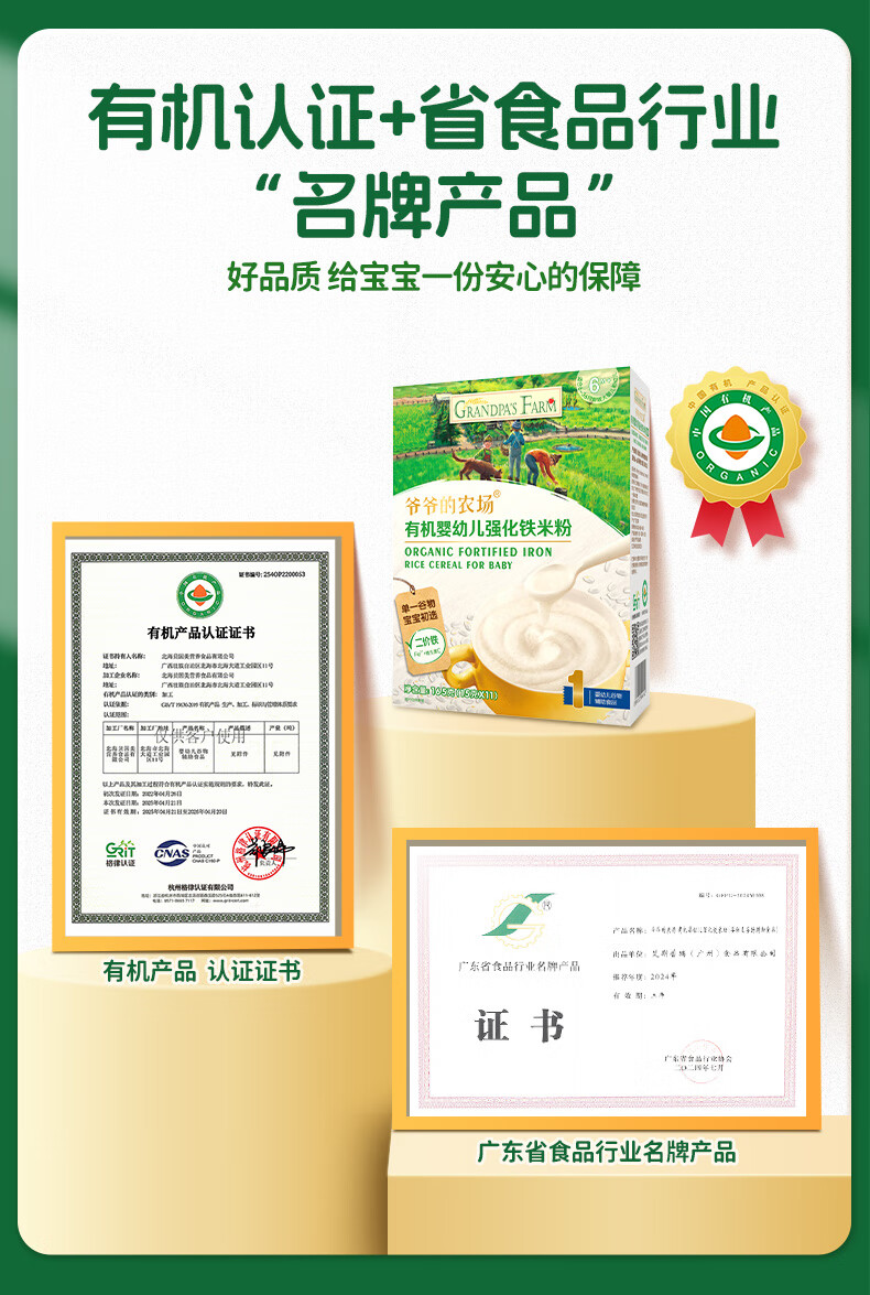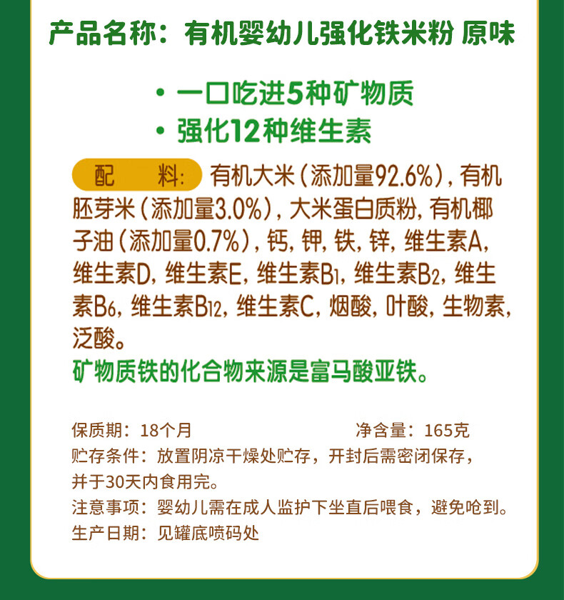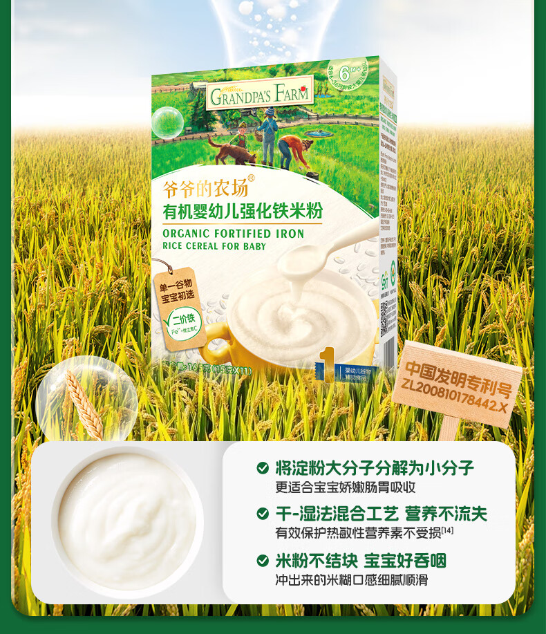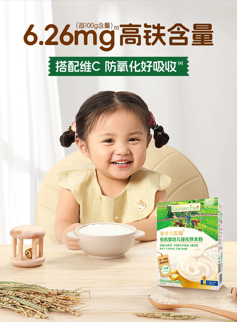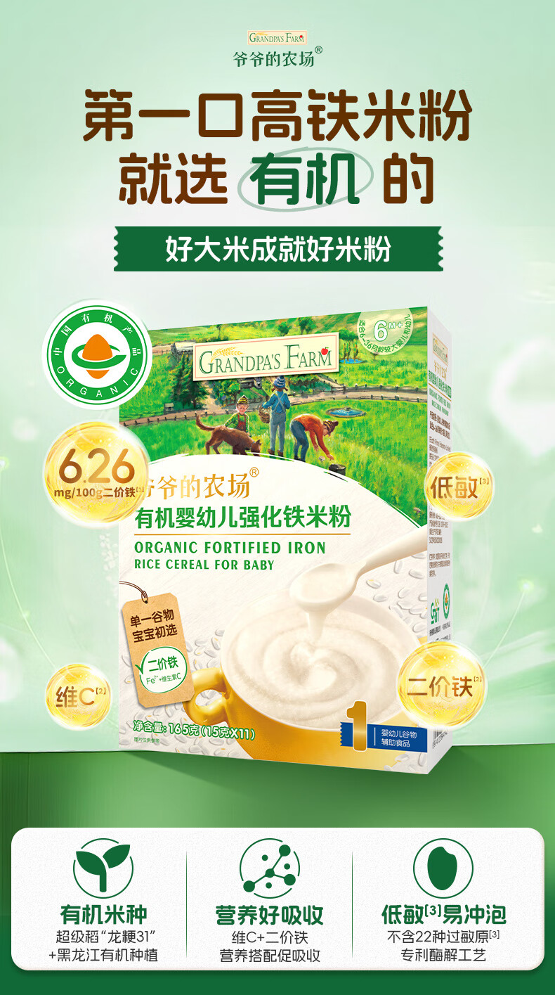 爷爷的农场婴幼儿有机原味高铁米粉6-36个月165g 营养辅食 米糊便携装 6月+