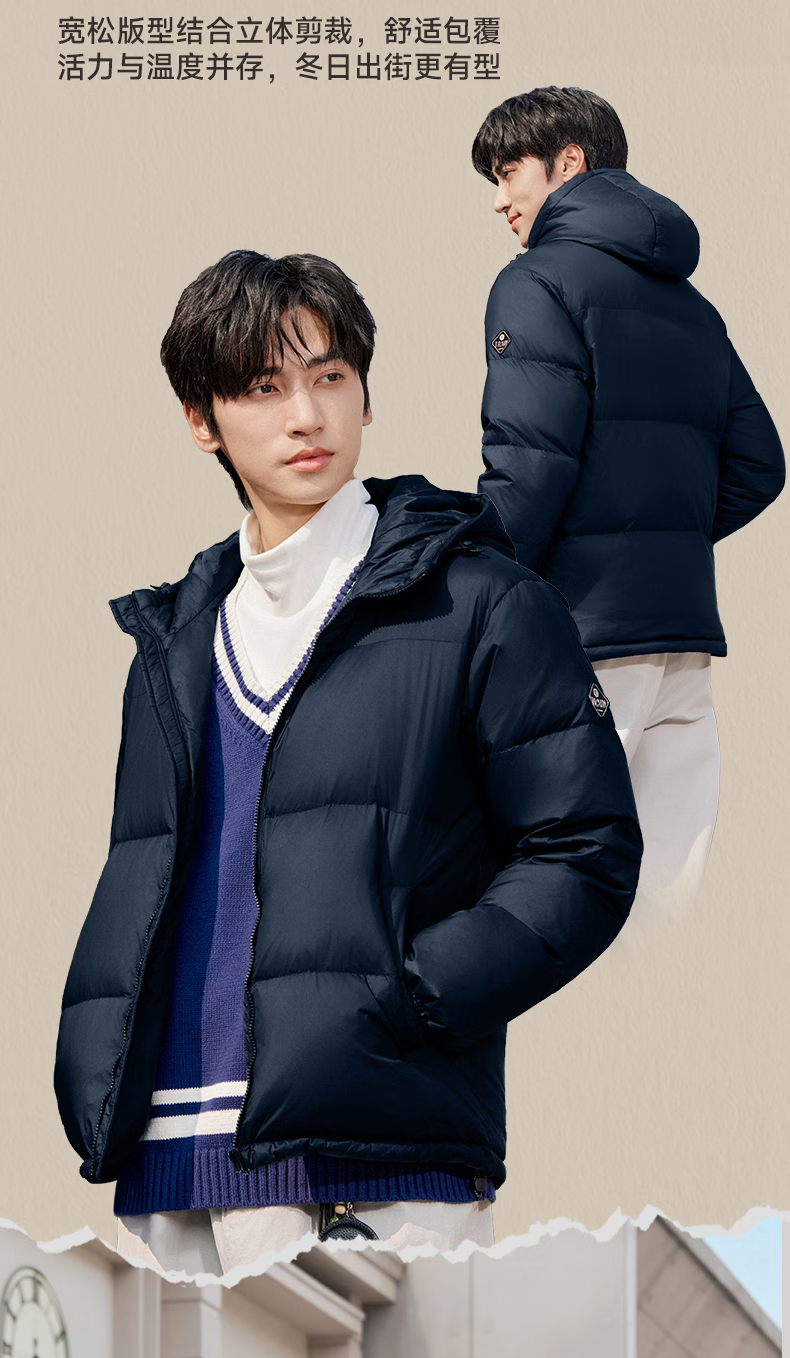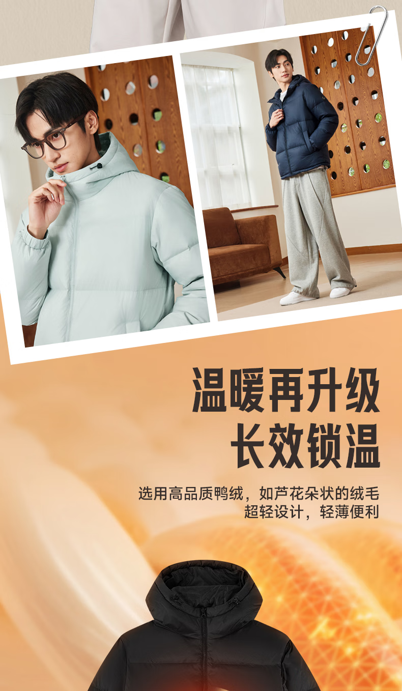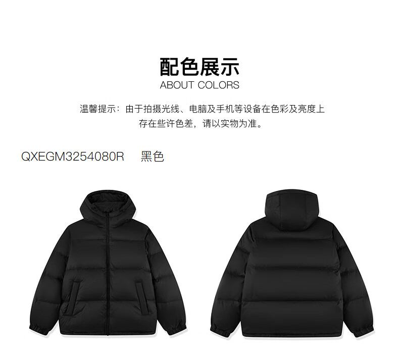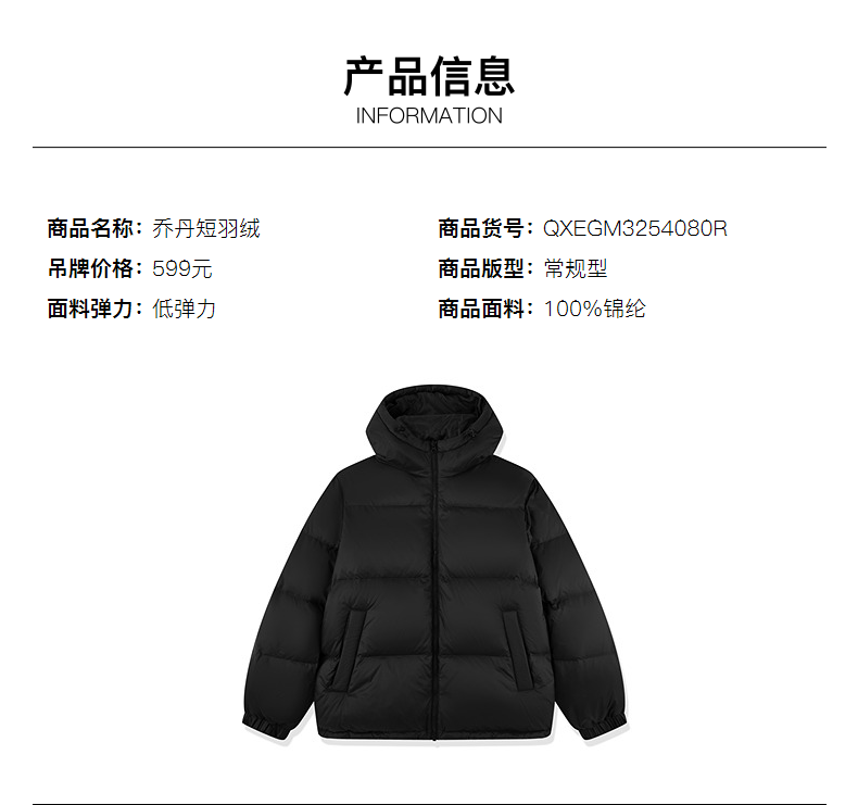 乔丹羽绒服男外套冬季保暖防寒防泼水连帽运动休闲夹克风衣 黑色 L 充绒量148g