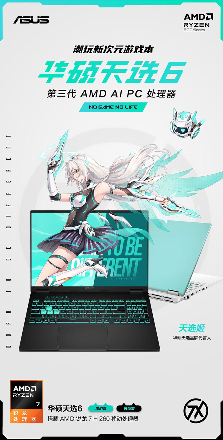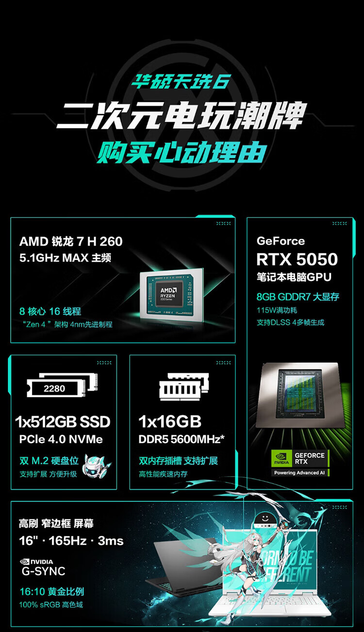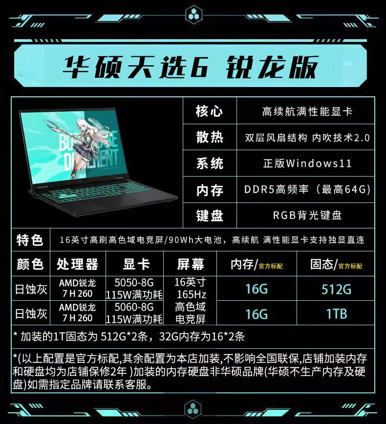 华硕天选6 国家补贴15% 16英寸电竞游戏本 笔记本电脑 锐龙7 H 260 /RTX5060/日蚀灰 16G内存/1T高速固态硬盘 16:10高刷高亮高色域
