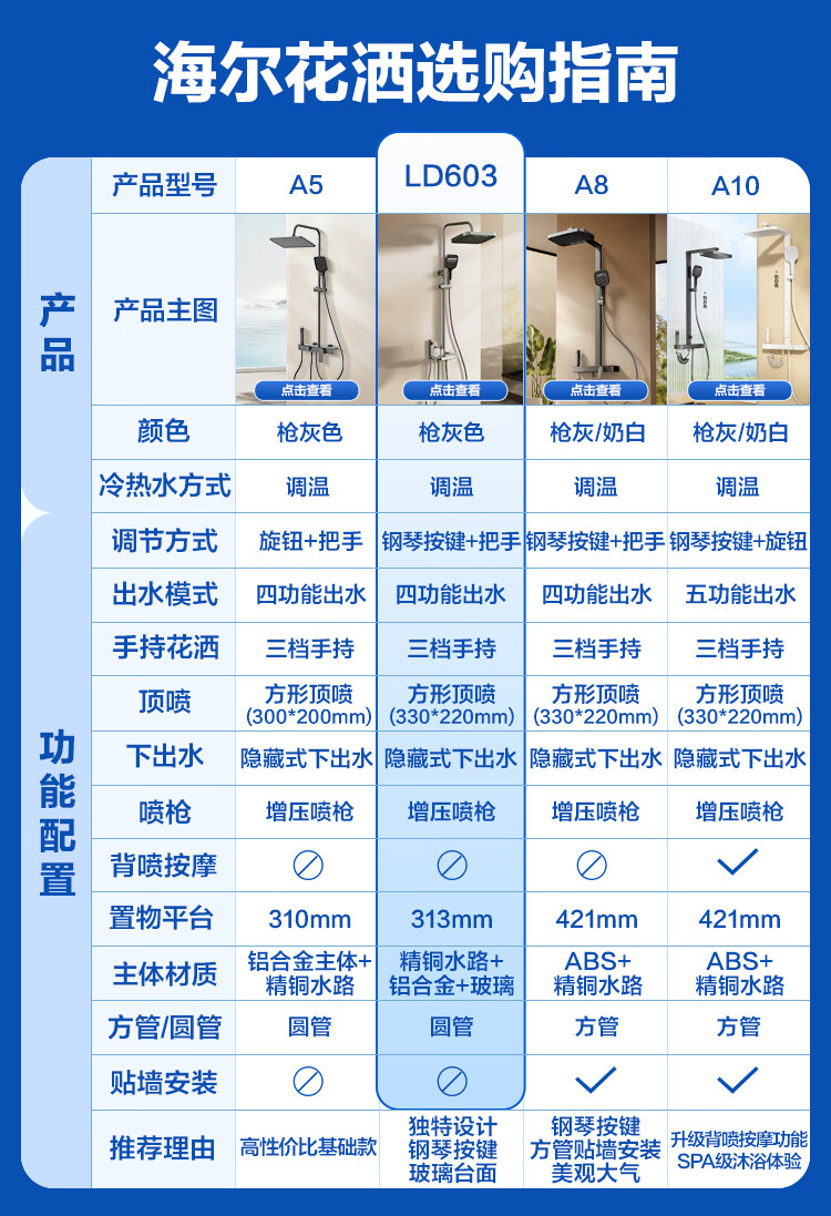 海尔(Haier)淋浴花洒套装 精铜主体 大置物平台 四功能淋浴全套一体式 【琴键升级四功能】L603 【免费安装】