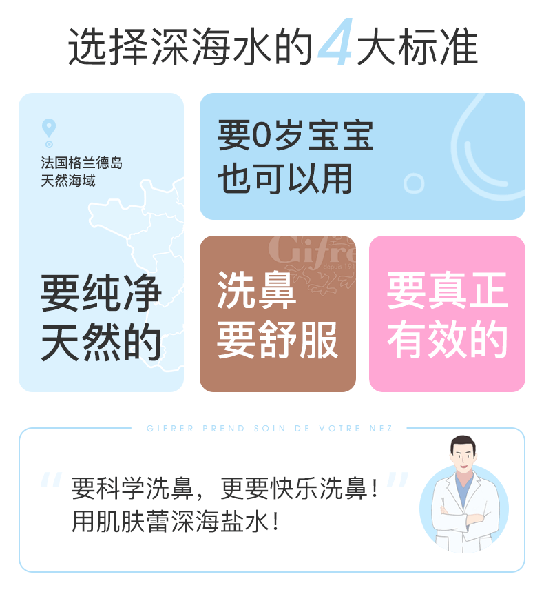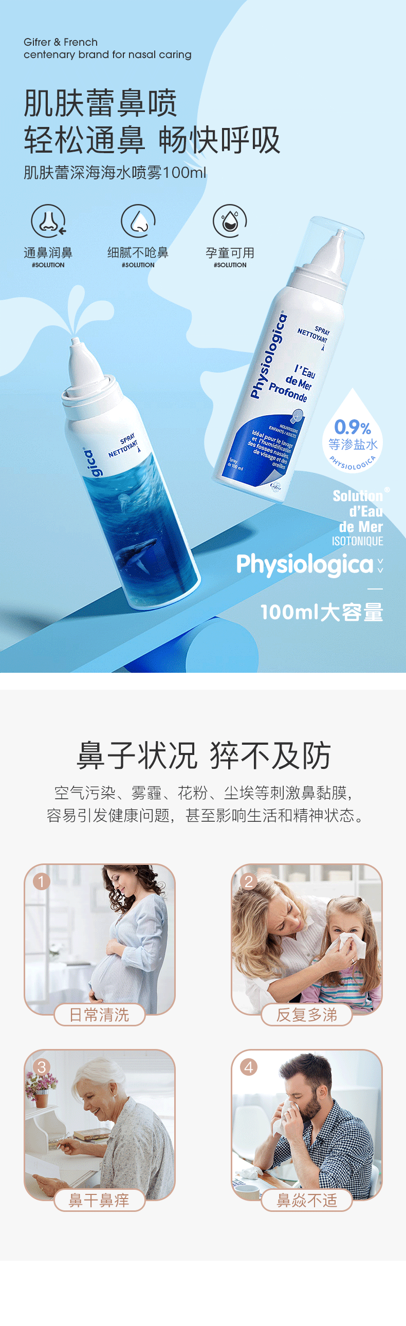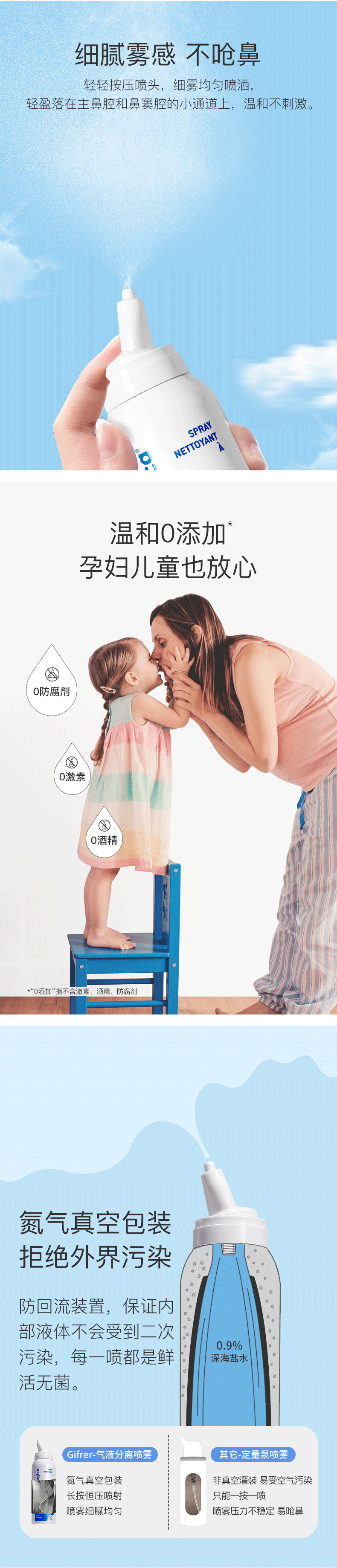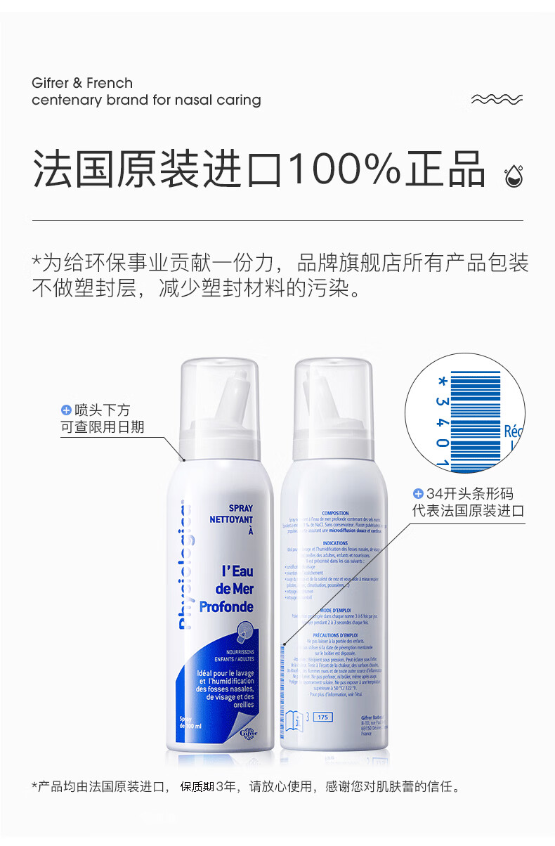 肌肤蕾(gifrer)海盐水喷鼻 婴儿生理盐水洗鼻 儿童鼻塞鼻喷 洗鼻盐水喷雾 100ml