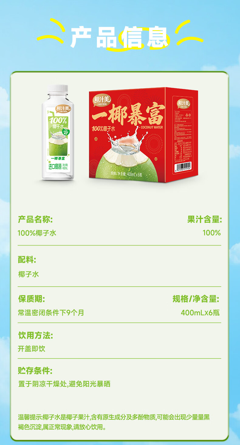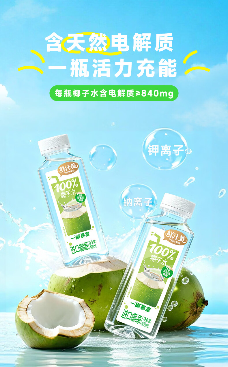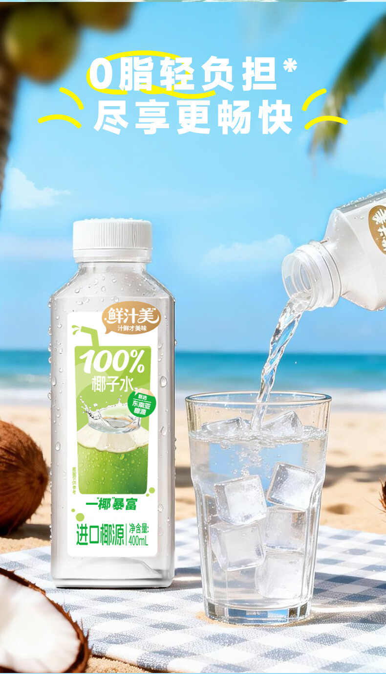 鲜汁美100%椰子水果汁饮料0脂肪天然电解质果蔬汁饮品整箱 100%椰子水400ml*6瓶