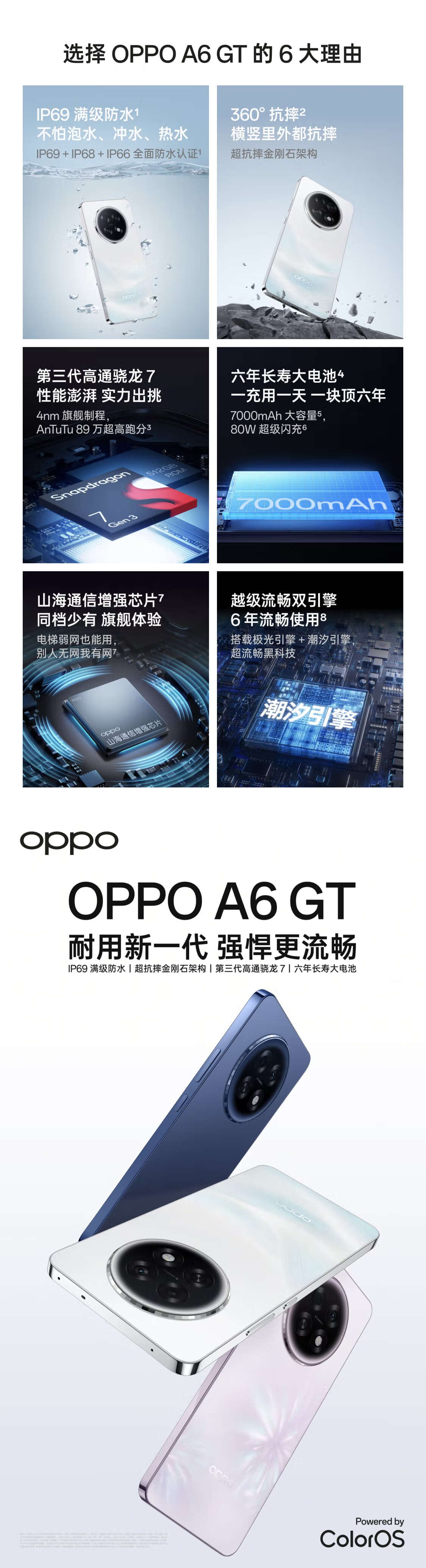 OPPO A6 8GB+256GB 蓝海浮光 IP69防水 大电池长续航 耐用抗摔 5G智能备用手机 自营旗舰店 国家补贴
