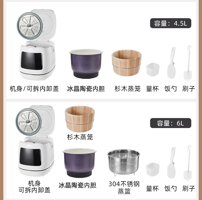 蓓家福低糖电饭煲智能家用蒸煮沥米汤分离蒸木桶饭多功能电饭锅 4.5L 冰晶陶瓷内胆锅+木桶 适合1-7人