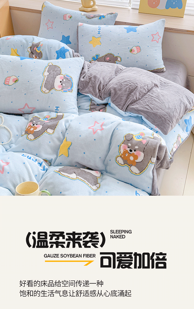 软贝小清新四件套 透气亲肤印花卡通简约田园风被套床单款套件 俏皮小狗 2.0m 床单款 四件套(被套200*230cm)