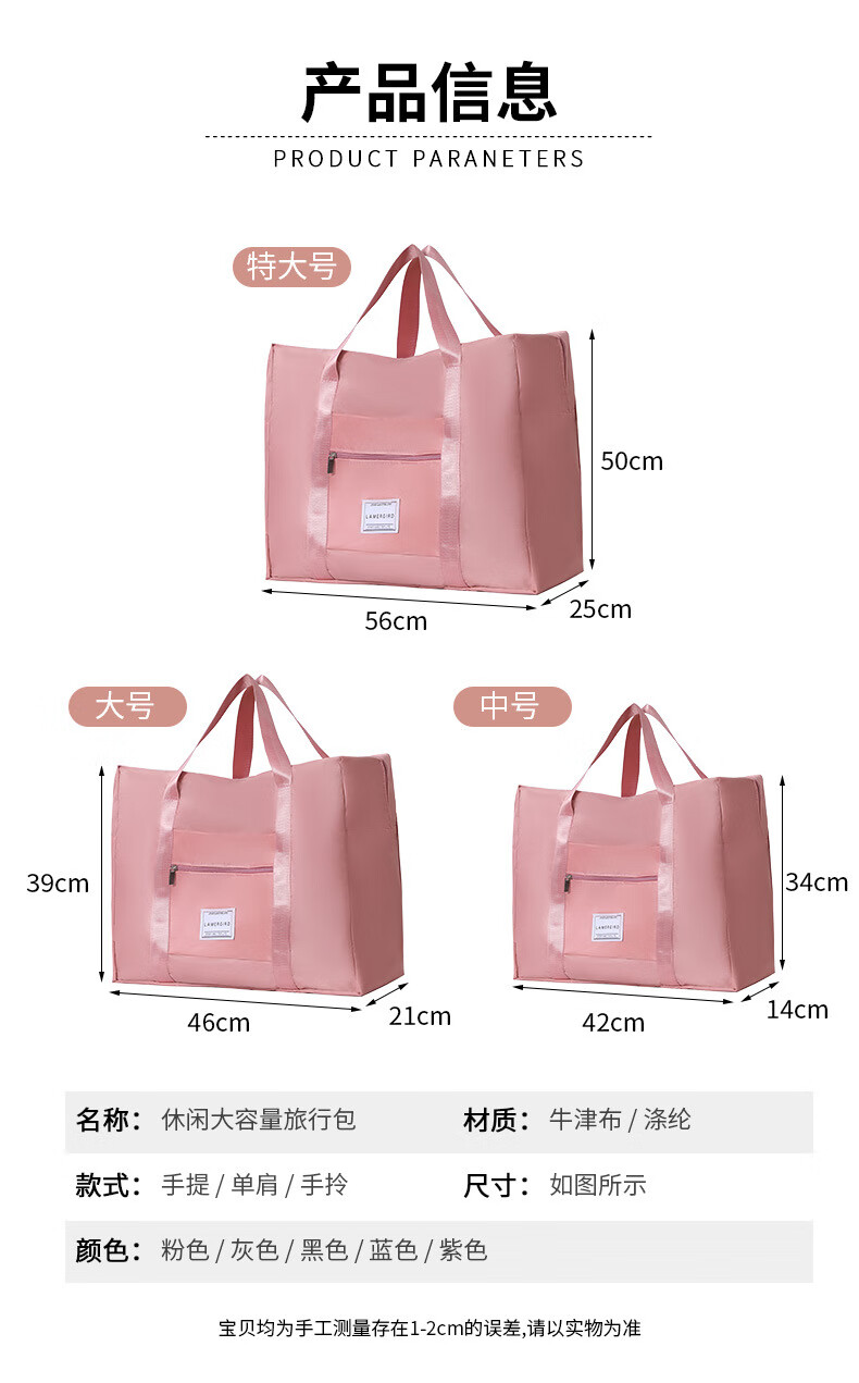 曼月依大容量衣物收纳包短途旅行套拉杆箱出差行李包搬家打包袋加厚防水 粉色 小号 37*30*13cm